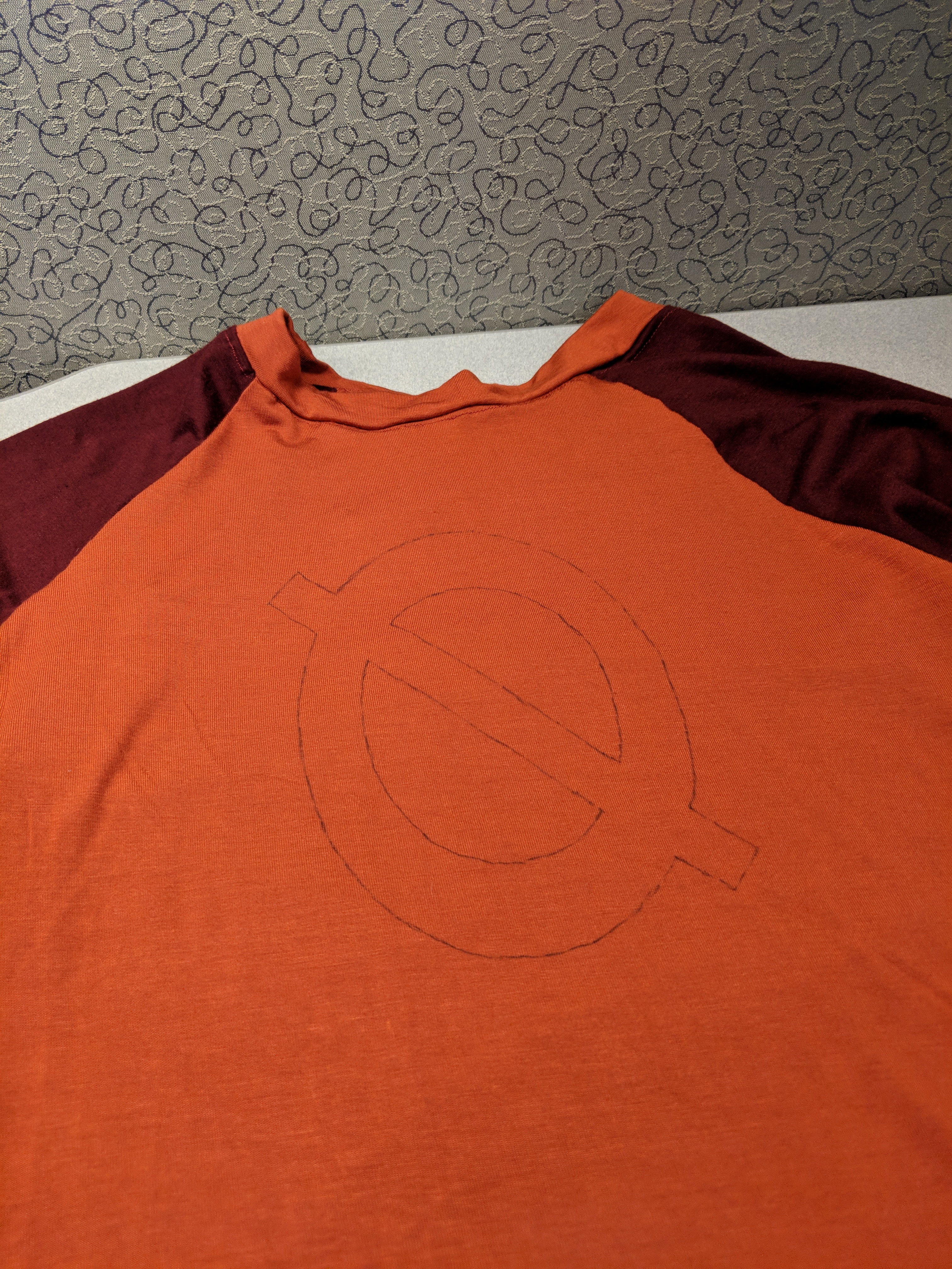 Once the shirt sewing was done, it was time to finish it with the null symbol on the front. Again, using Illustrator, I traced out the symbol, scaled it up to the right size, then printed it on paper. I cut it out to double-check that the size looked right, then printed another one for tracing. At this point, I borrowed my coworkers light box to trace out the null symbol on the front of the shirt with a sewing marker. Another way to do this if you don’t have access to a lightbox is to tape the pattern and shirt up to a window and trace it that way. If you’re using this method, it actually might be easier to add the null symbol onto the fabric first before stitching it all together. Food for thought.
