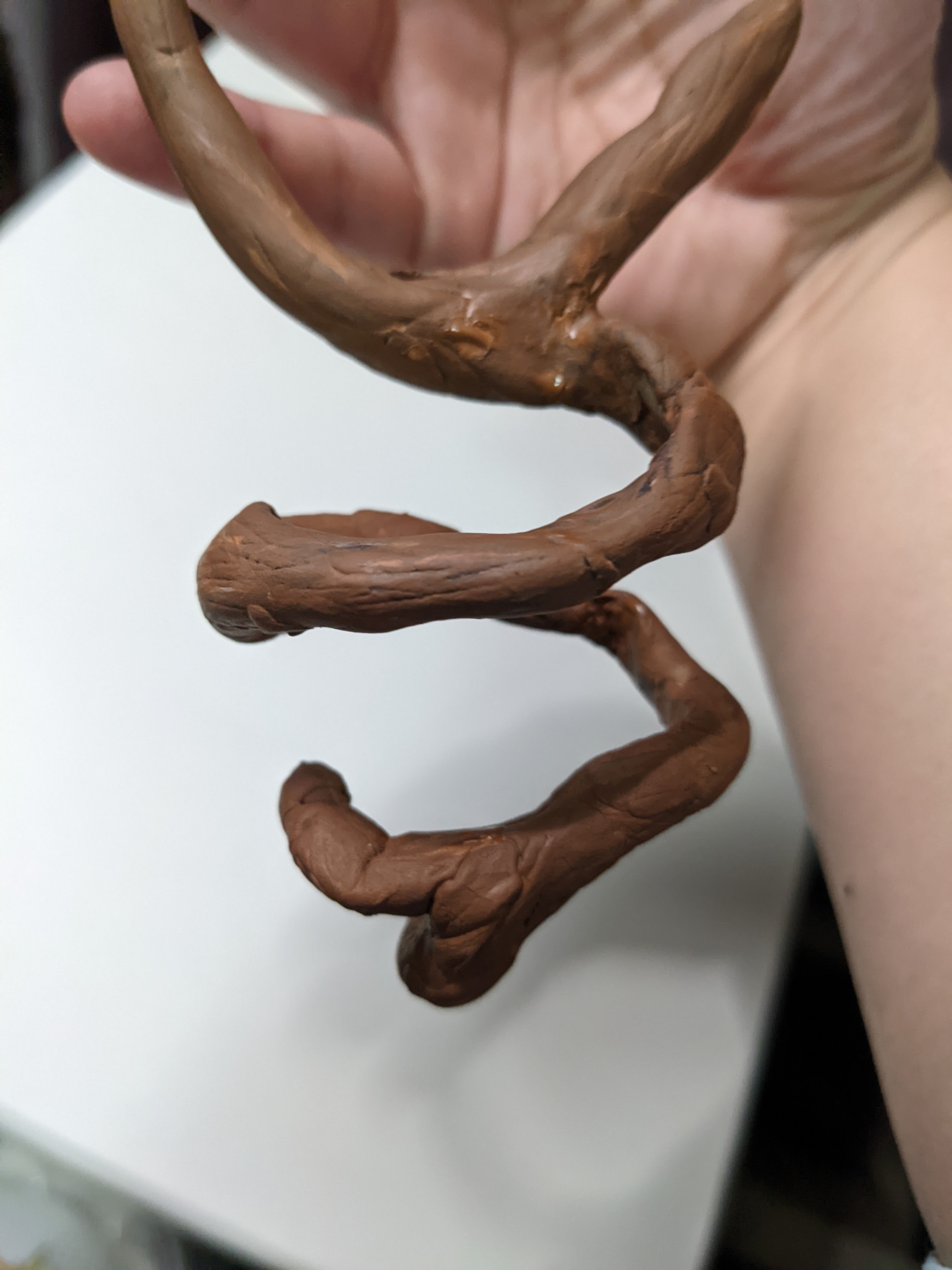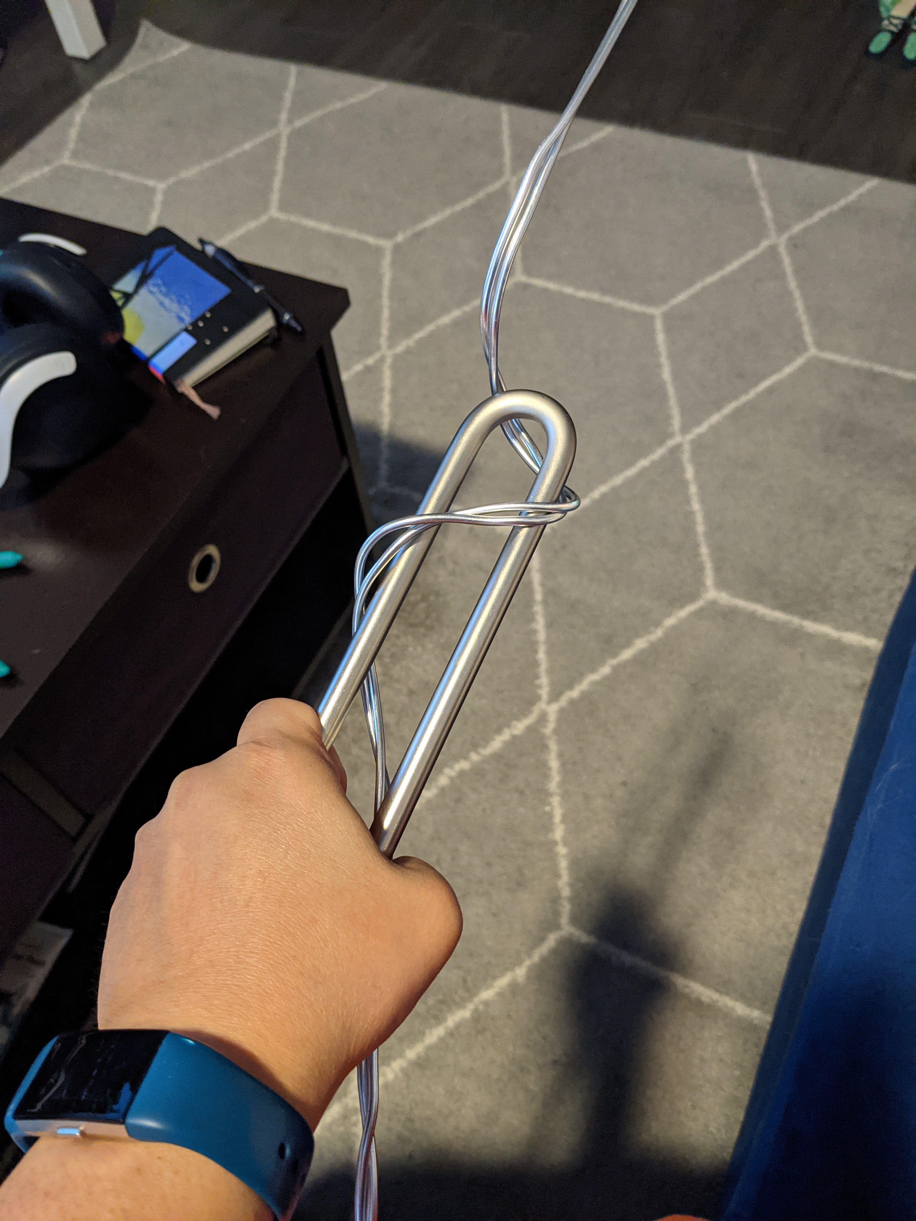 The base of the staff is aluminum wire, 8mm guage. I cut out two very long pieces and then wrapped them around each other. Then, referencing the in-game model, started to bend the wire to match the spiral shape of Kena’s staff. To help with that, I used a metal paper towel holder to help shape the wire and bend around it.