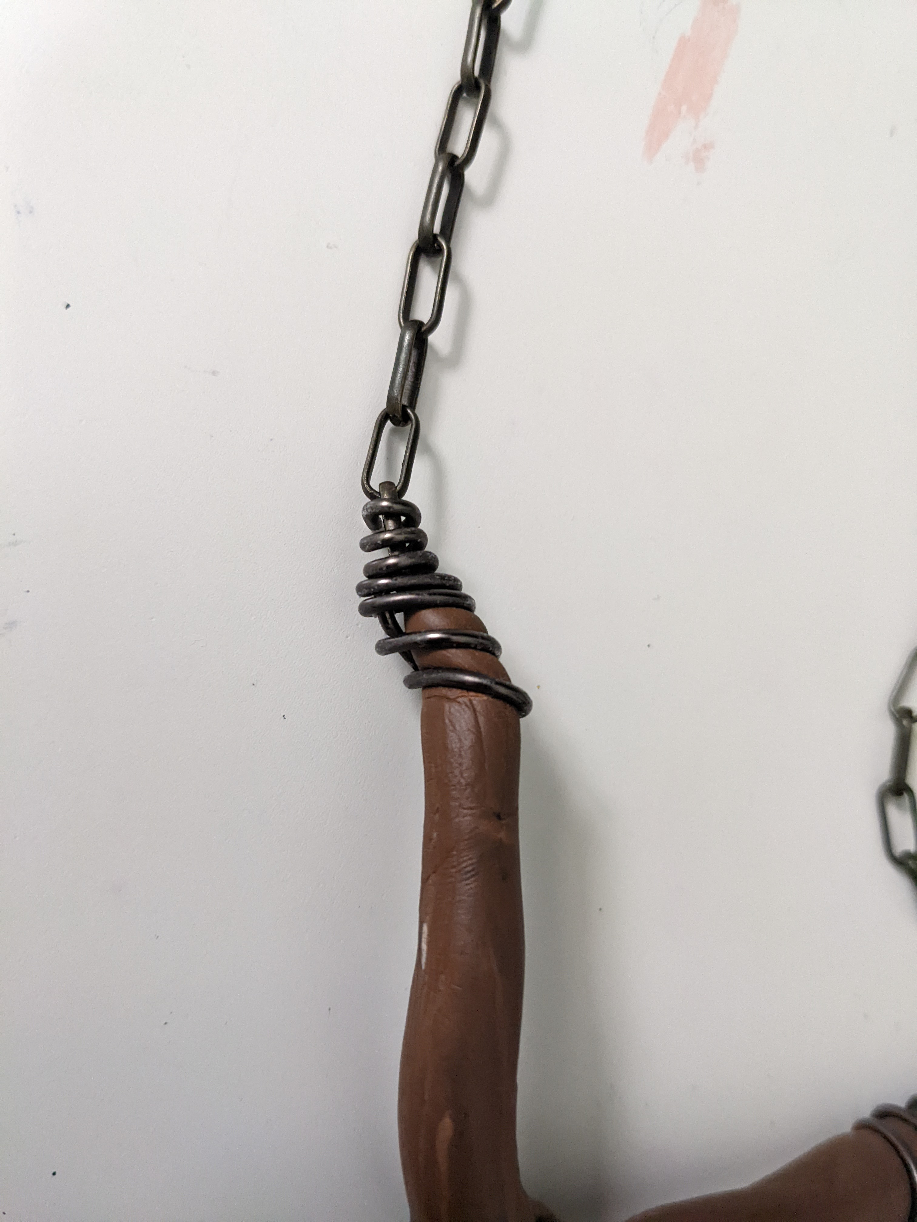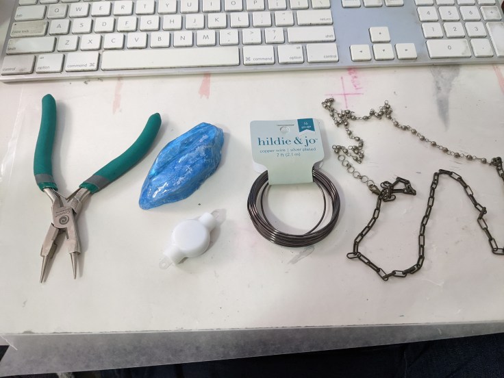 To attach the large piece to the necklace chain, I cut off the middle chain link of the necklace using wire cutters. This left me with two open ends of the necklace, I then used the exposed wire on the wooden pieces to loop through each of the chain ends and then back on itself, around the ends of the “wood.” I used another piece of wire to add more loops to fully cover the wood ends. (It helped to loop the wire first around a pen of the same width as the wood and then slide it on, as opposed to looping it around the foam.) To finish the wire ends, I sanded them down a bit with a nailer filer and then covered the ends in a small dab of superglue, so that they wouldn’t be too sharp or catch on any fabric.