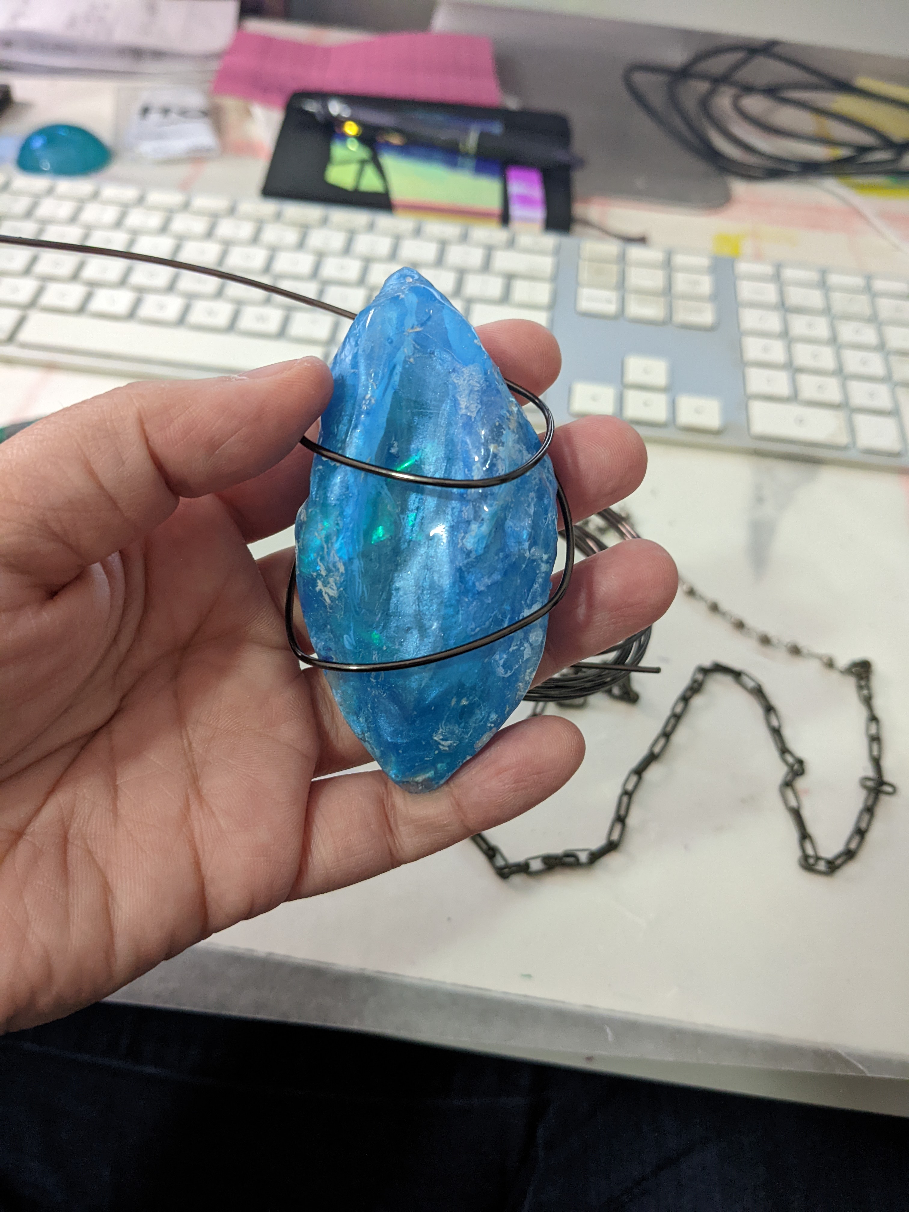 Once I received the crystal and pack of small LED lights, I was able to start putting the necklace together. First step was using two lengths of 16 gauge copper wire to wrap around the crystal. You can see in the reference images that the wooden part branches off into two pieces, so I used two pieces of wire. I wrapped them around each other to create one thicker wire, leaving the ends separated. Then, matching the reference photos, I wrapped them around the crystal, leaving room for the LED light. I cut the wires with a lot of extra length on the ends, knowing I would need the extra length for both the wooden twig details and to serve as the connection to the necklace chain.