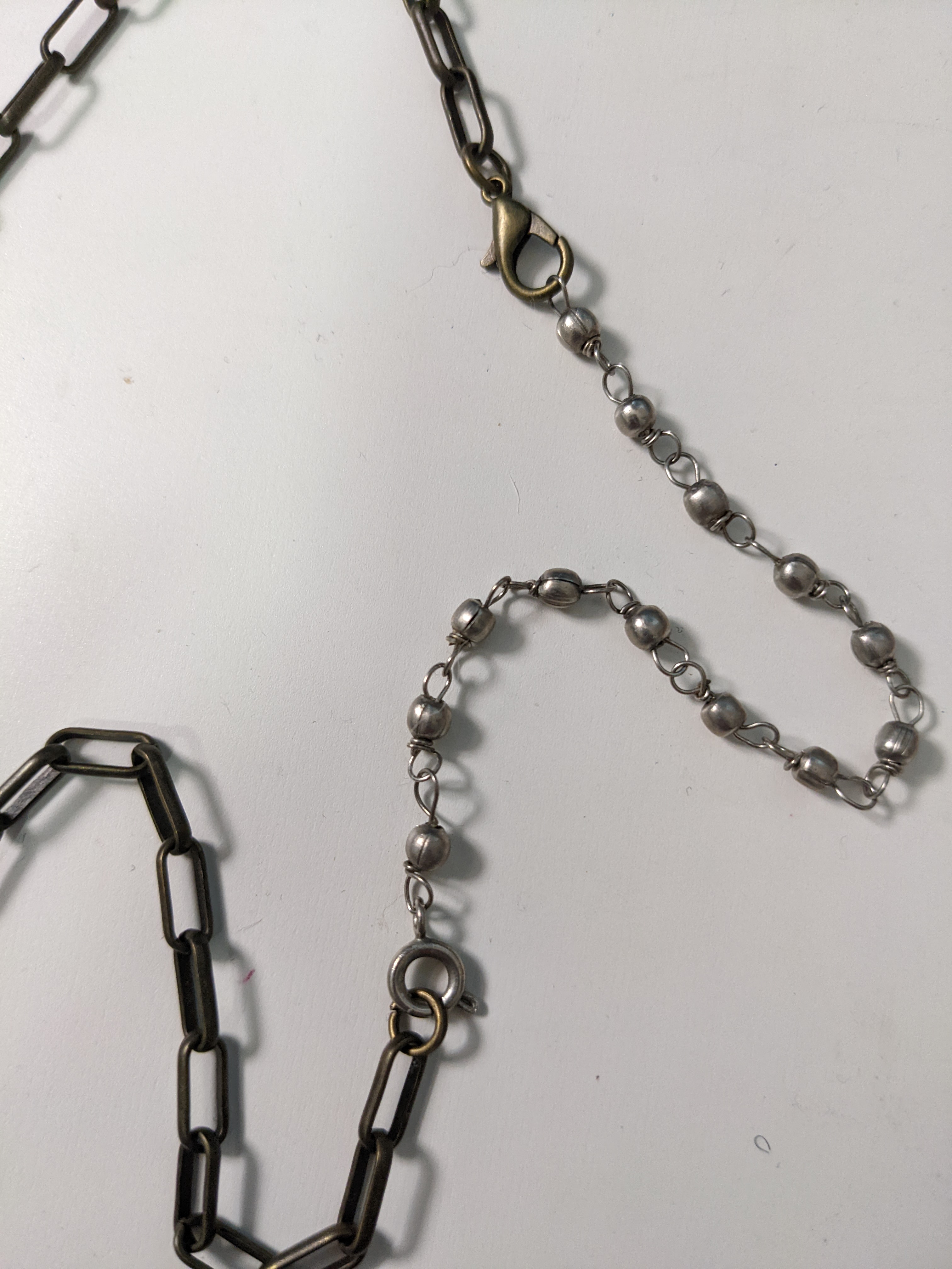 Once that was done, I made sure the full necklace was the right length. The necklace chain by itself wasn’t quite long enough, so I used a chain I had in my stash to give it some more length. This chain doesn’t match exactly, but this portion of the necklace would be hidden by the scarf, so I didn’t mind. After using the already made necklace ends to clasp to the extra chain, I tried it on and adjusted the length, then cut the excess chain.