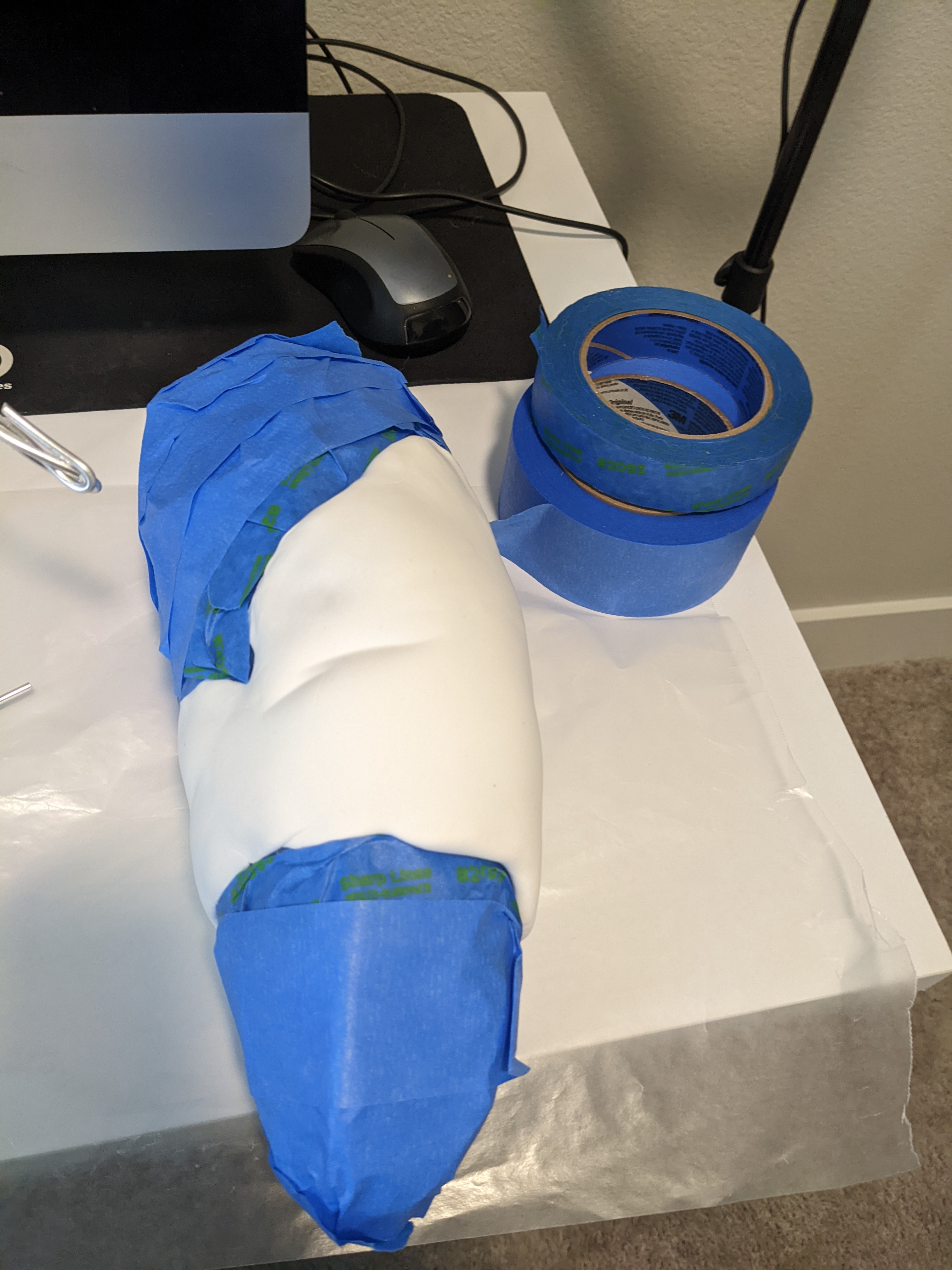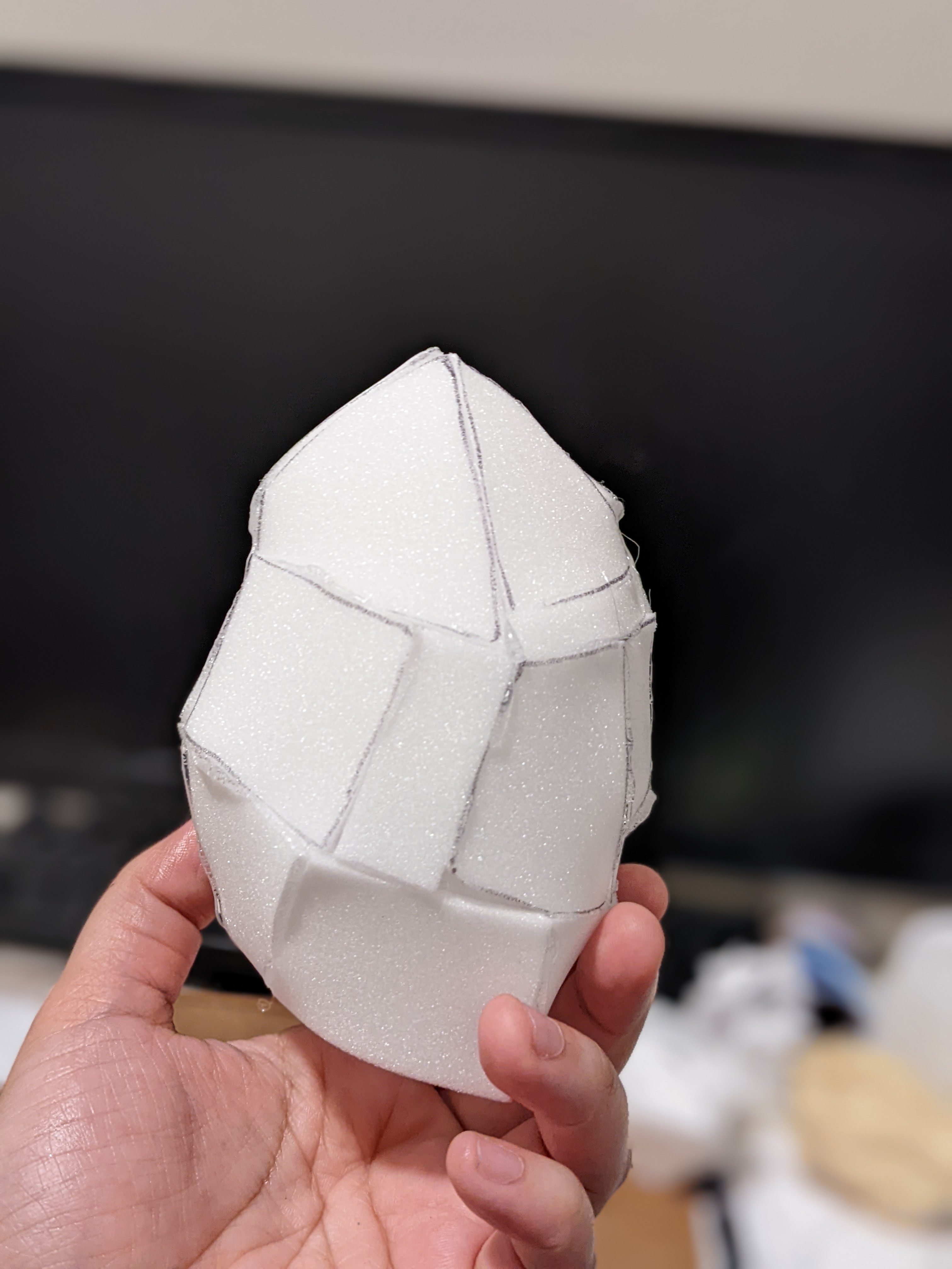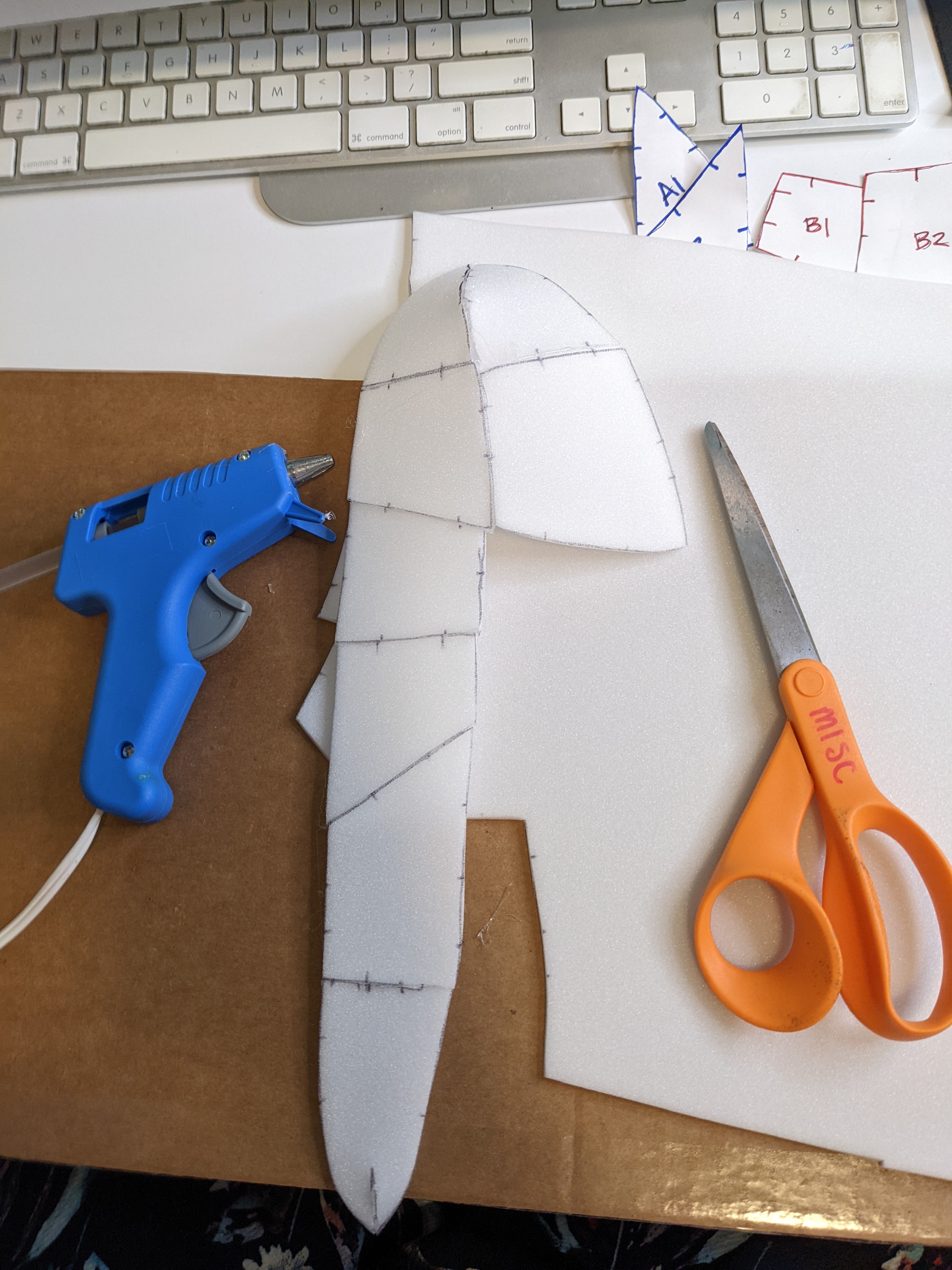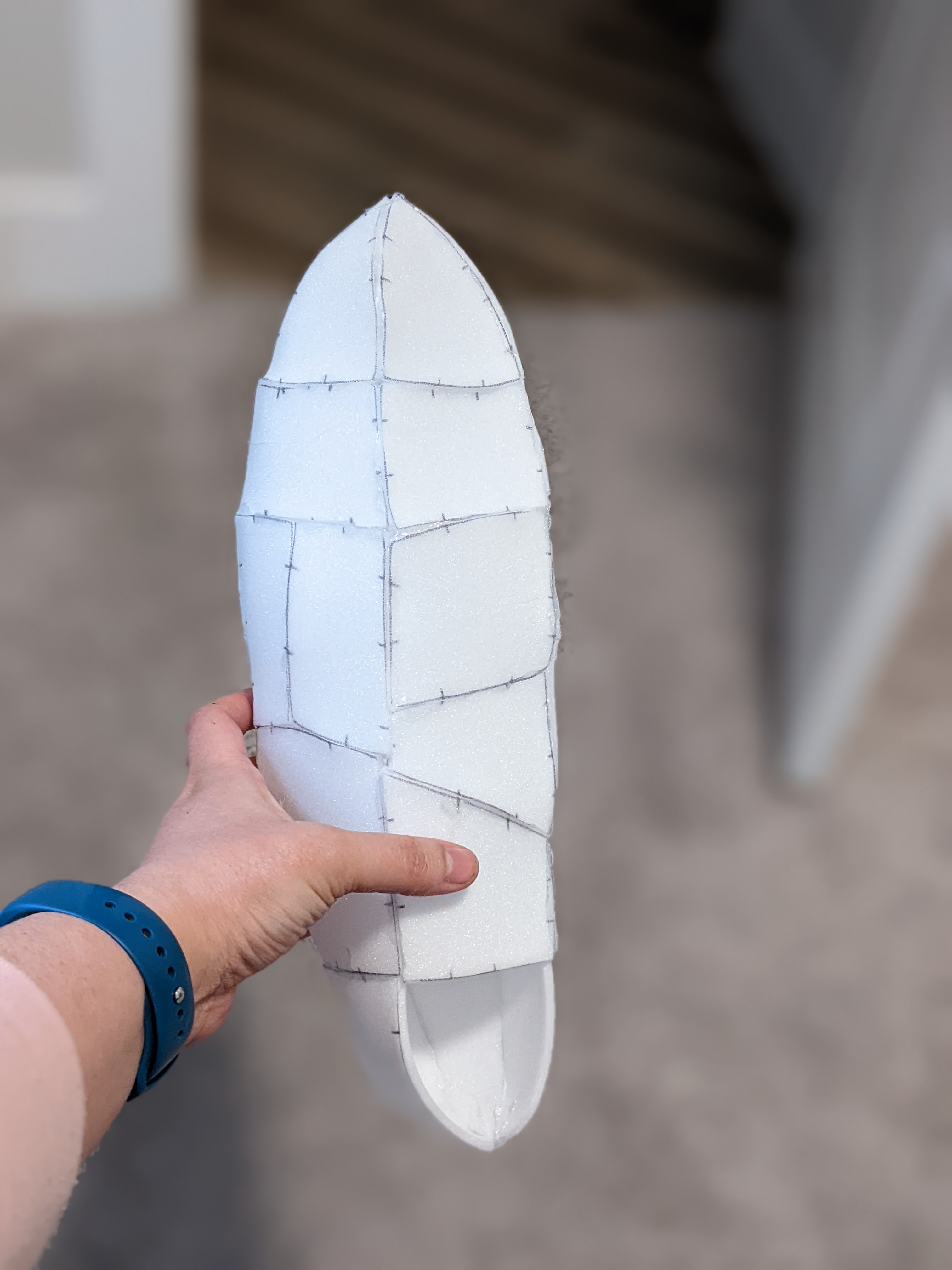Once that was done, I used even more hot glue to cover the entire thing. After this step, I realized I didn’t actually like the size of it, so I took some scissors to it and cut off a few panels. Then, I glued it back together. The size discrepancy is likely because the plastazote itself has some thickness to it (much more than paper), so that adds to the width. Fixing this would mean making the masking tape shape smaller in the future.
