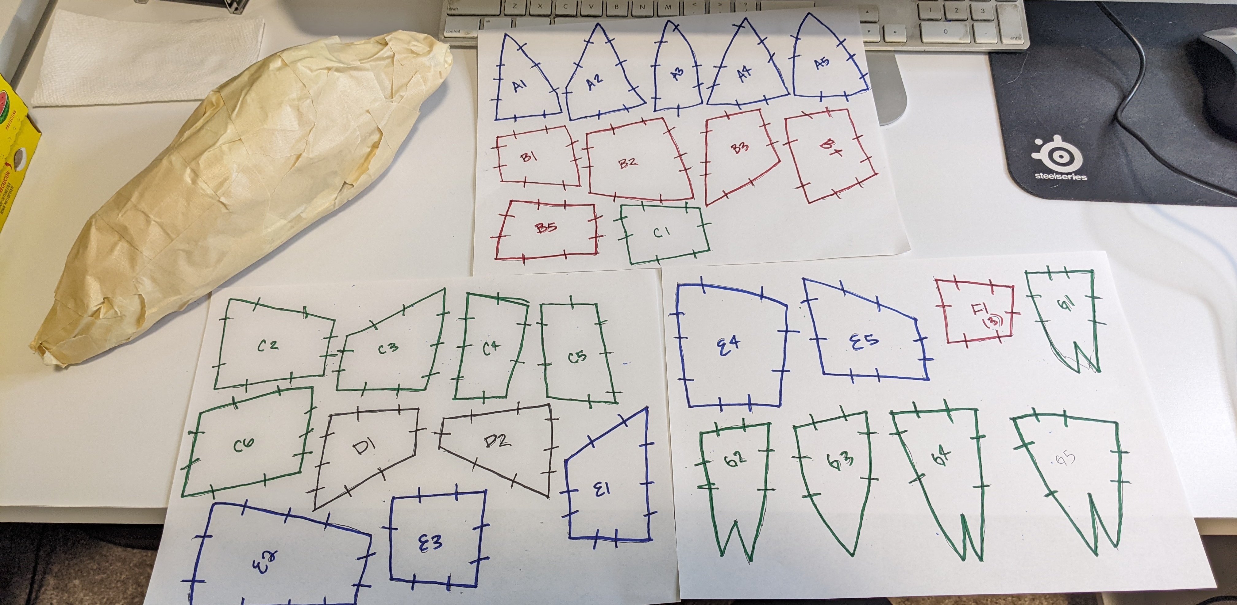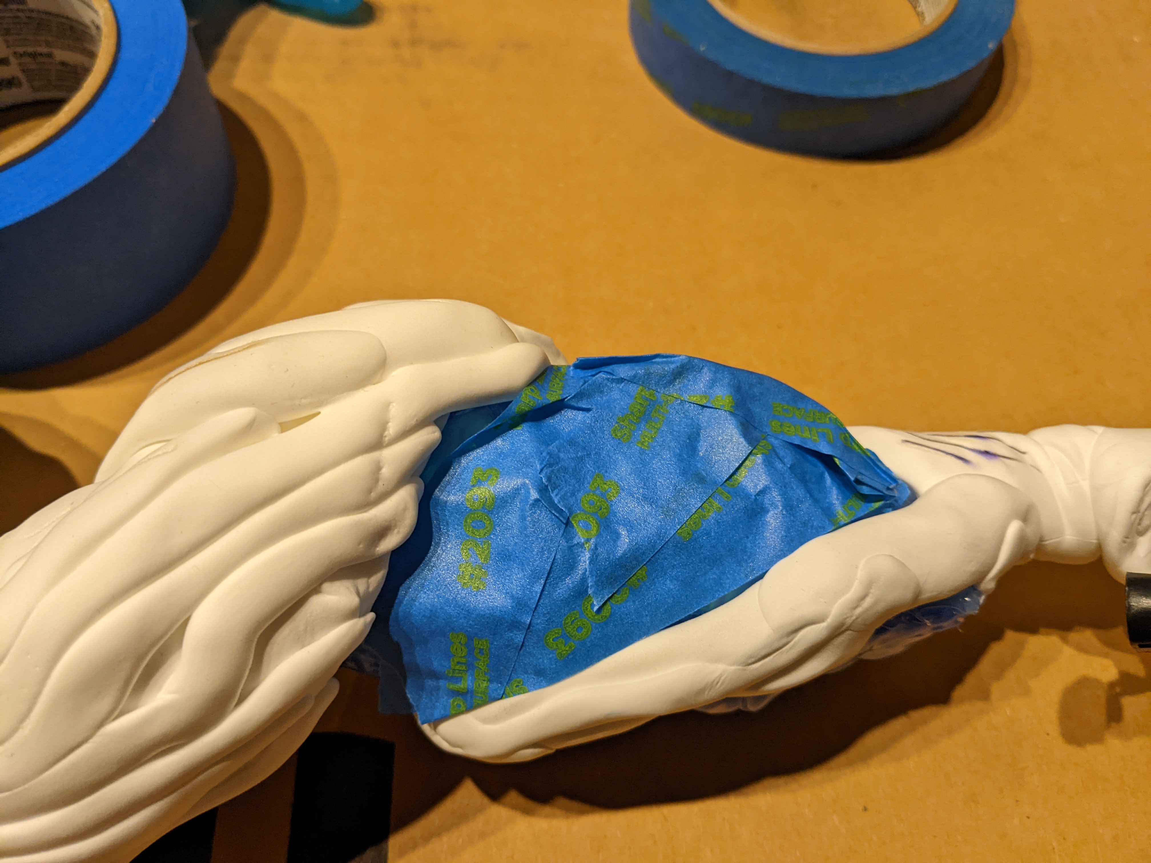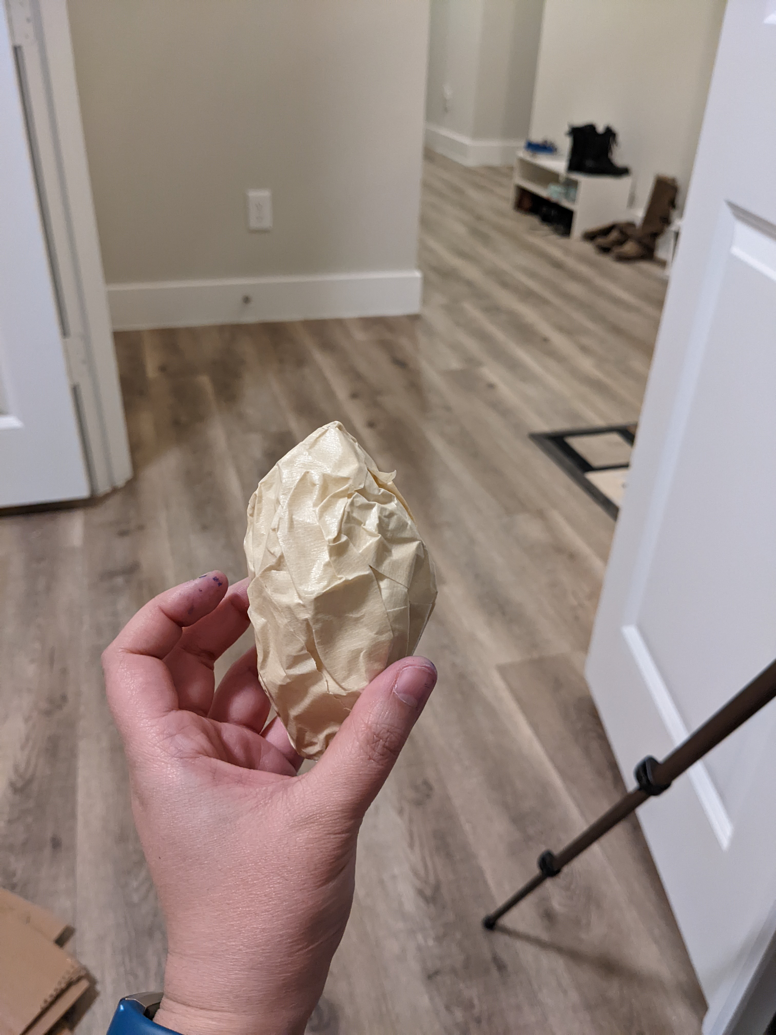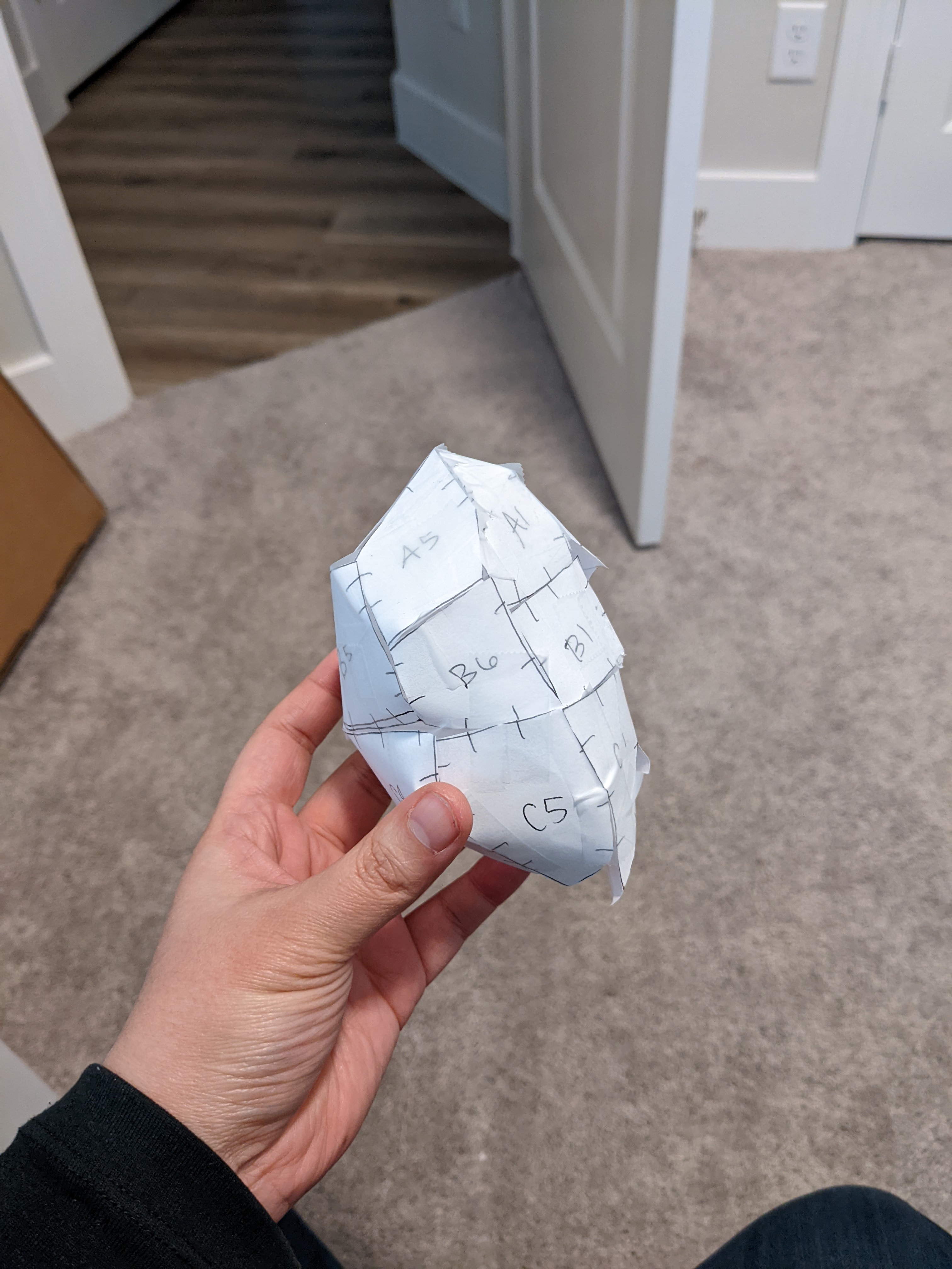 Once that was done, I used even more hot glue to cover the entire thing. After this step, I realized I didn’t actually like the size of it, so I took some scissors to it and cut off a few panels. Then, I glued it back together. The size discrepancy is likely because the plastazote itself has some thickness to it (much more than paper), so that adds to the width. Fixing this would mean making the masking tape shape smaller in the future.