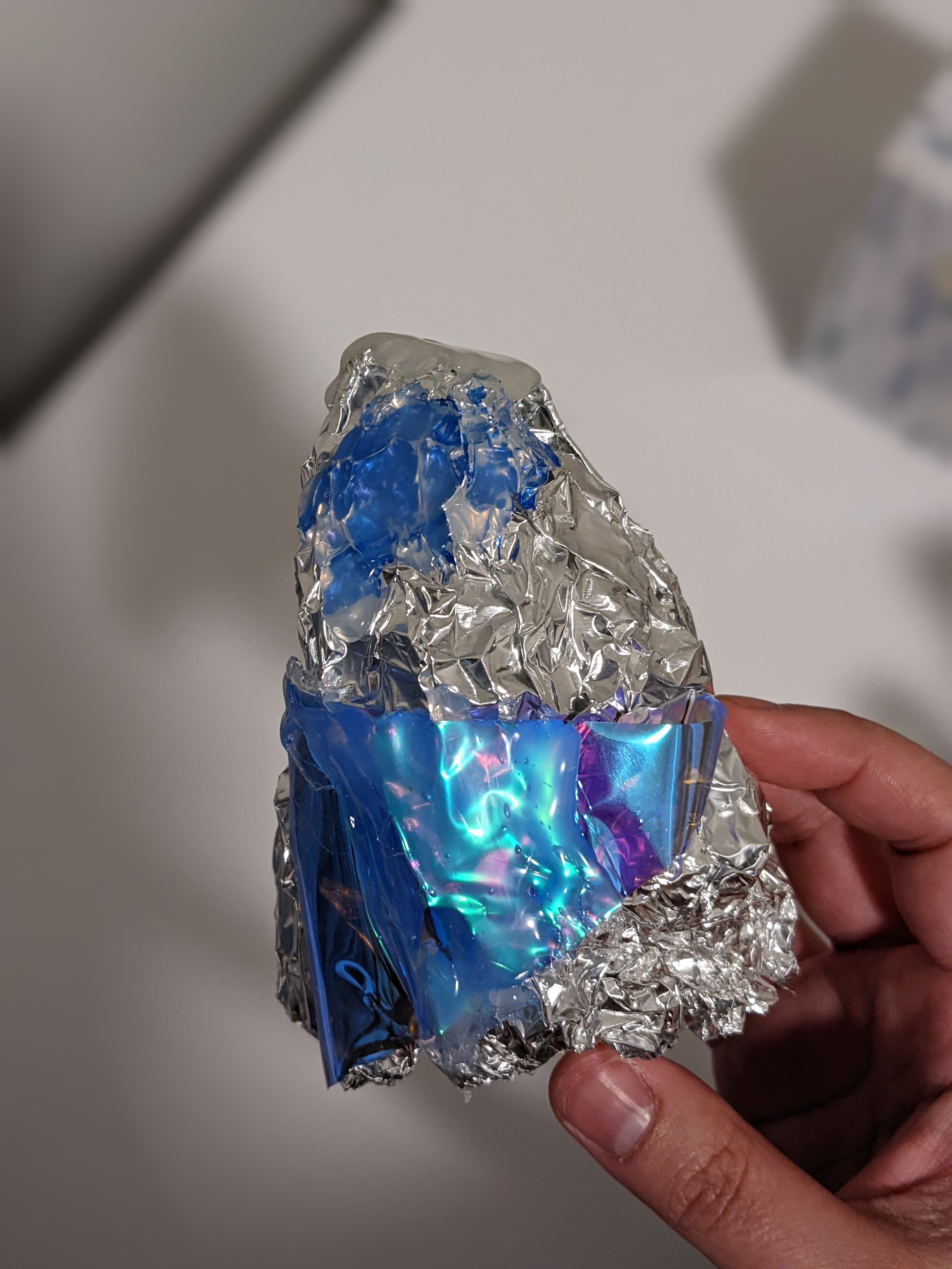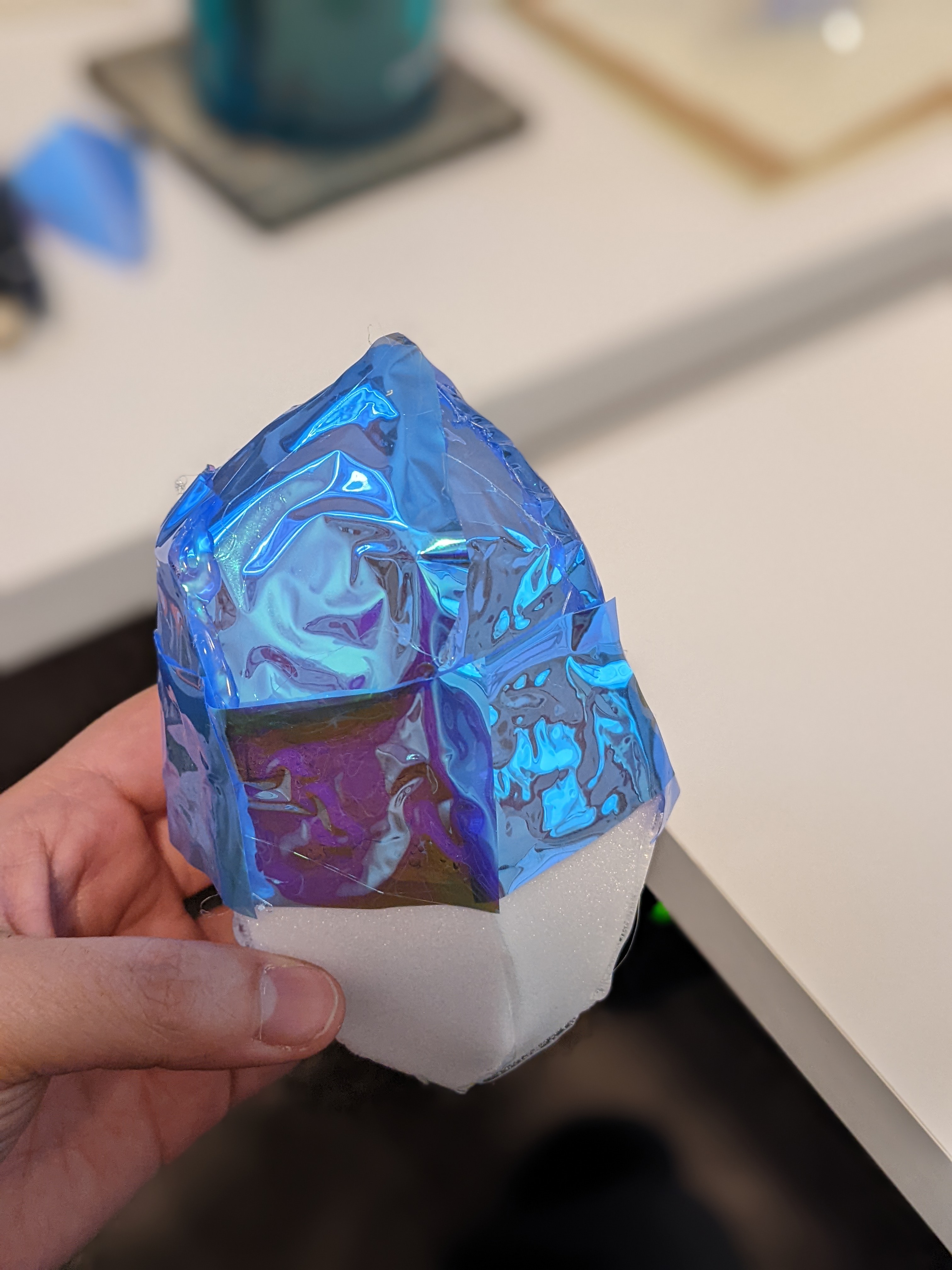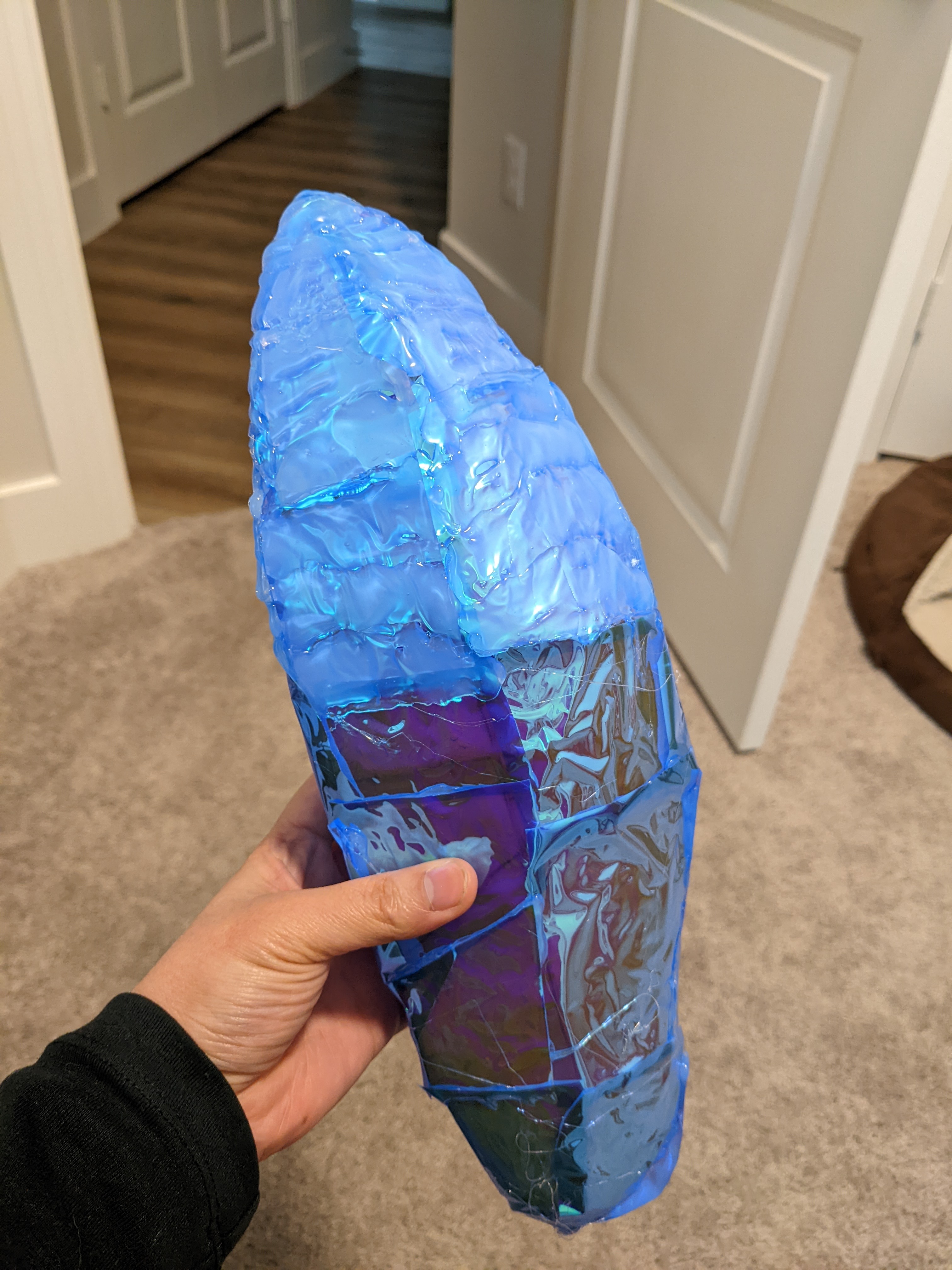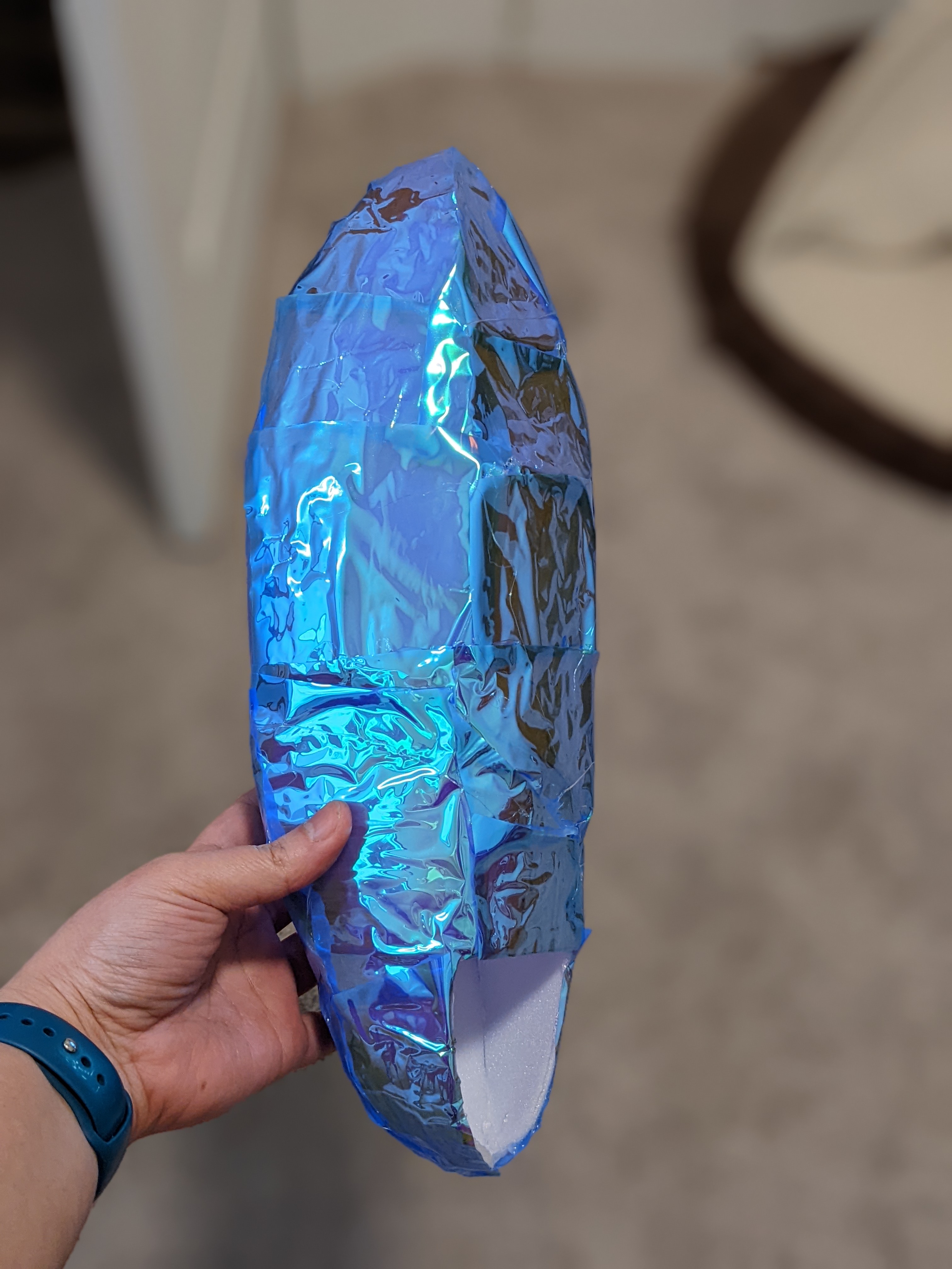 First attempt was aluminum foil and blue sharpie, with hot glue on top. I did this based on this method I found on youtube. I also tried it with blue holographic cricut vinyl. While it looked nice, it didn’t let any light through, so this wasn’t going to work because I knew I wanted to light up the crystals in the staff.