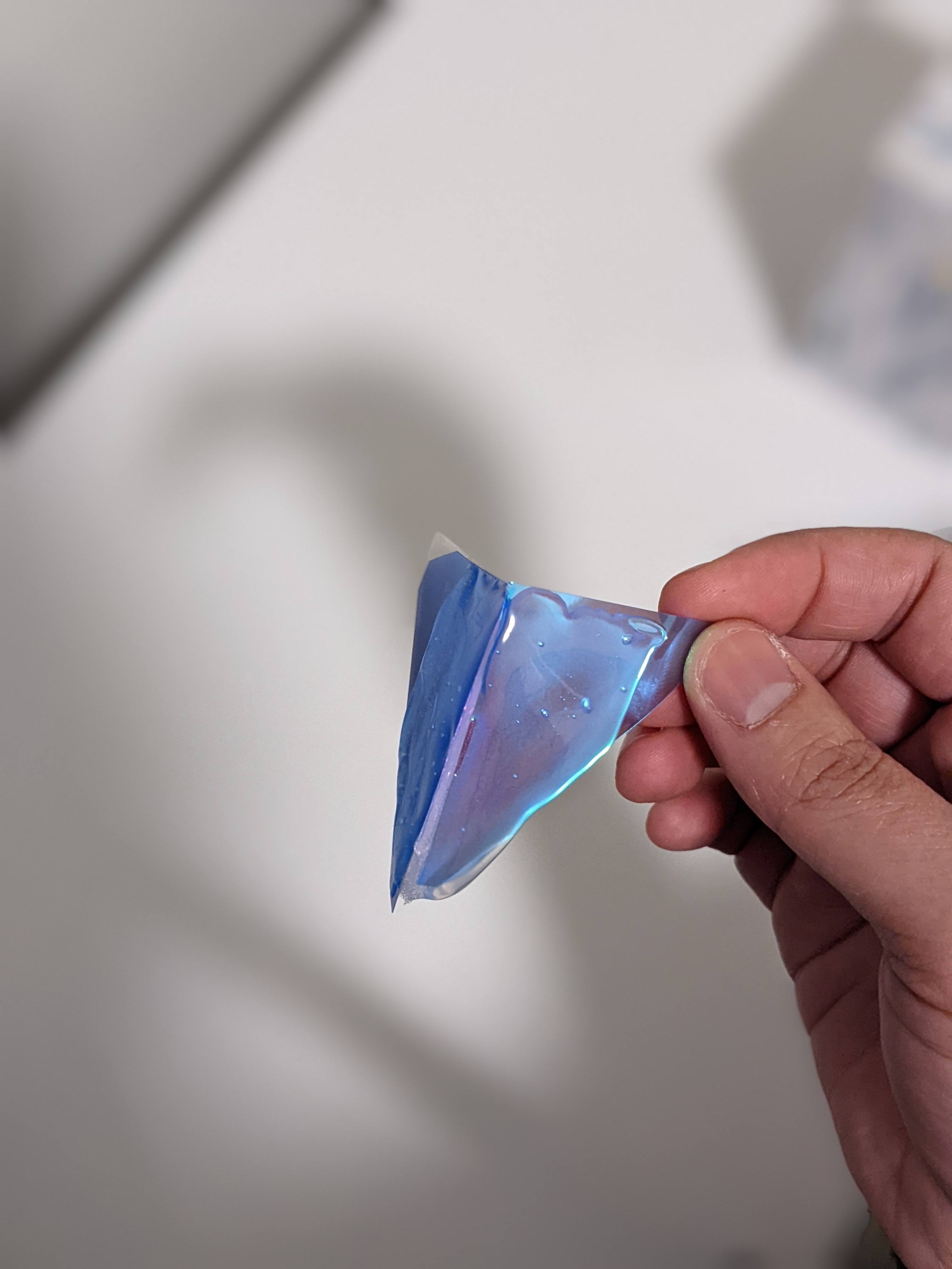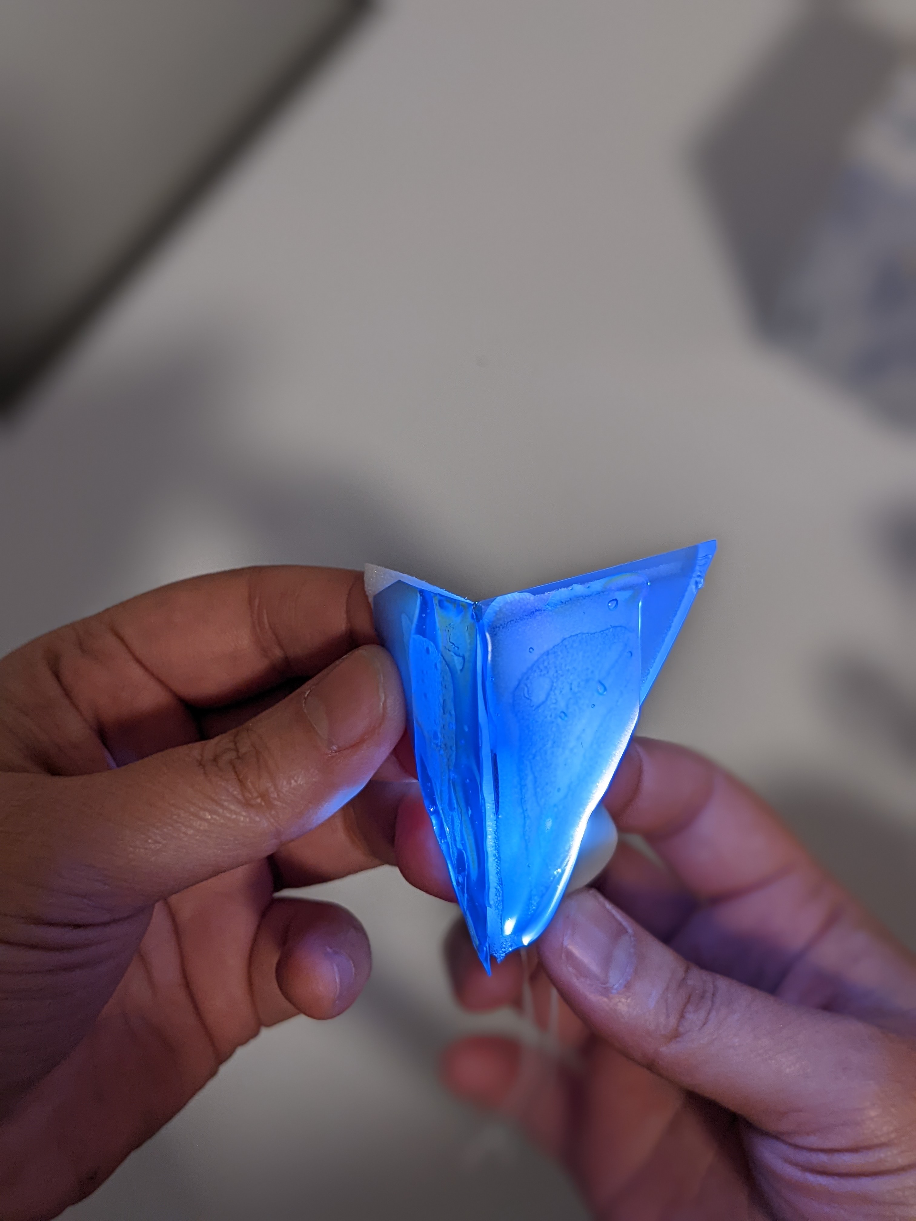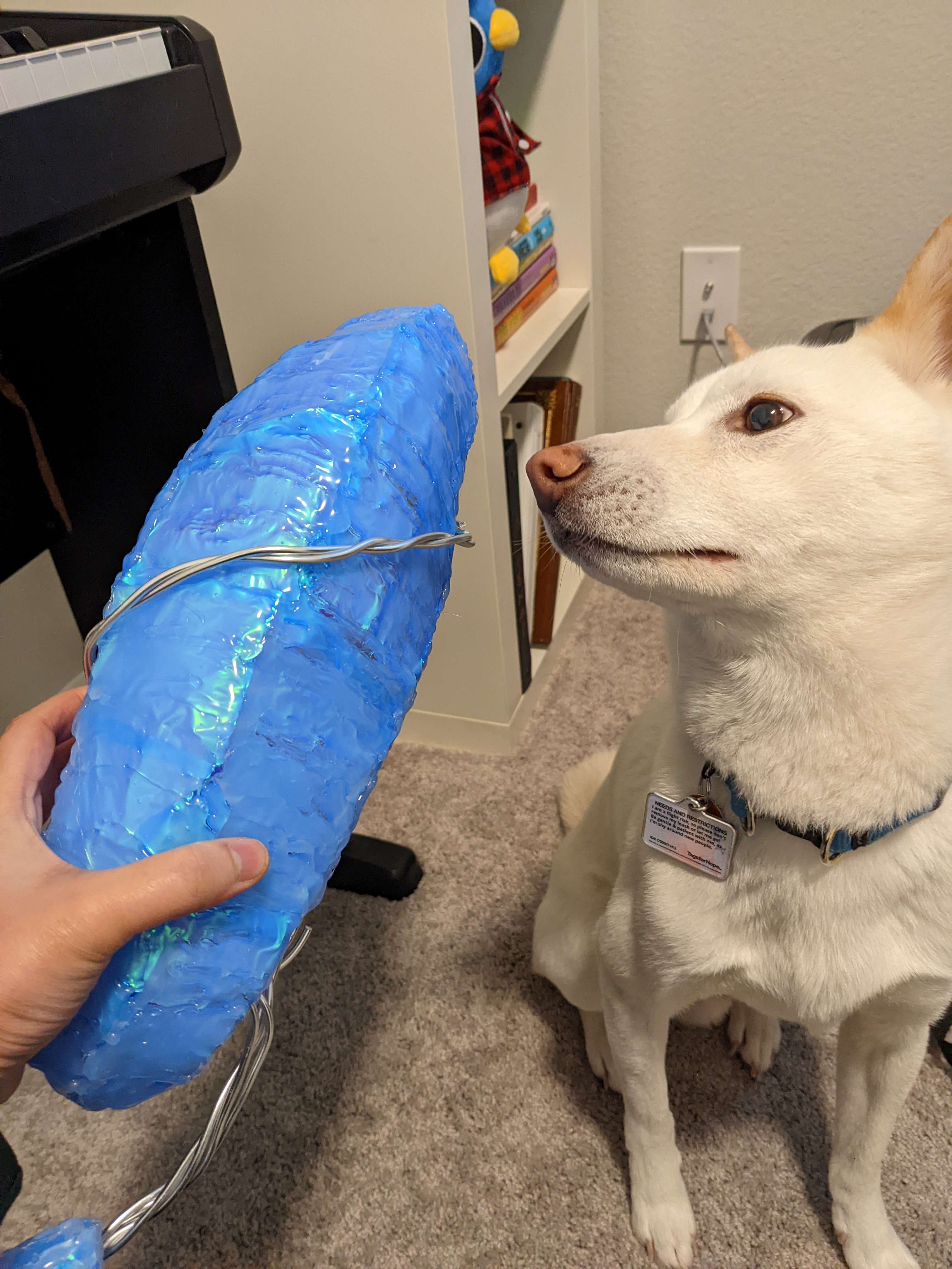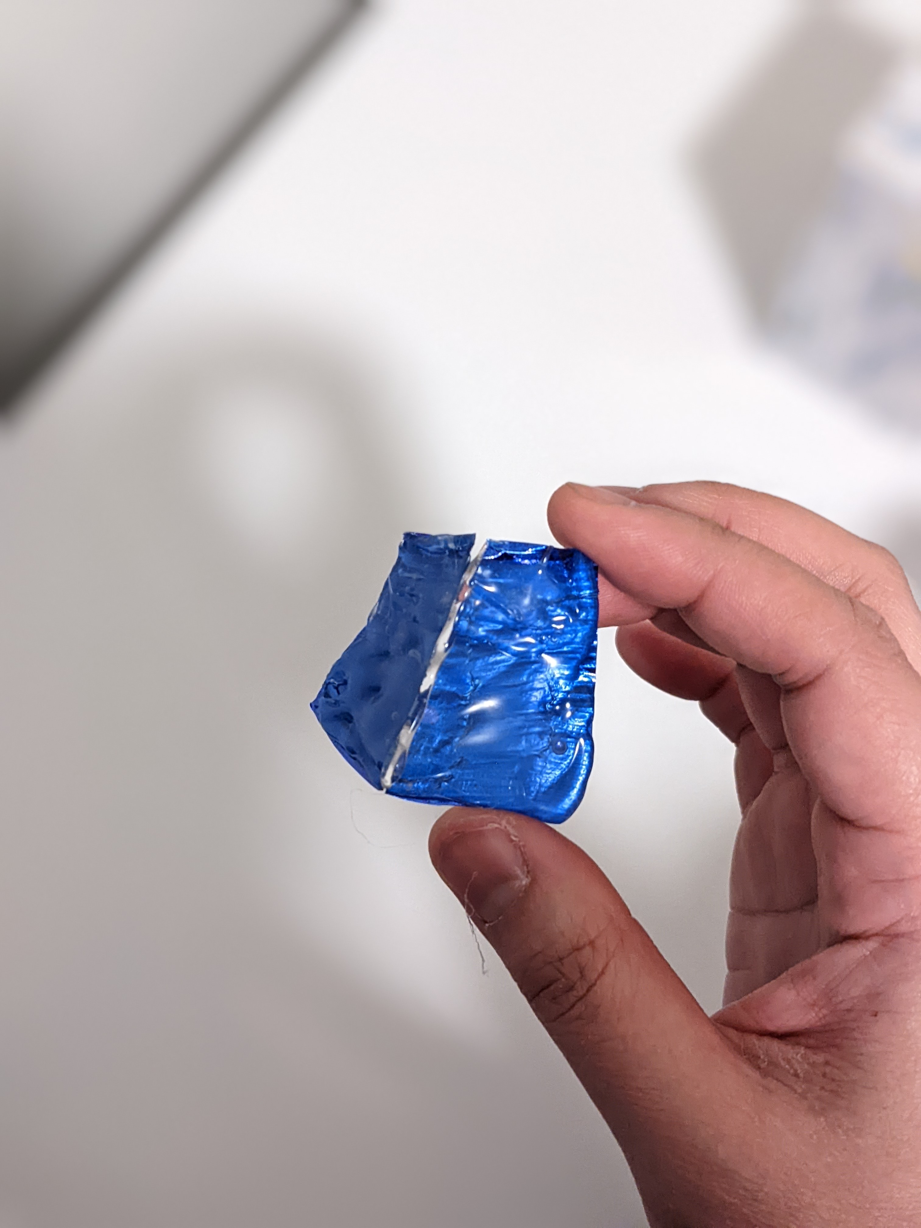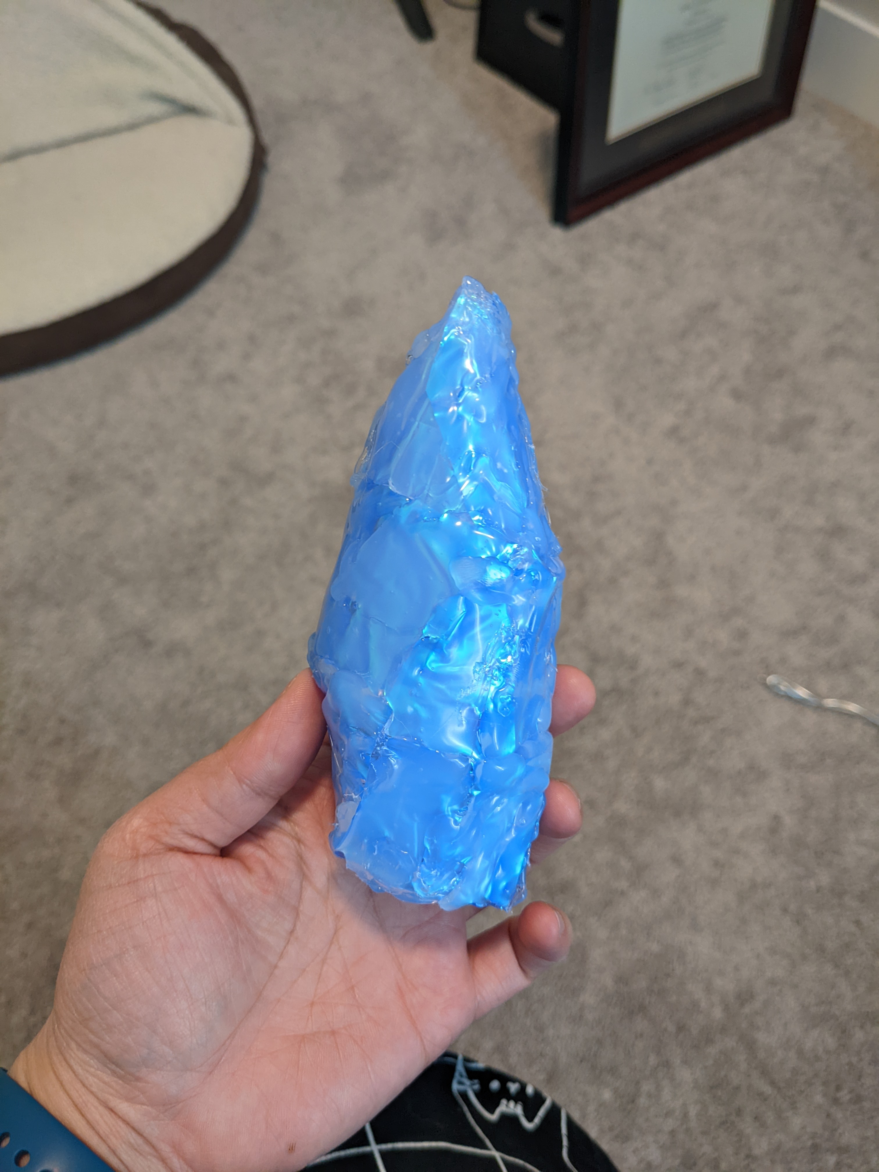 First attempt was aluminum foil and blue sharpie, with hot glue on top. I did this based on this method I found on youtube. I also tried it with blue holographic cricut vinyl. While it looked nice, it didn’t let any light through, so this wasn’t going to work because I knew I wanted to light up the crystals in the staff.