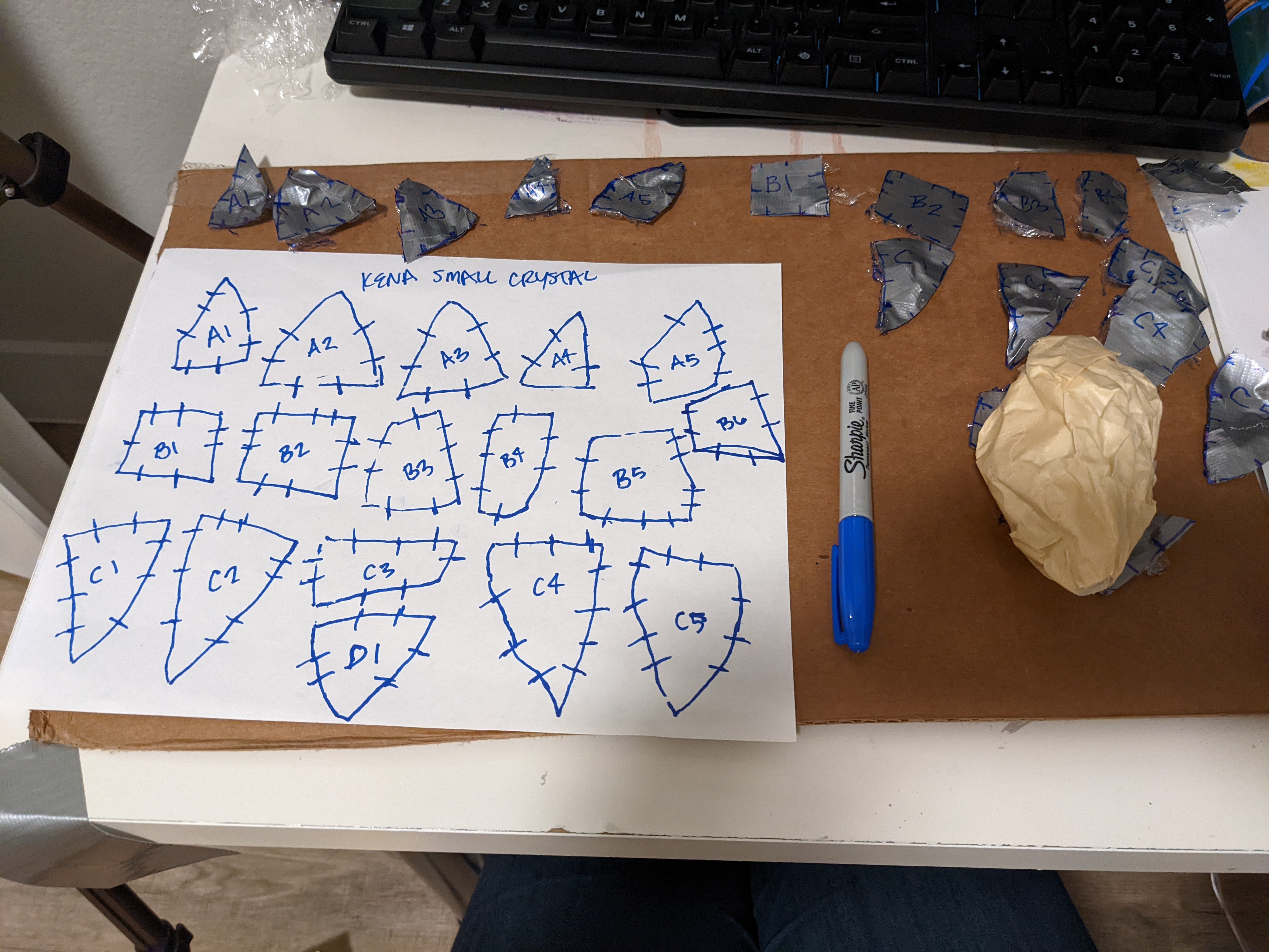 With this in mind, I set out a pattern for the crystal. I started with the small one by making a base out of paper towels and masking tape. I used this as a reference for my duct-tape pattern. From that, I made a paper test. Happy, I transferred the pattern to plastazote.