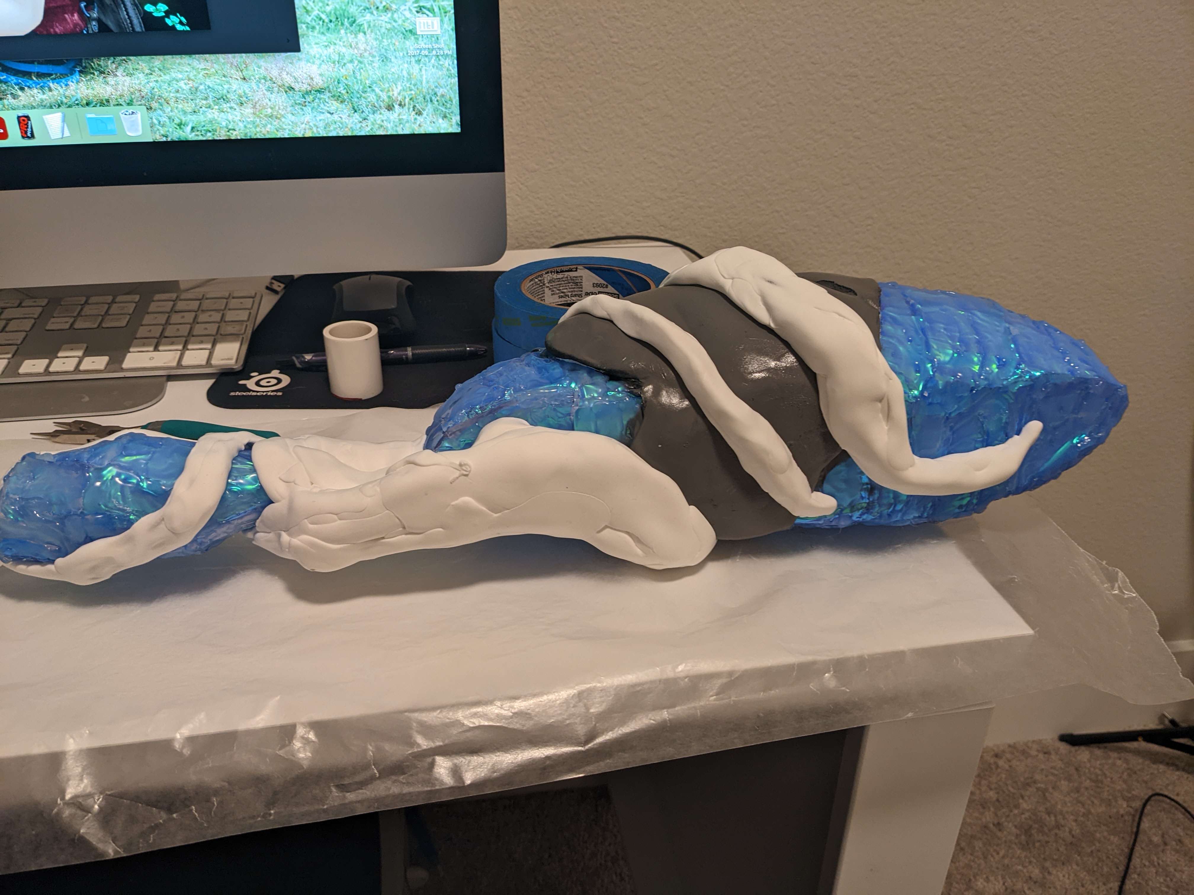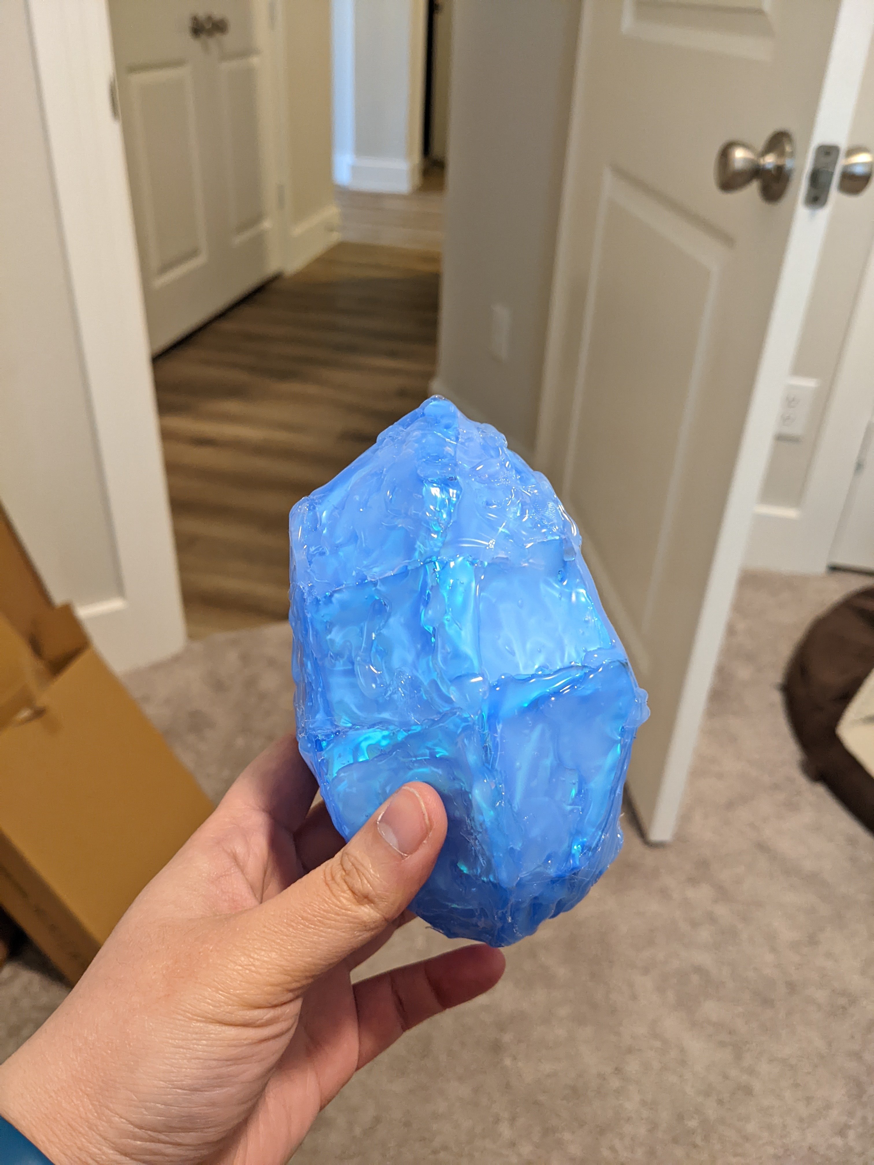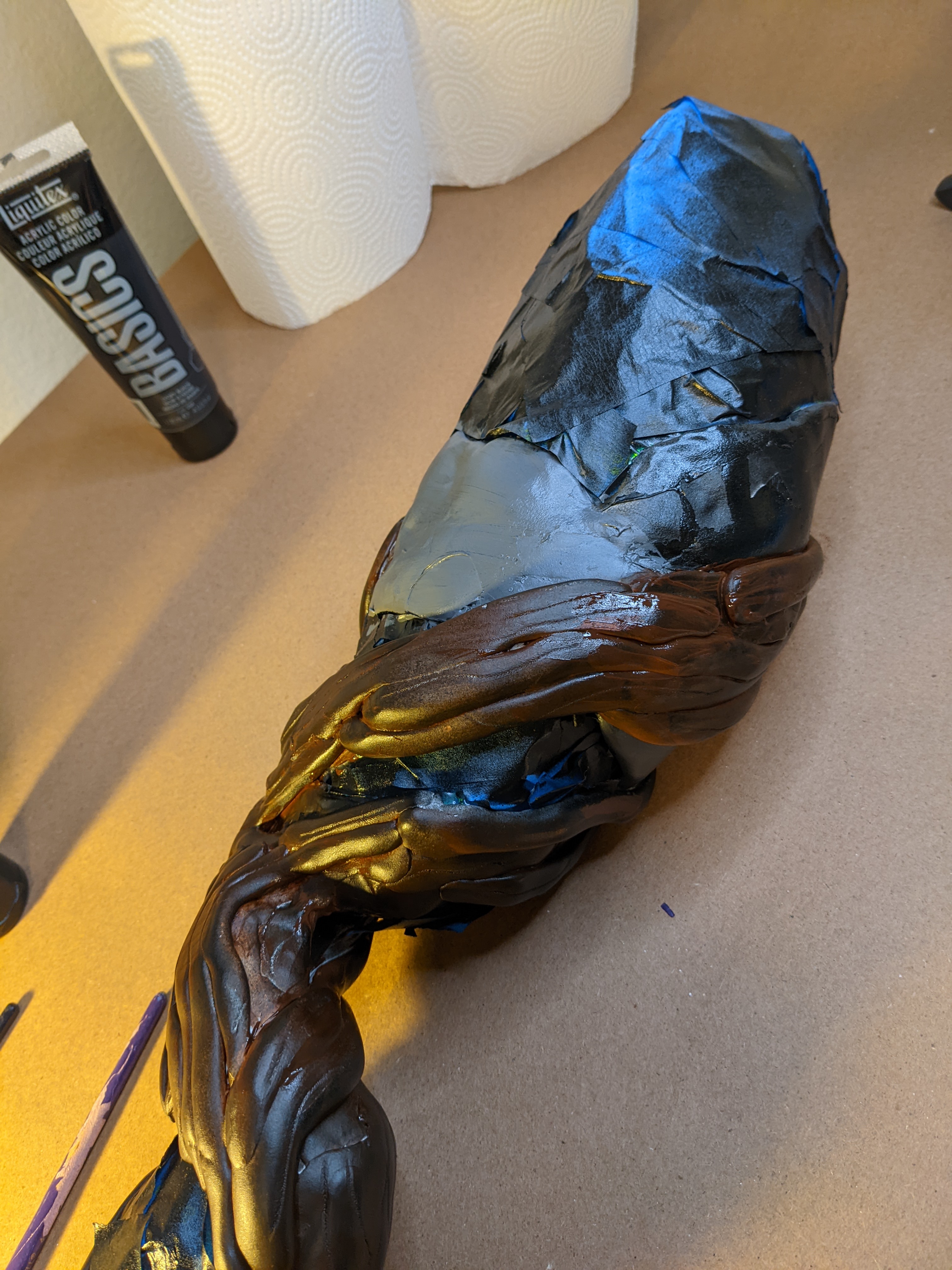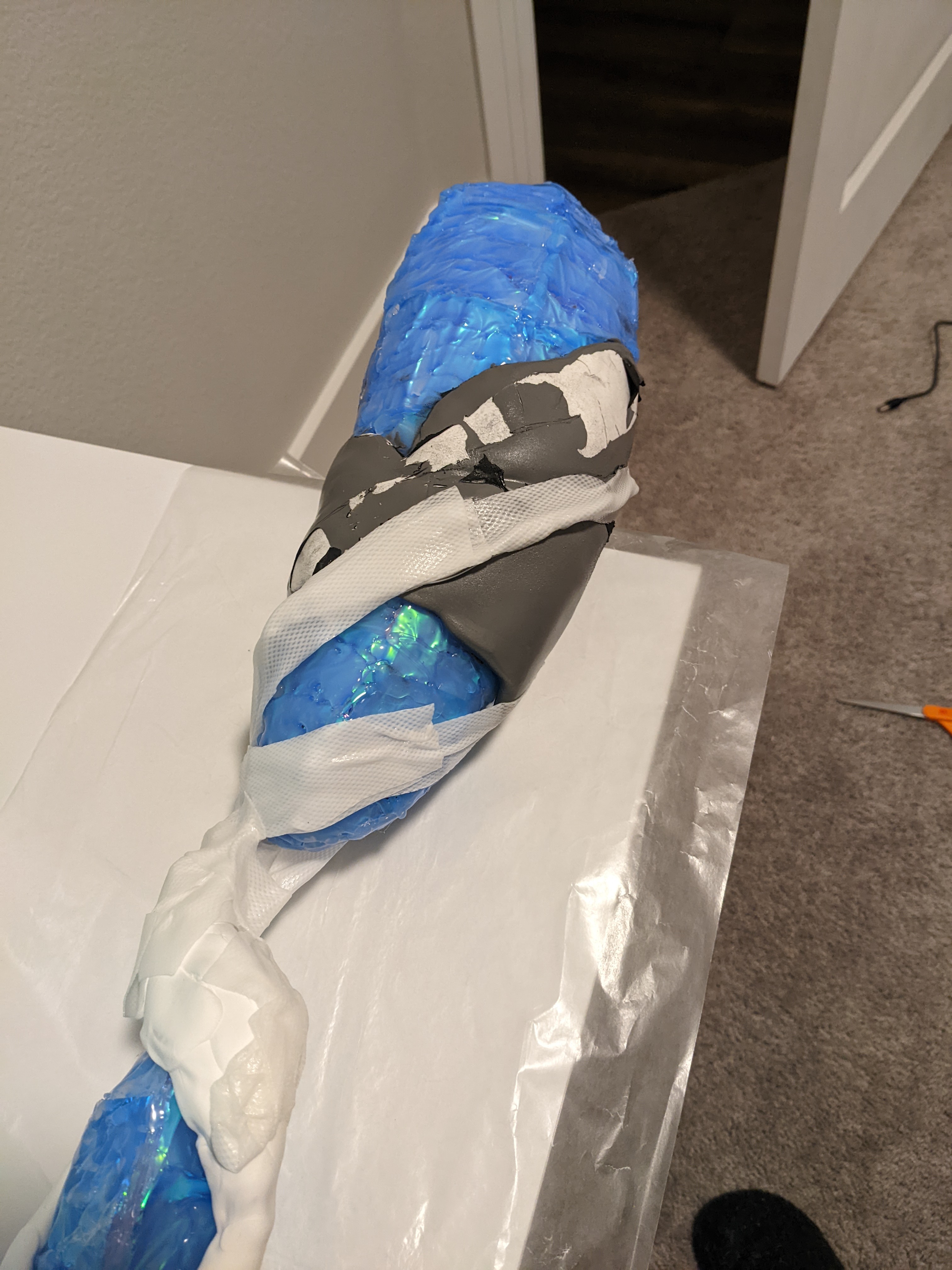 I slowly realized that the big crystal was just not supported well enough, so I used the rest of my leftover Kobracast from my Seraphine cosplay to join the small crystal to the big one. But to do that, I first had to remove the foam clay I had put on the night before. I ended up losing some paint that had been added to the rock part of the big crystal, but I knew I’d have to paint the whole thing anyway, so it was fine. After adding the Kobracast, I then covered all that in foam clay.