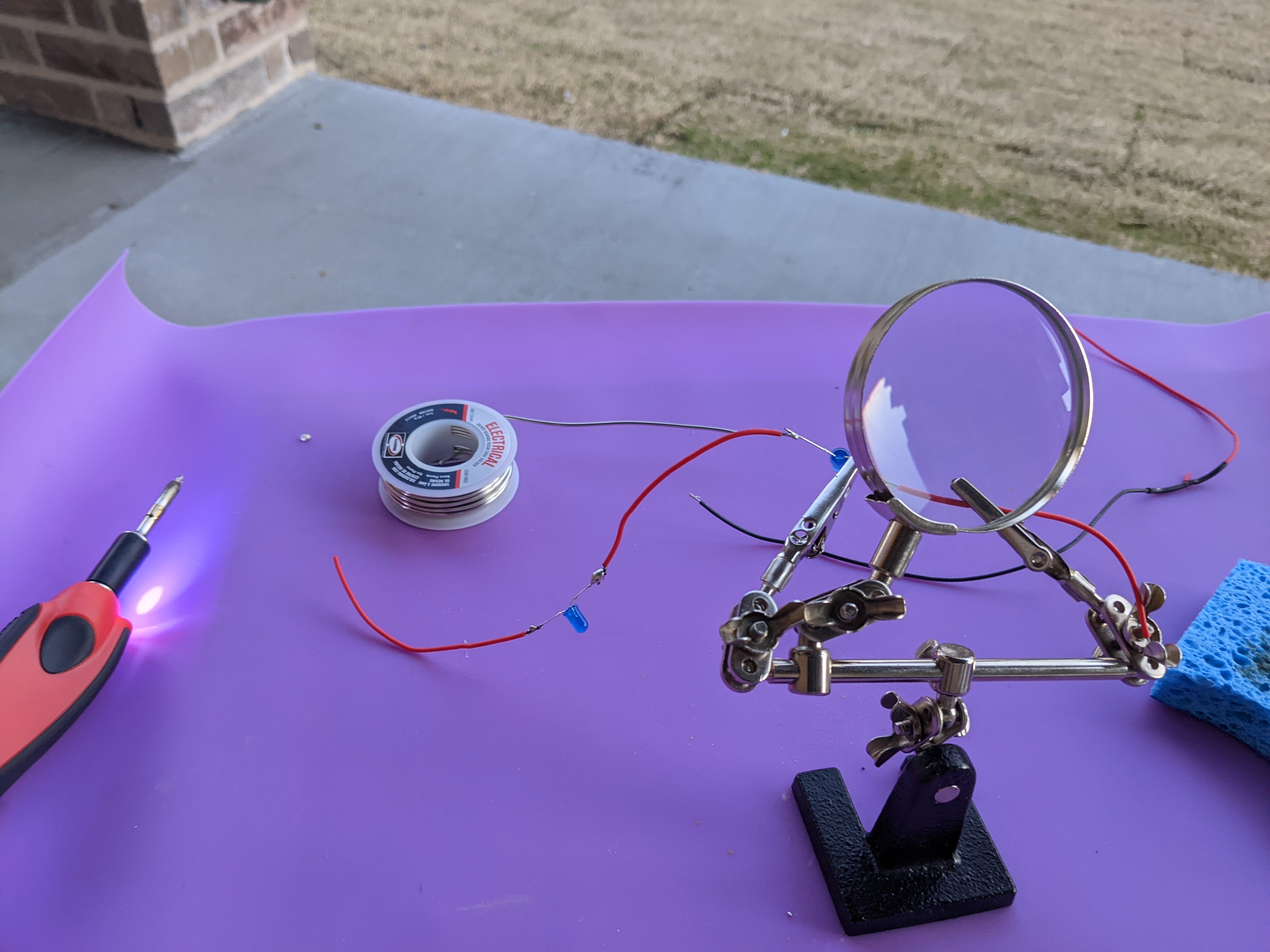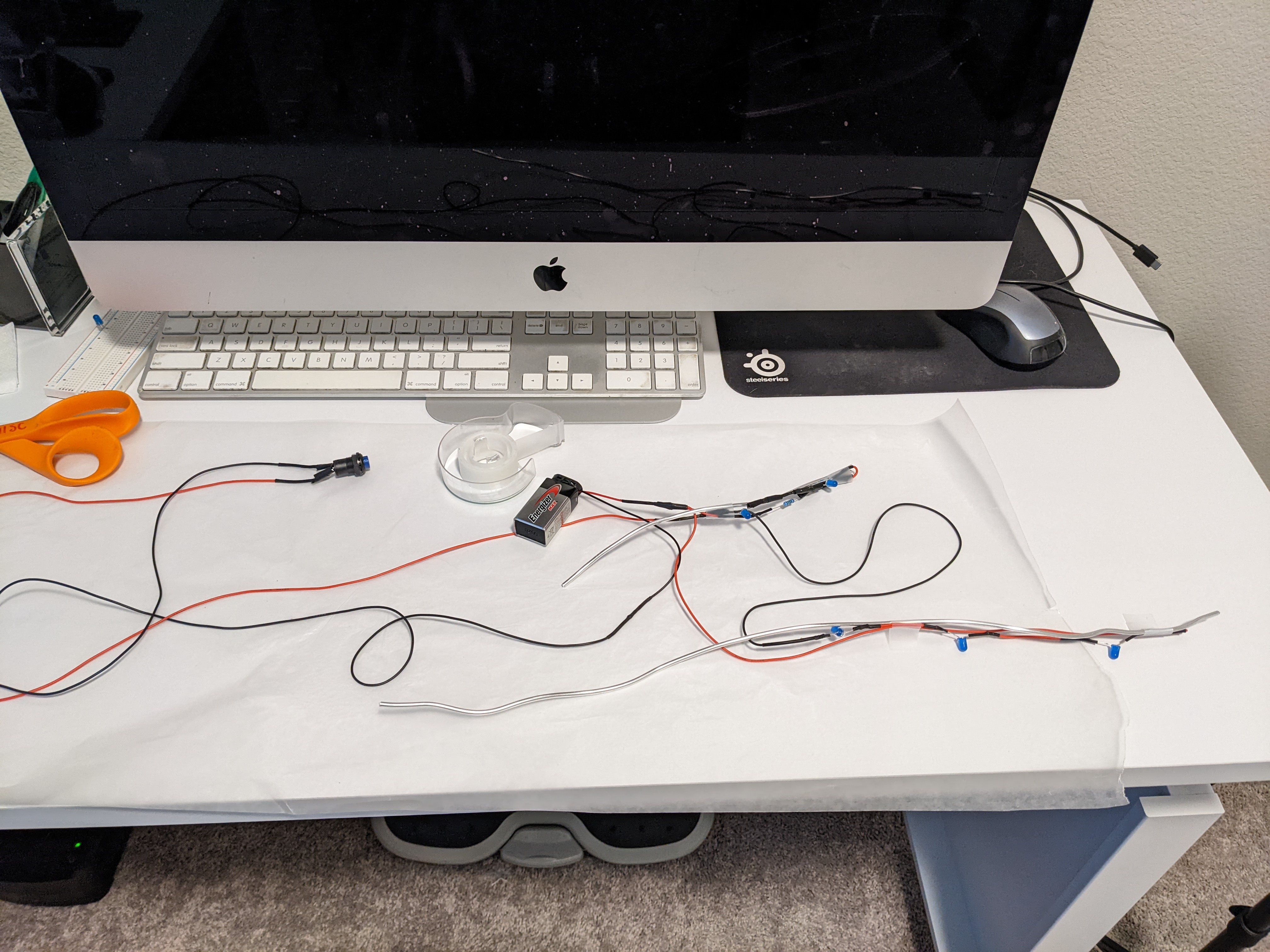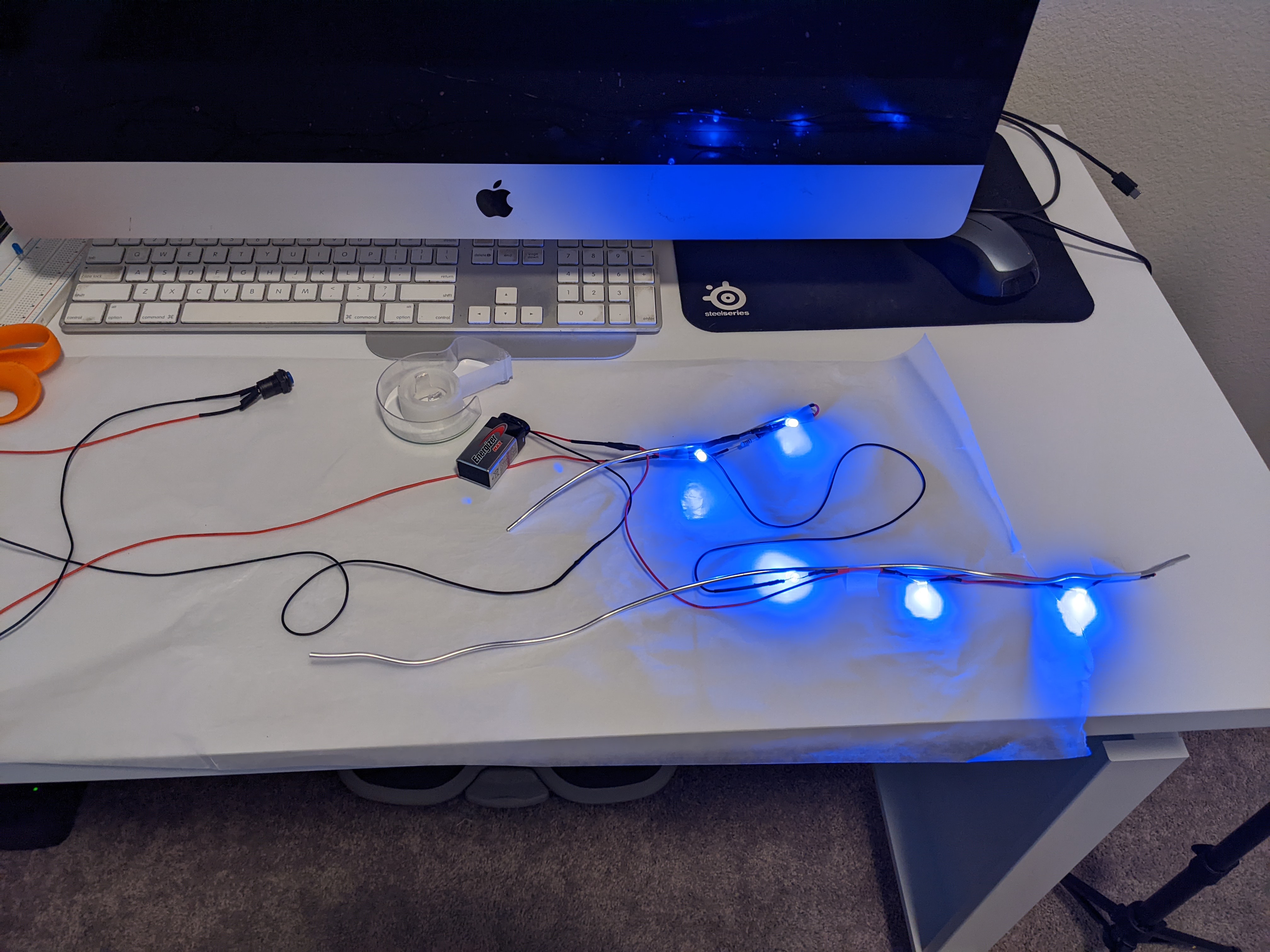 This was my first time really truly incorporating lights into a cosplay. I had attempted before with Maria, but that was a very poor attempt. I basically bought an existing light/battery pack set off Amazon and shoehorned it into the scythes. This time, I was making a custom circuit so that the lights looked and behaved exactly how I wanted them to.