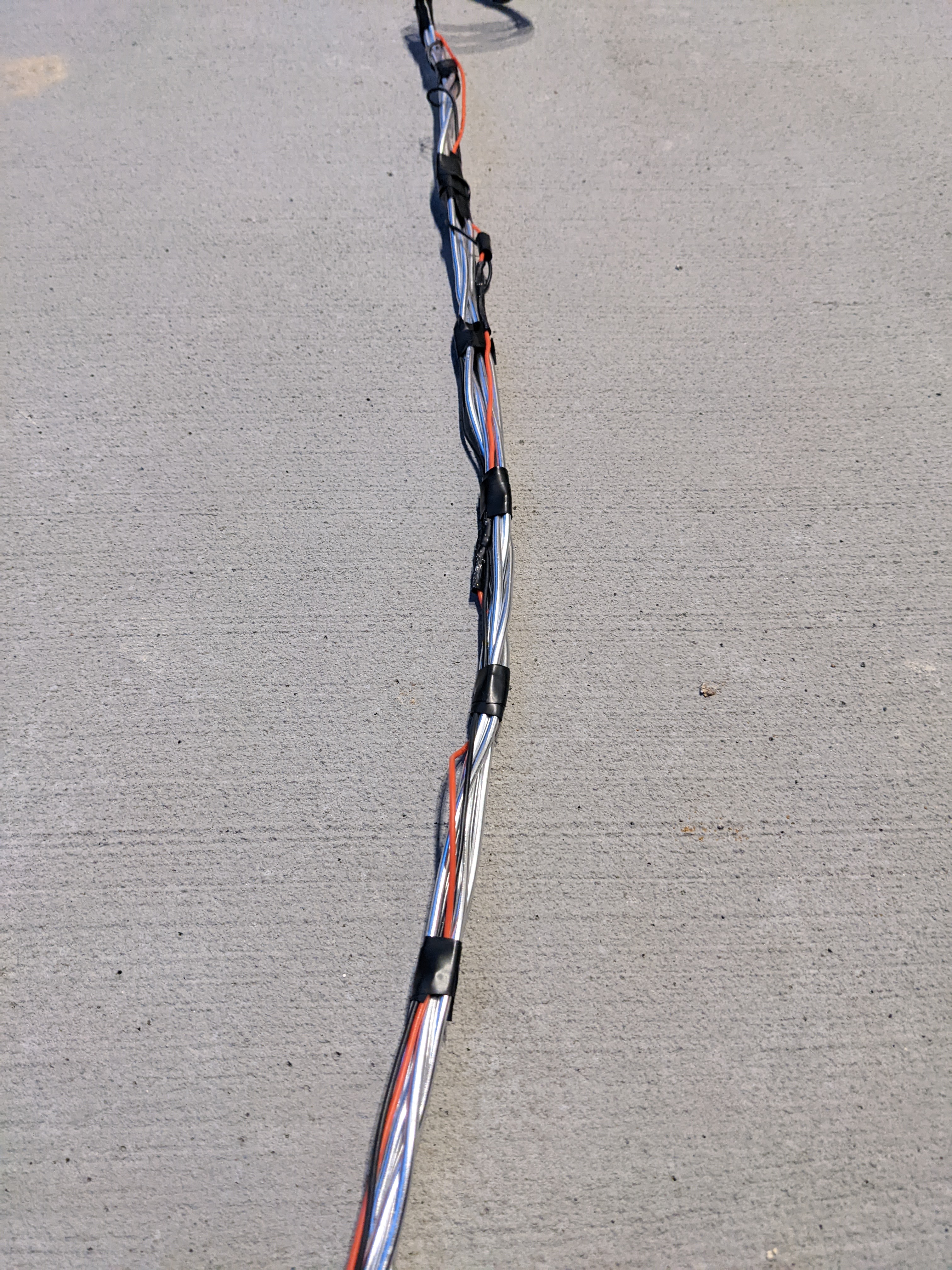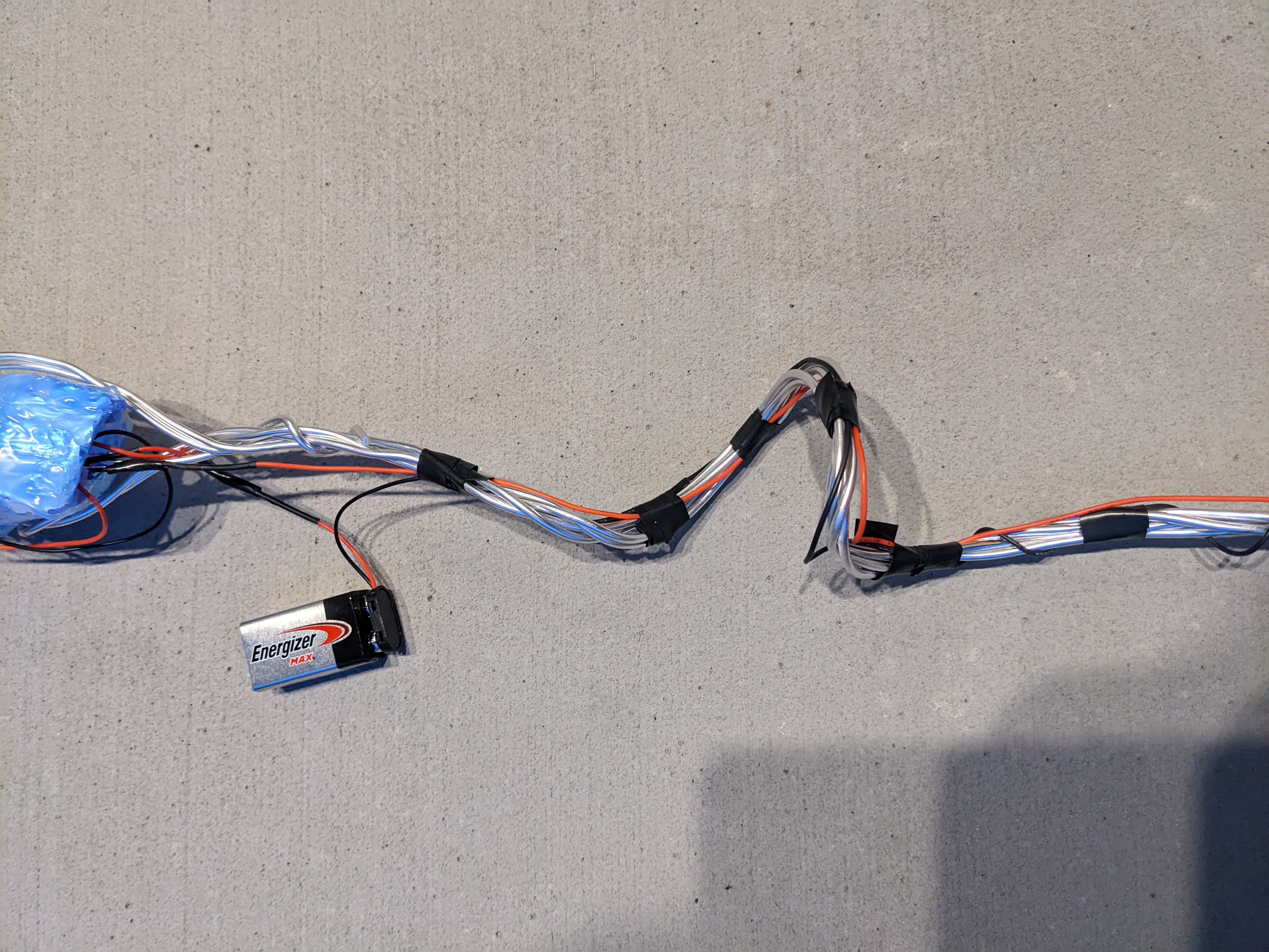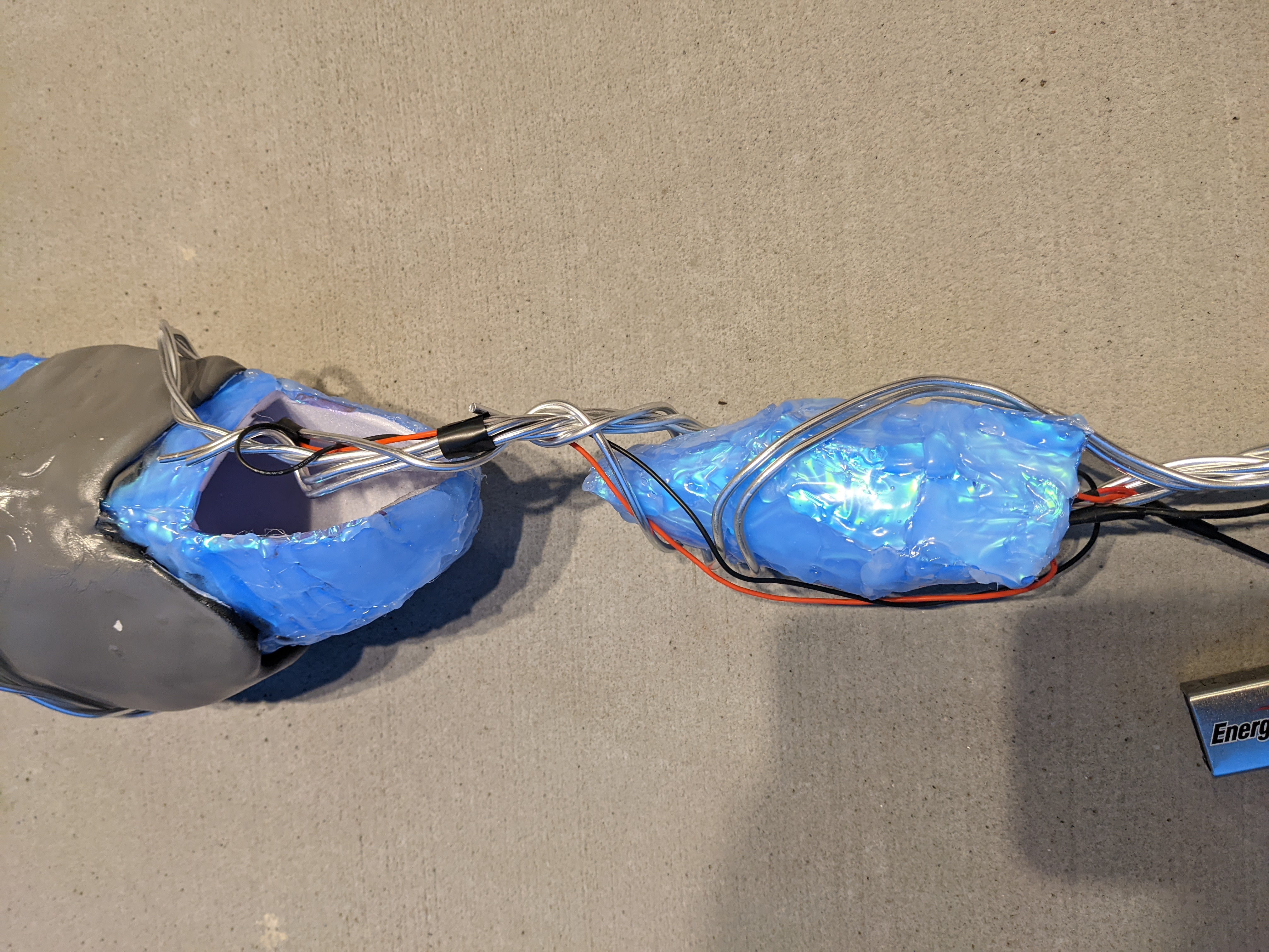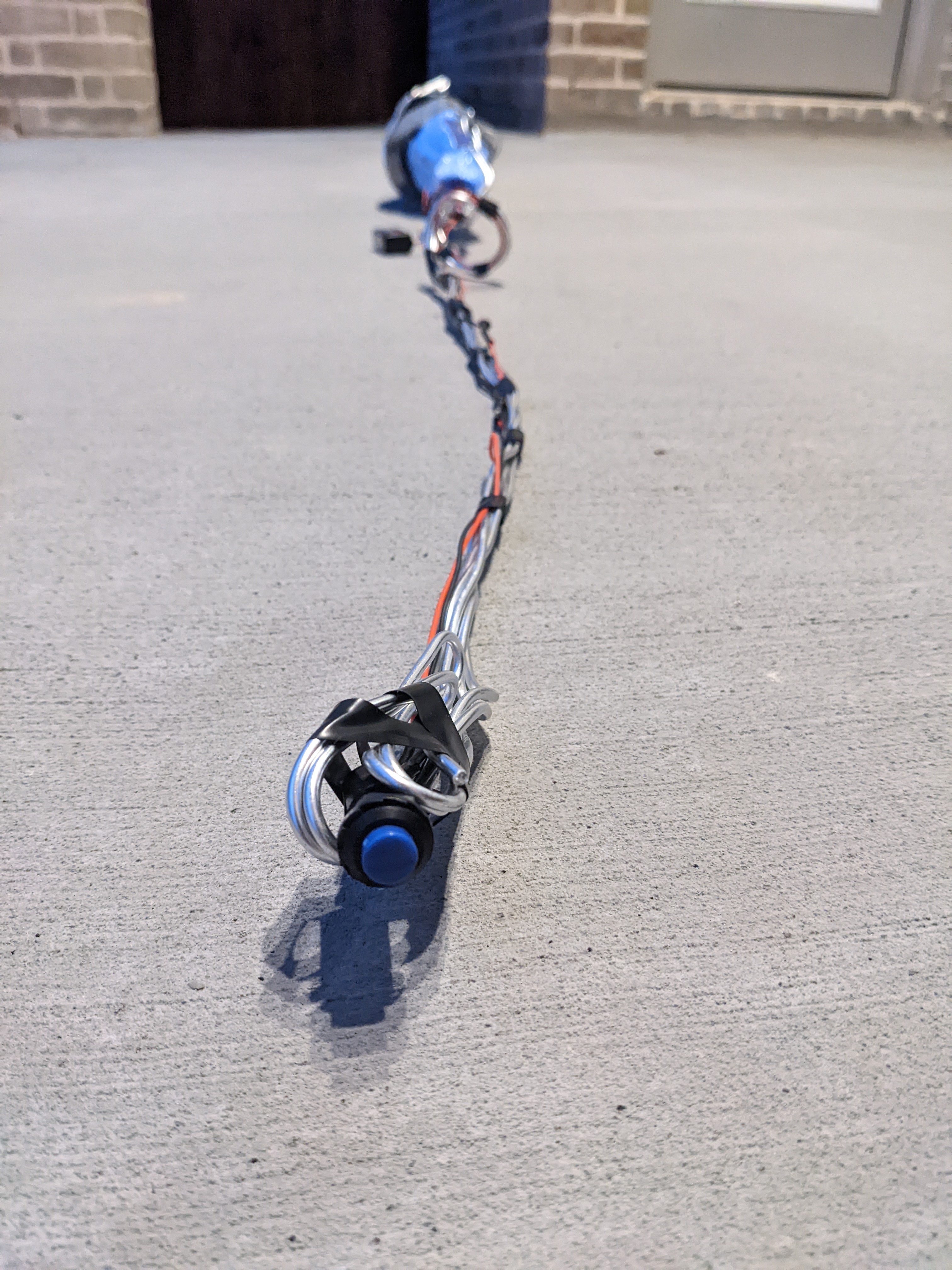 The circuit consisted of two parallel lines: One with 3 blue 3V LEDs, the other with 2 blue 3V LEDs and a 150ohm resister. all powered by a 9V battery. While 9V batteries don’t last super long, I wanted to start off simple and just following Kamui’s book. This worked fantastically for what I needed. I also included a button that would be at the bottom of the staff.
