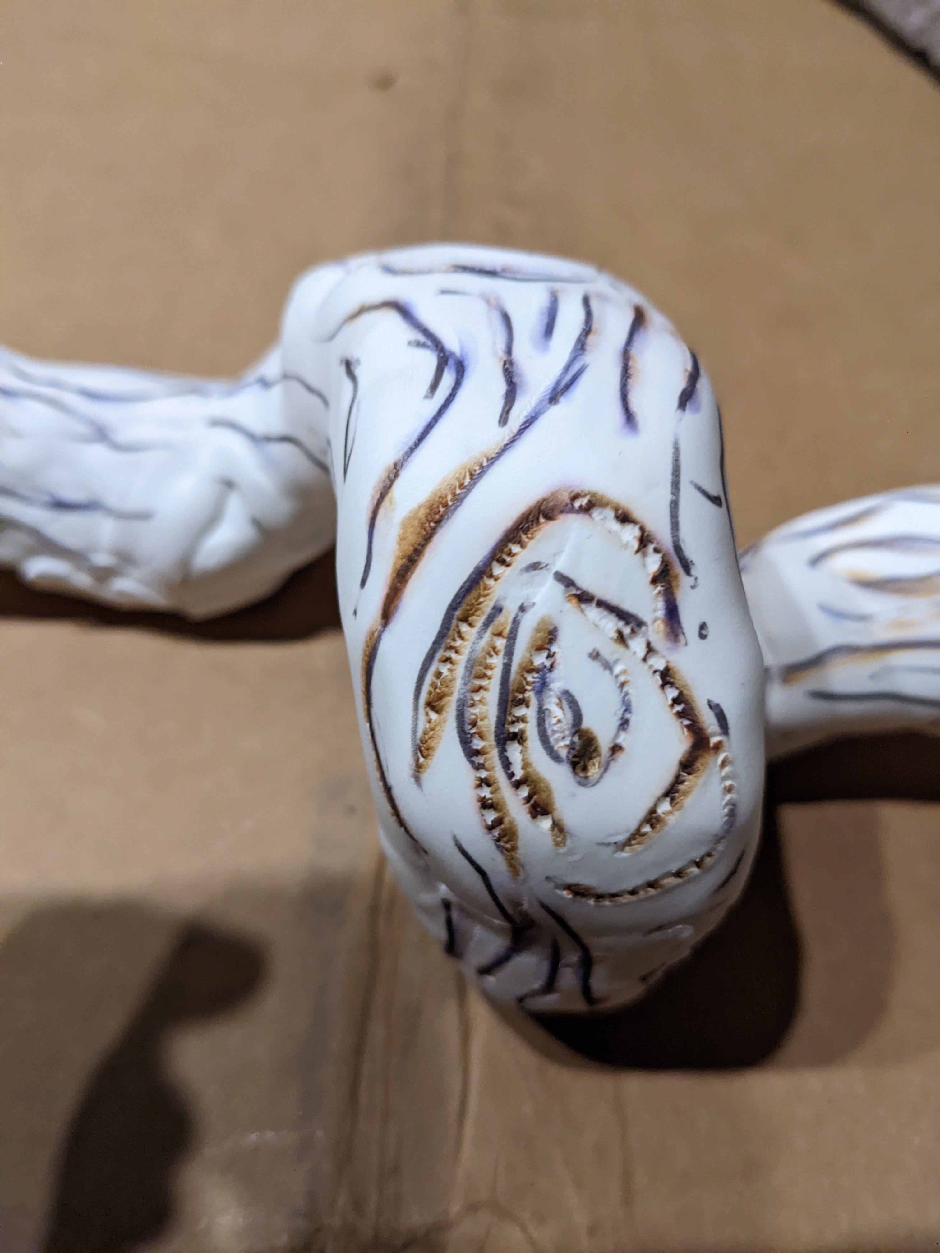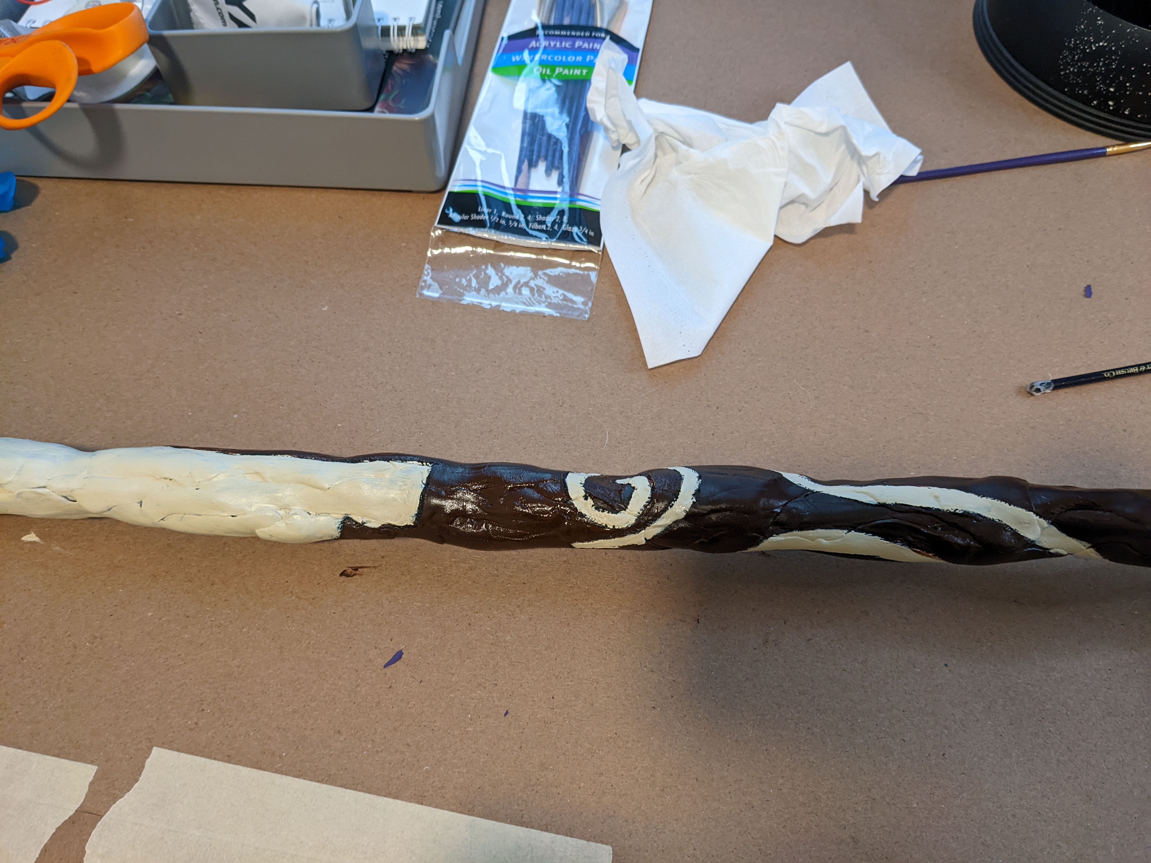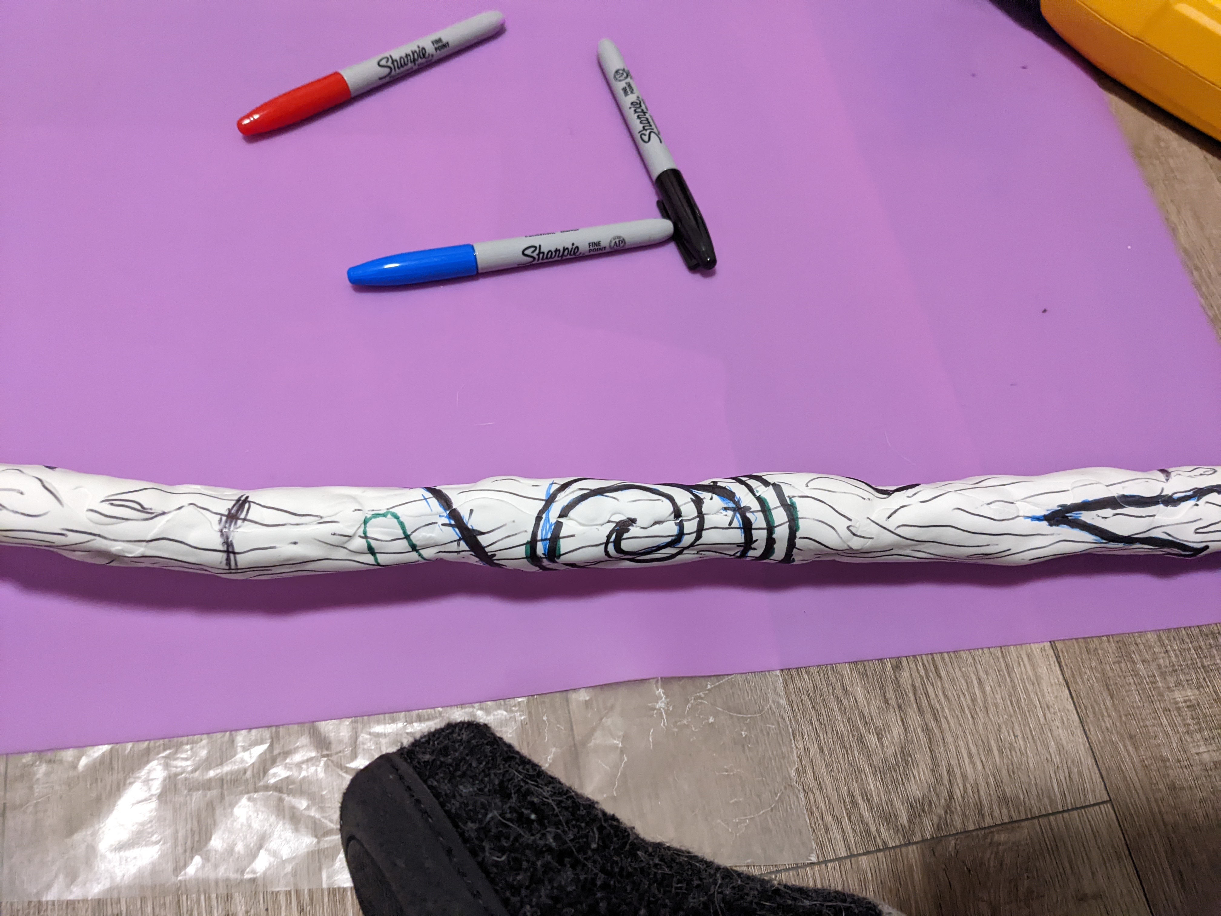 Next, I marked with pen and sharpie where the staff details would be. There are parts of the staff that almost look carved into swirl designs, so I used my soldering iron to mark these as well as give it some depth. I don’t know if it’s just that my soldering iron might not have been powerful enough or maybe I was too featherlight on the touch, but the details probably could’ve been deeper.