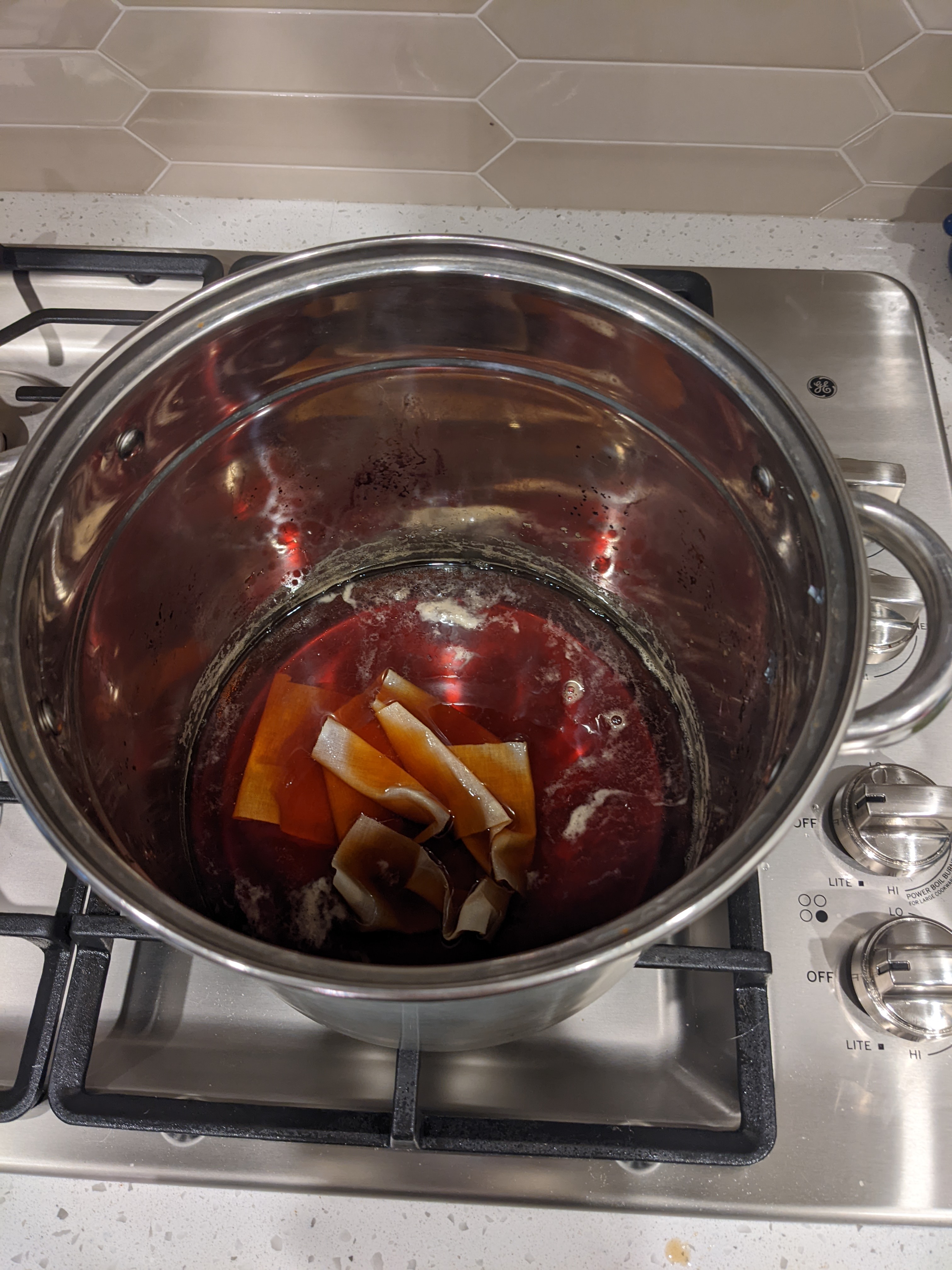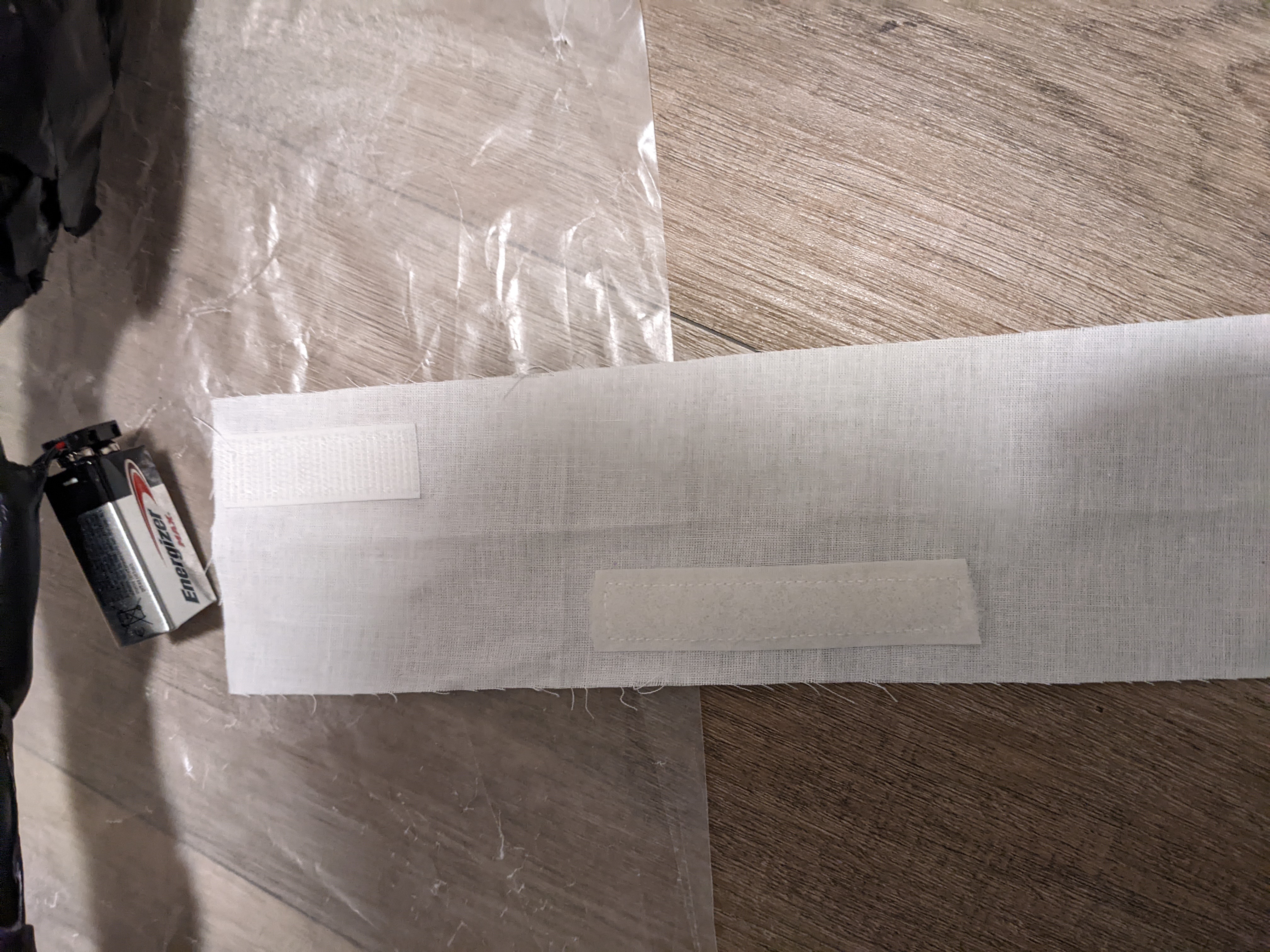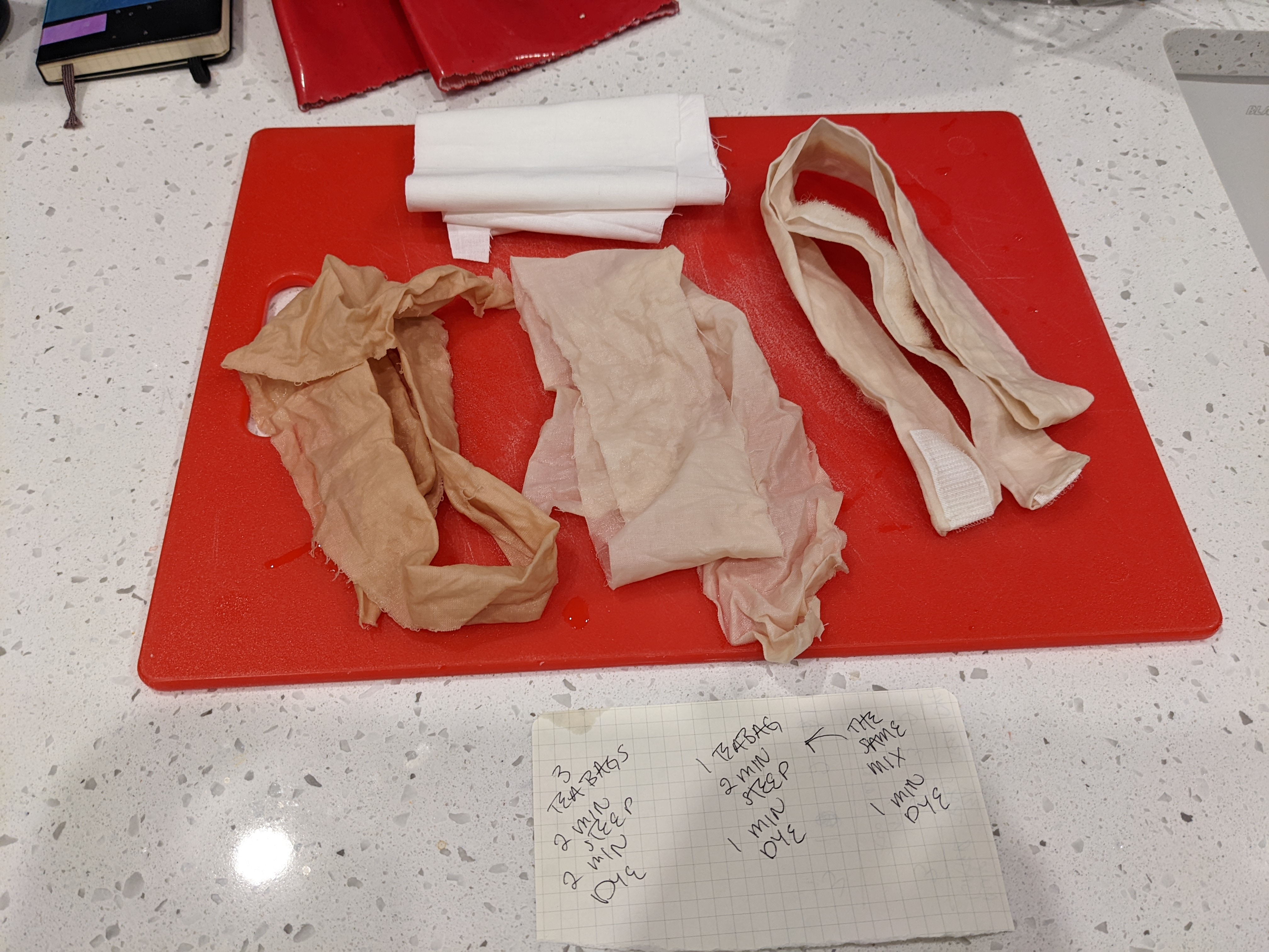One small touch that was added was I needed straps to cover the battery pack as well as be part of the handle. Using scrap fabric, I made a long strap that had velcro on both ends so that I could attach it to the staff. I made the straps and then use the tea-stain method to dye them. (I did NOT need as much tea used in that link. In fact, I tried 3 tea bags on a test piece of fabric and it was actually too much! The magic number was 1 tea bag, steeped for 2 minutes, with the strap submerged for 1 minute.