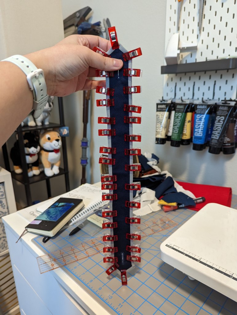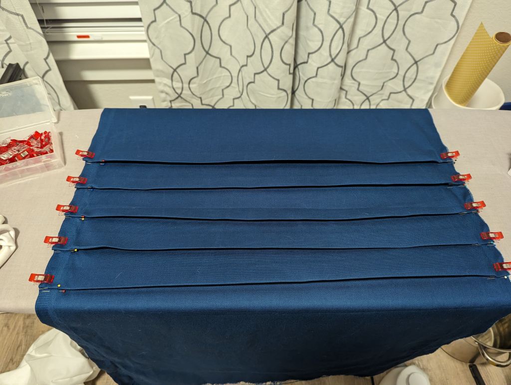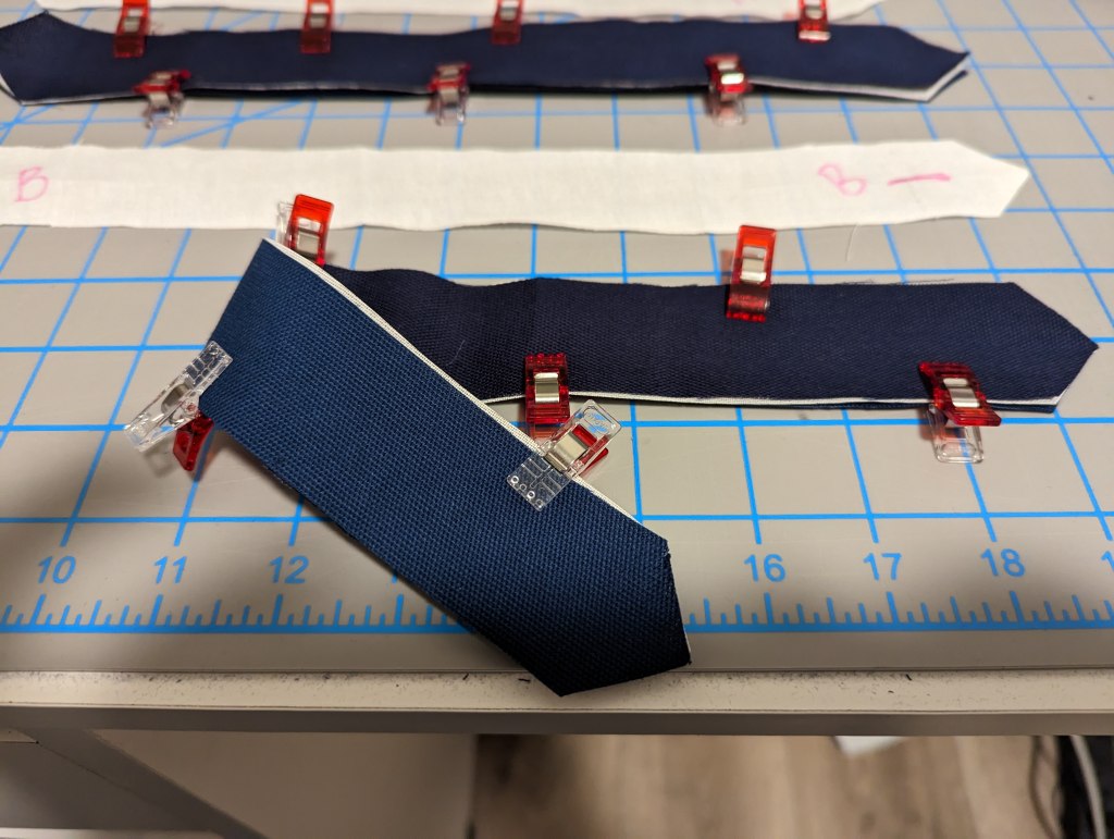 Getting the placement also meant I knew how long to make each strap, since the ones toward the bottom would be longer. I sandwiched buckram between two pieces of blue fabric. The dark fabric served as the fashion fabric while the medium blue served as the back.