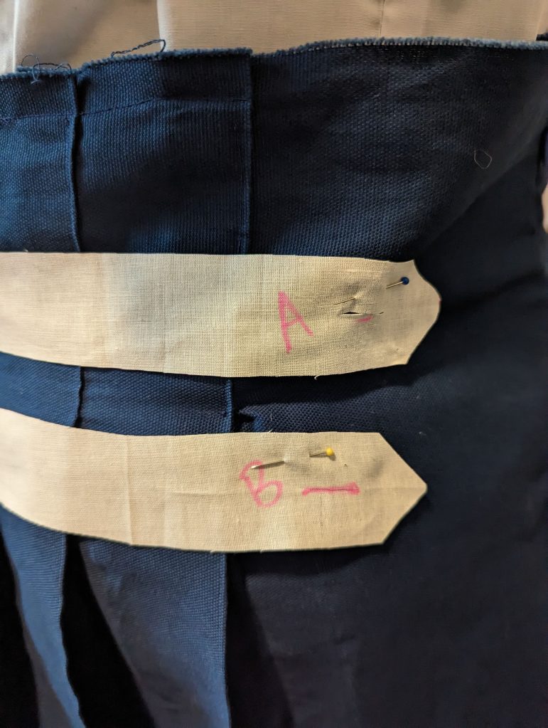 I really wanted to make sure the strap placement was good, so I utilized strips of muslin fabric to mark where everything should go. Once I knew where the straps went, that informed where the buttons would go. Yes, I wanted the buttons to actually be functional and not just decoration!