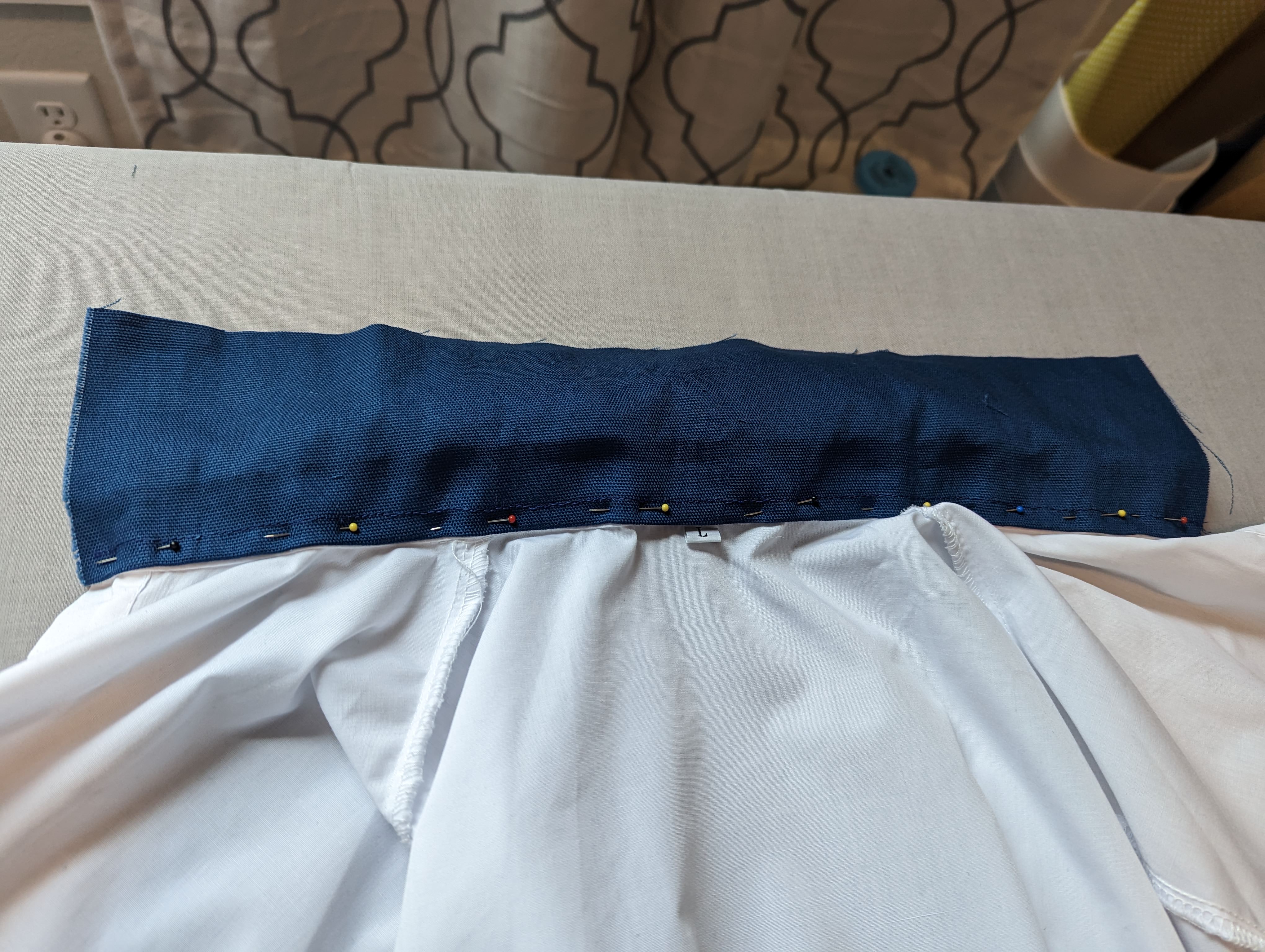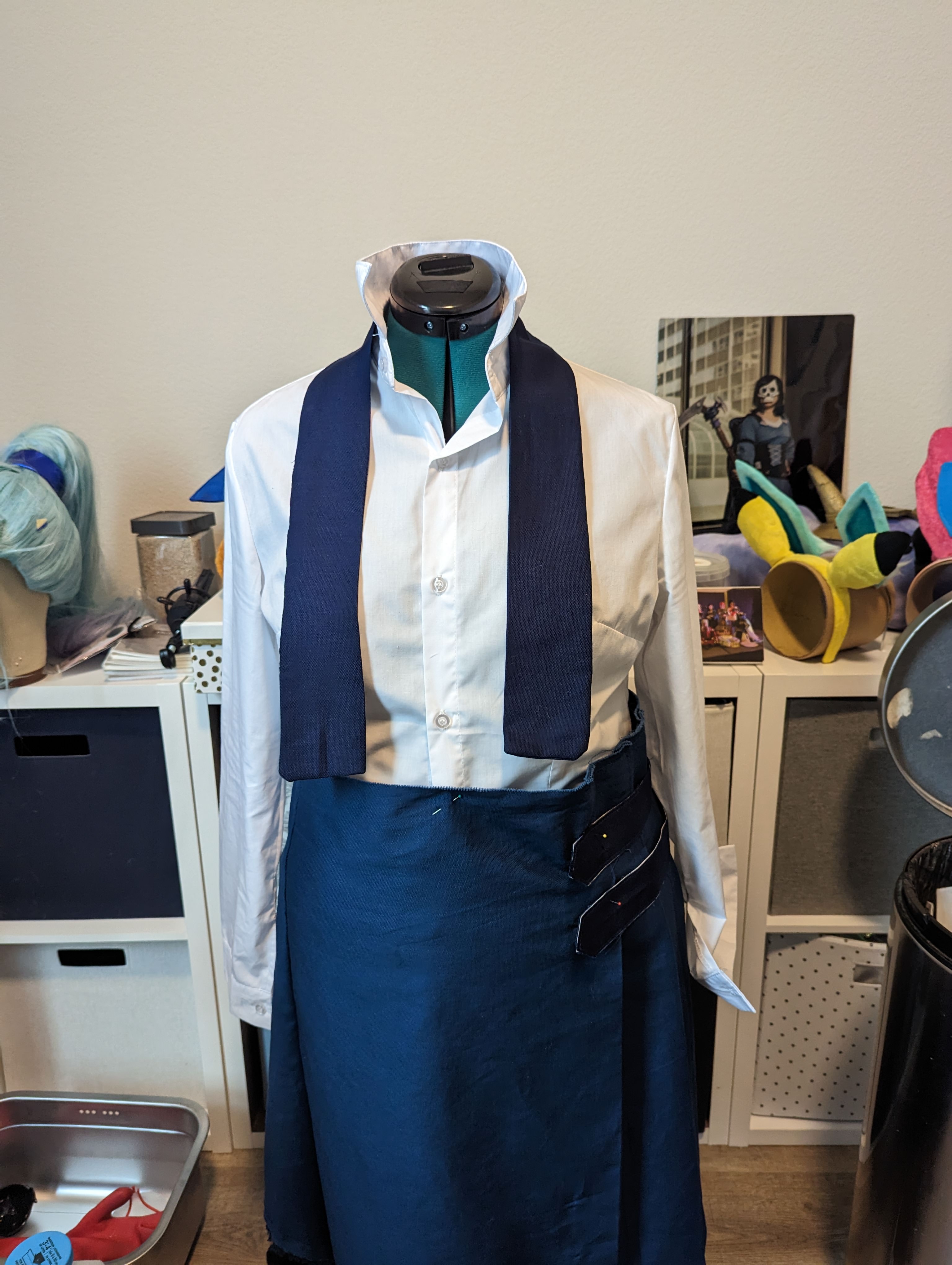 I bought a pattern to do a dress shirt from scratch, but was running low on time. So, I opted to modify an existing shirt I had. This meant covering the collar with my own fabric. I used the same blue fabric used for the skirt base to cover the collar.