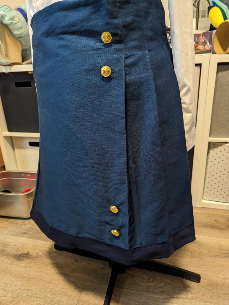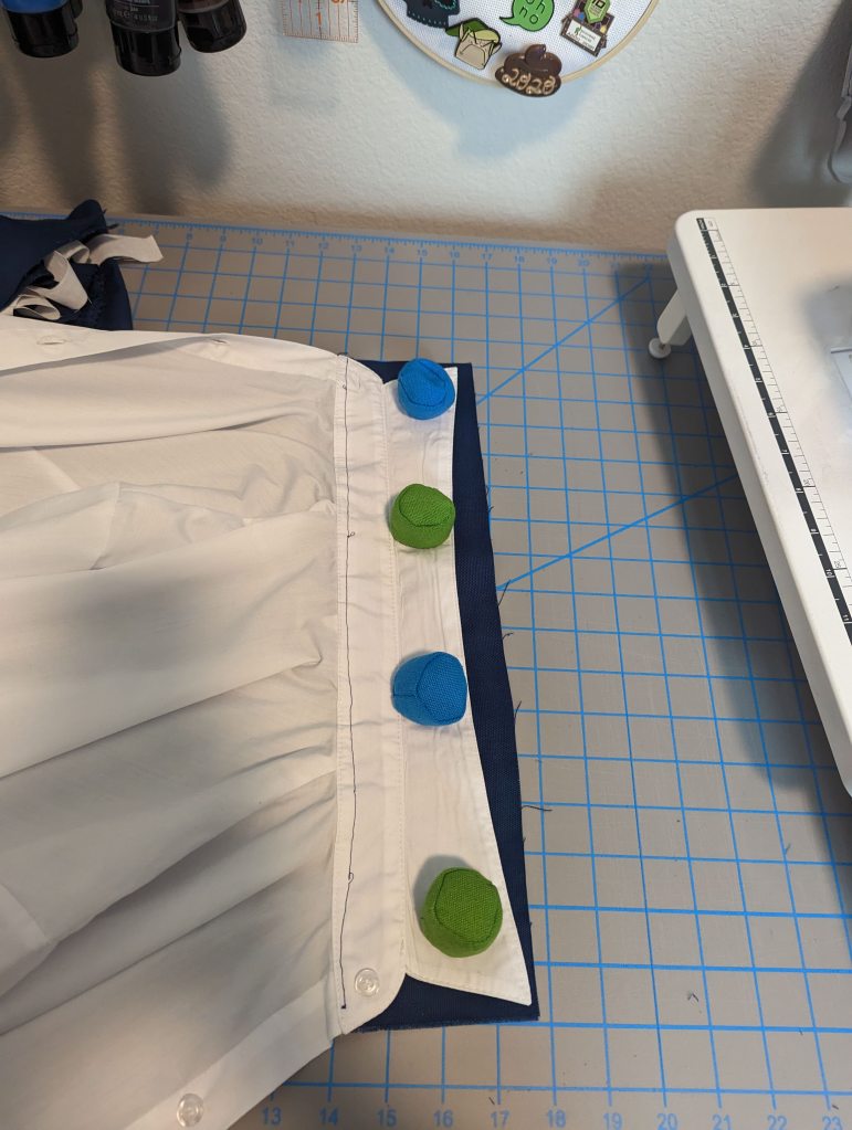 Here’s me using more muslin straps to figure out the placement for the two bottom straps. I really wanted to make sure they were aligned, so I used one strip going down the length of the skirt as a guide line. Then, I used one 2″ strap to serve as the guideline for what would become the trim for the bottom hemline of the skirt. Finally, I used yet another strap to serve as padding between the trim and the bottom-most blue strap. Once all that was determined, I stitched the last two gold buttons in place.