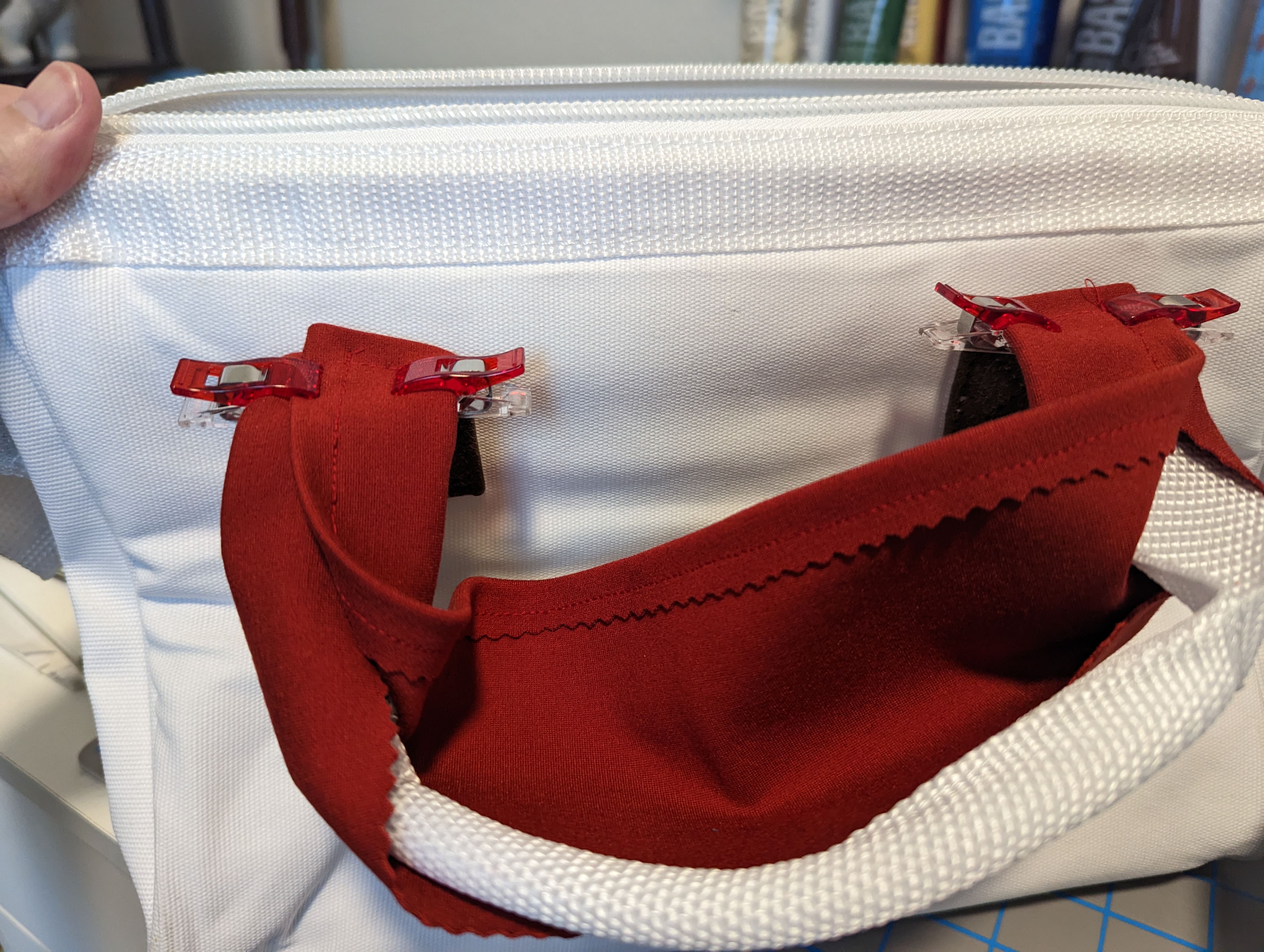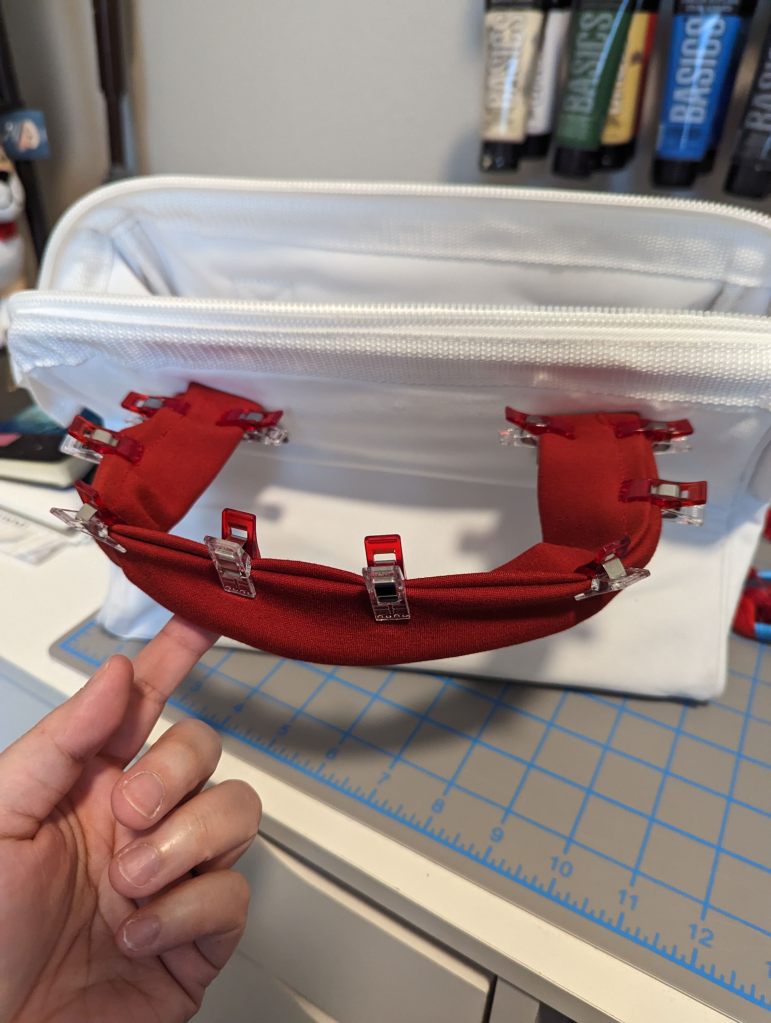 I lucked out by finding this white doctor bag on Amazon. It didn’t have the right straps, but the size and closure was right. Originally, I was going to paint or color over the straps. When that didn’t work, I opted for covering the straps with red fabric.