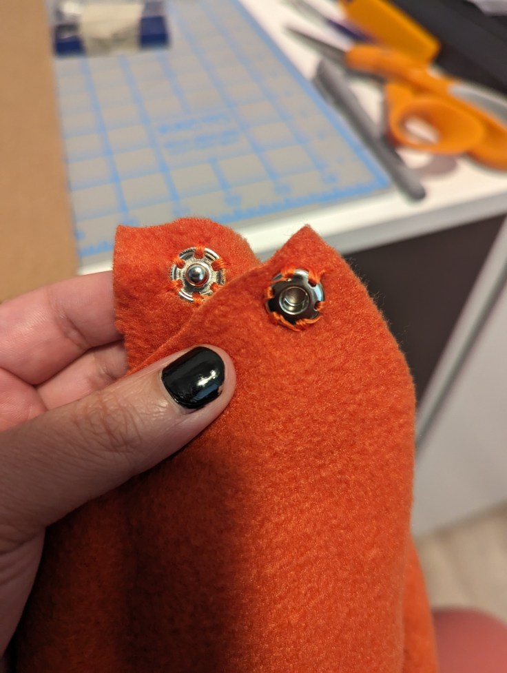 This was super easy. I had some scrap orange fleece so I cut it to the right shape and then stitched on snaps so I can put it on easily.