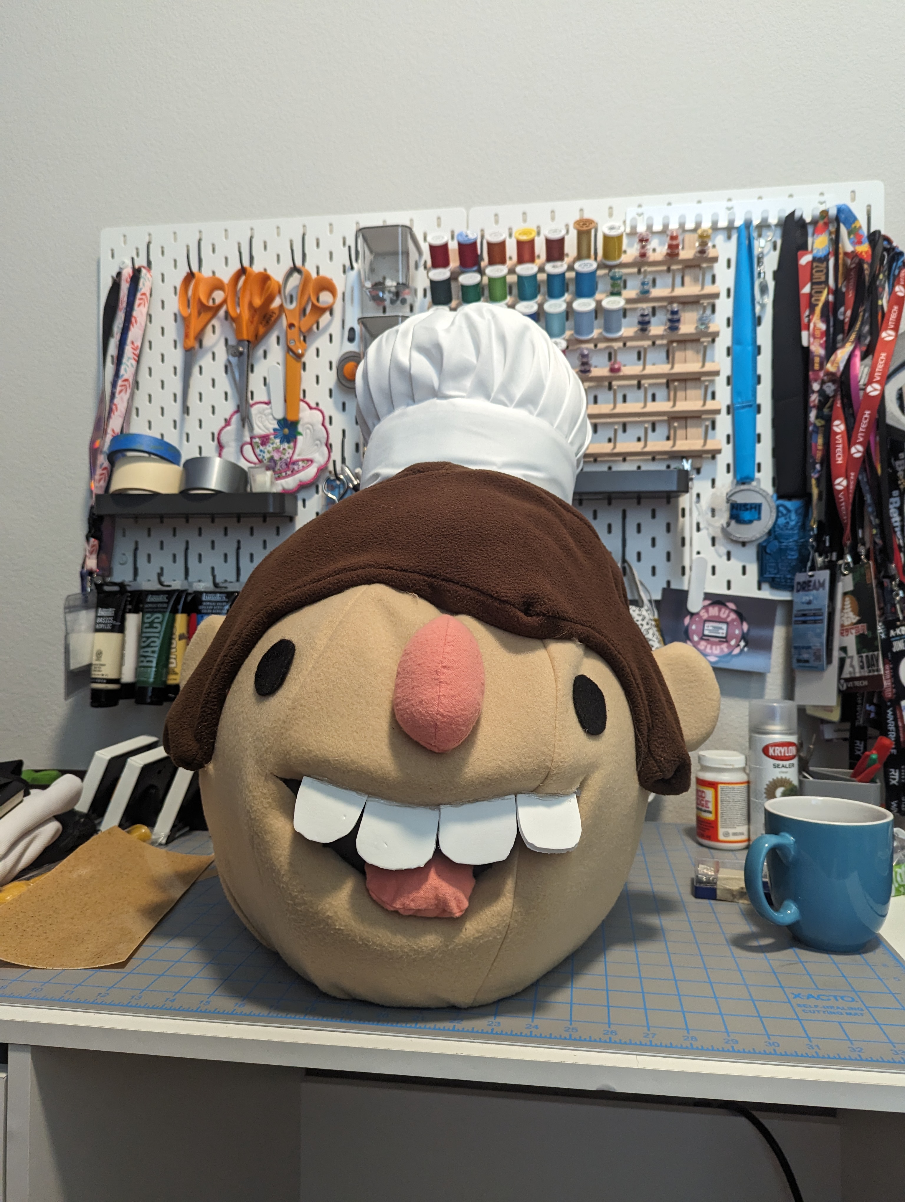 Please join me in bidding adieu to one of my Overcooked Chef mascot heads. My husband and I (as well as my bestie Kasey) had such a blast wearing these cosplays. But now the time has come for it to be harvested for parts. I needed to get to that sweet, sweet soft upholstery foam center.
