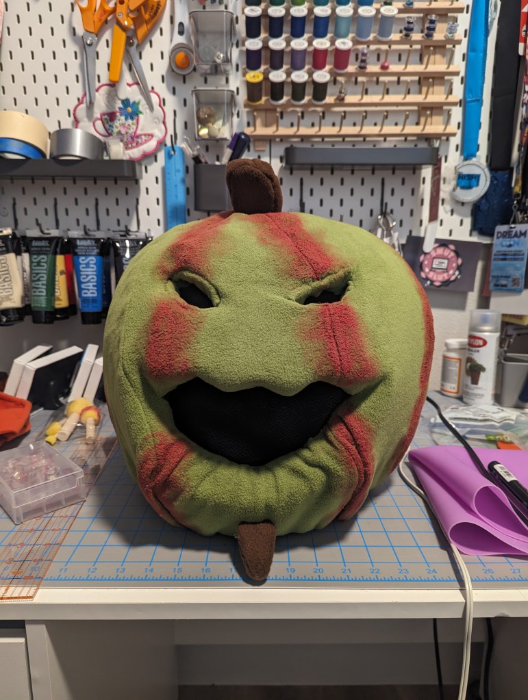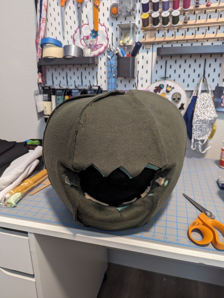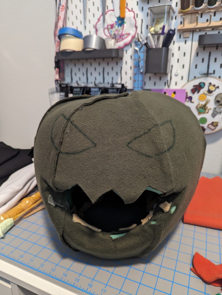 Then, I made a quick pattern for one of the 6 panels. Using that, I stitched together a cover for the head and started cutting into it for the mouth and eye holes.
