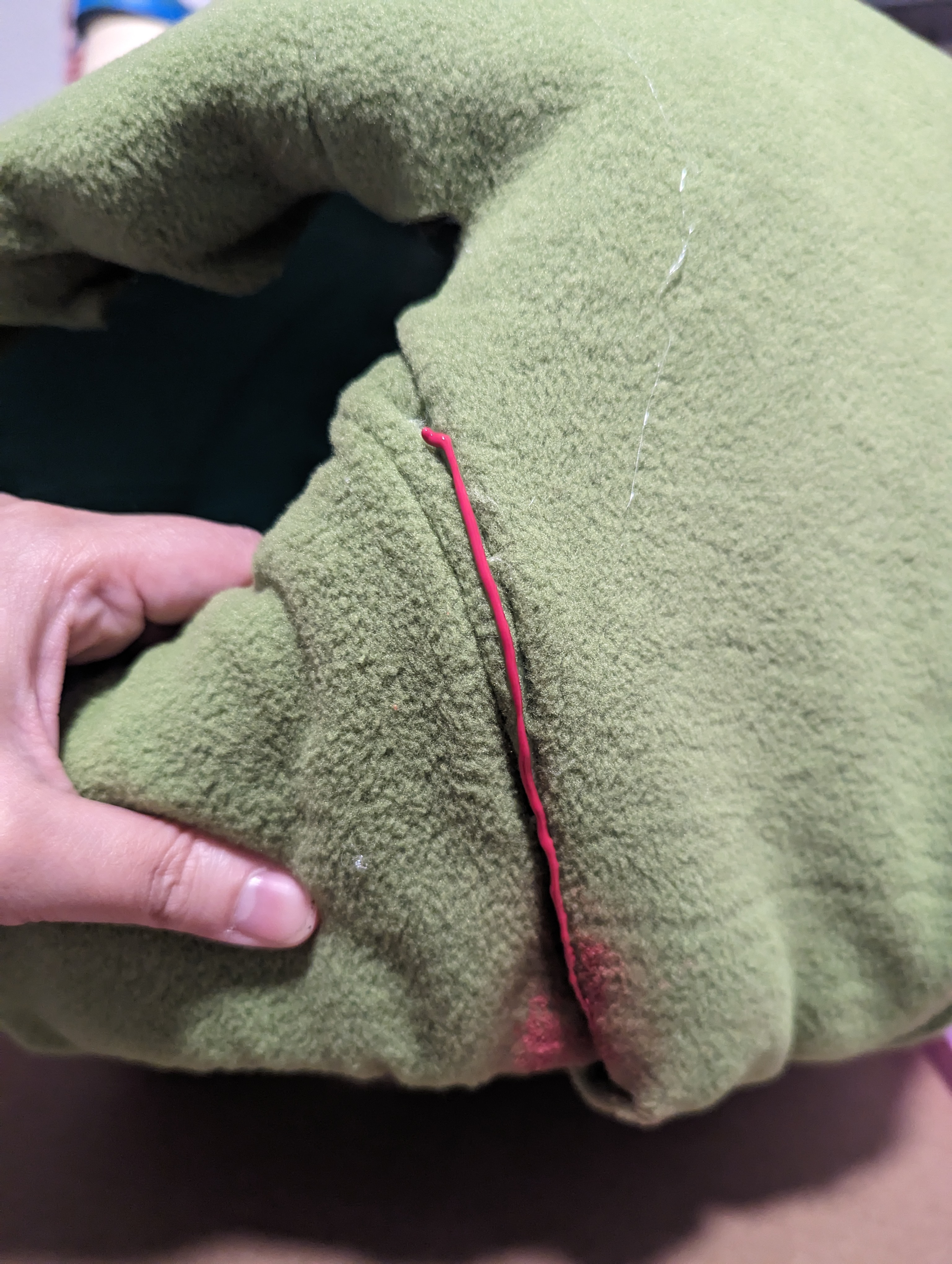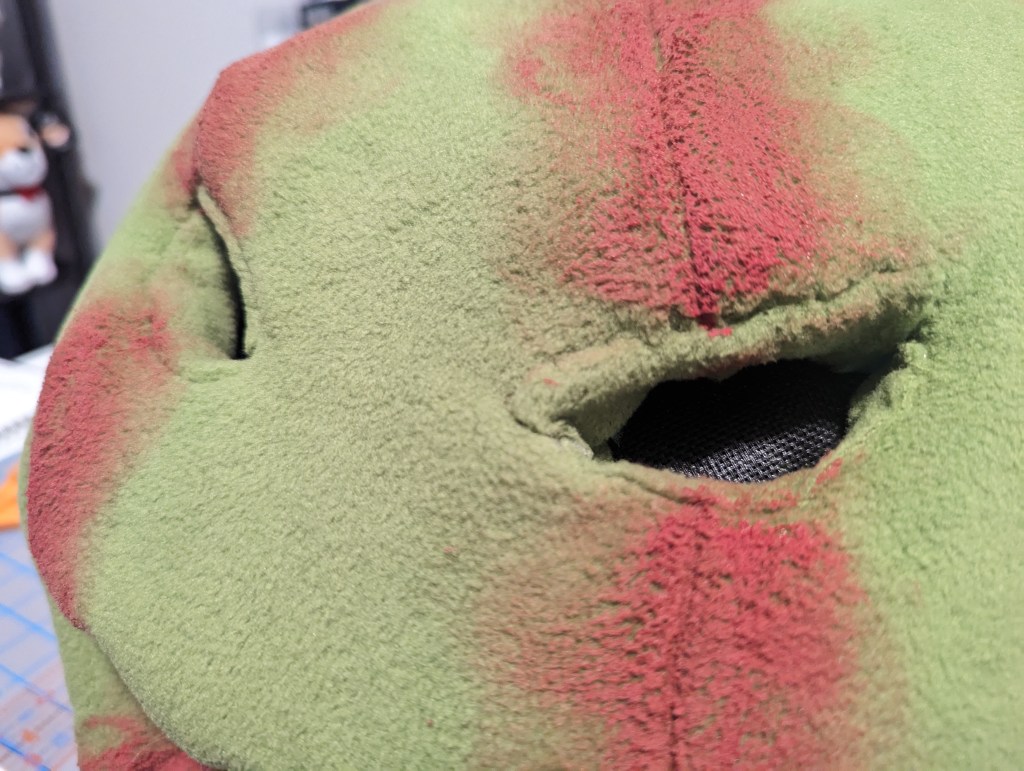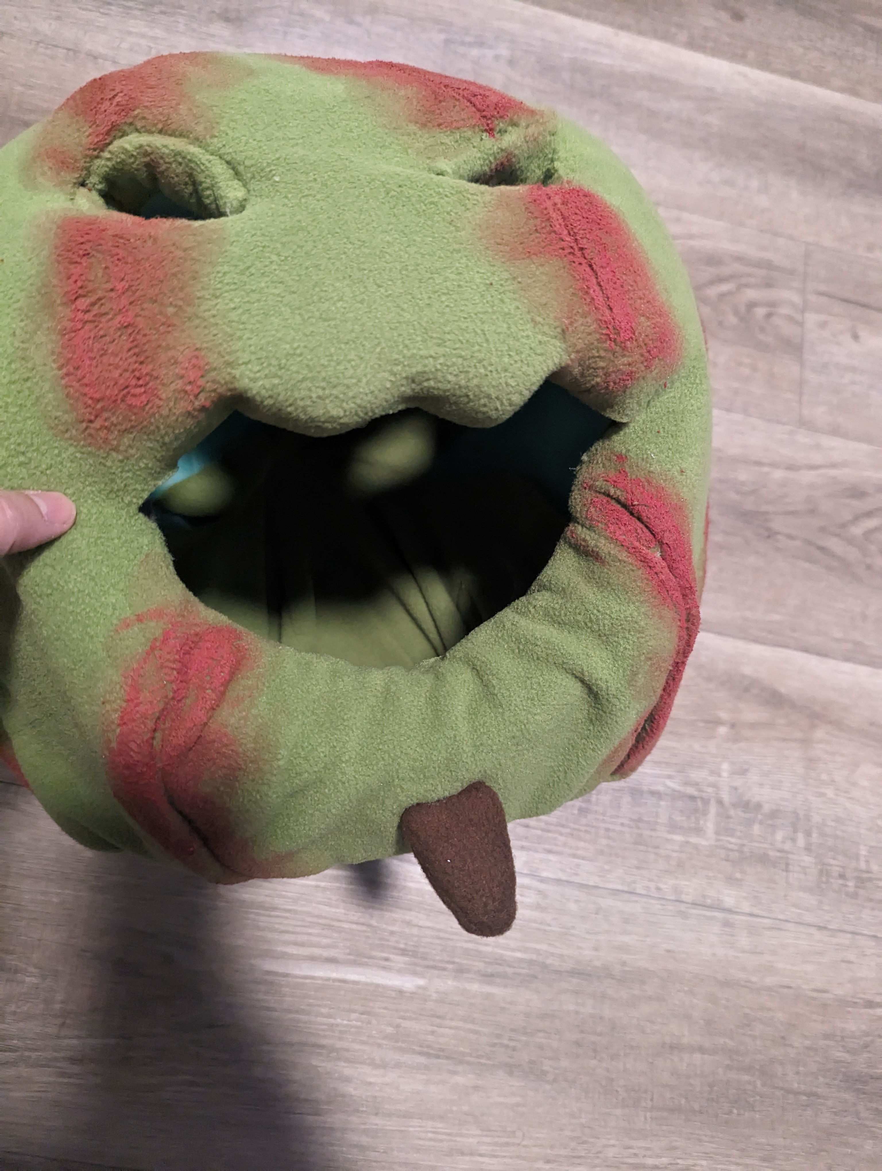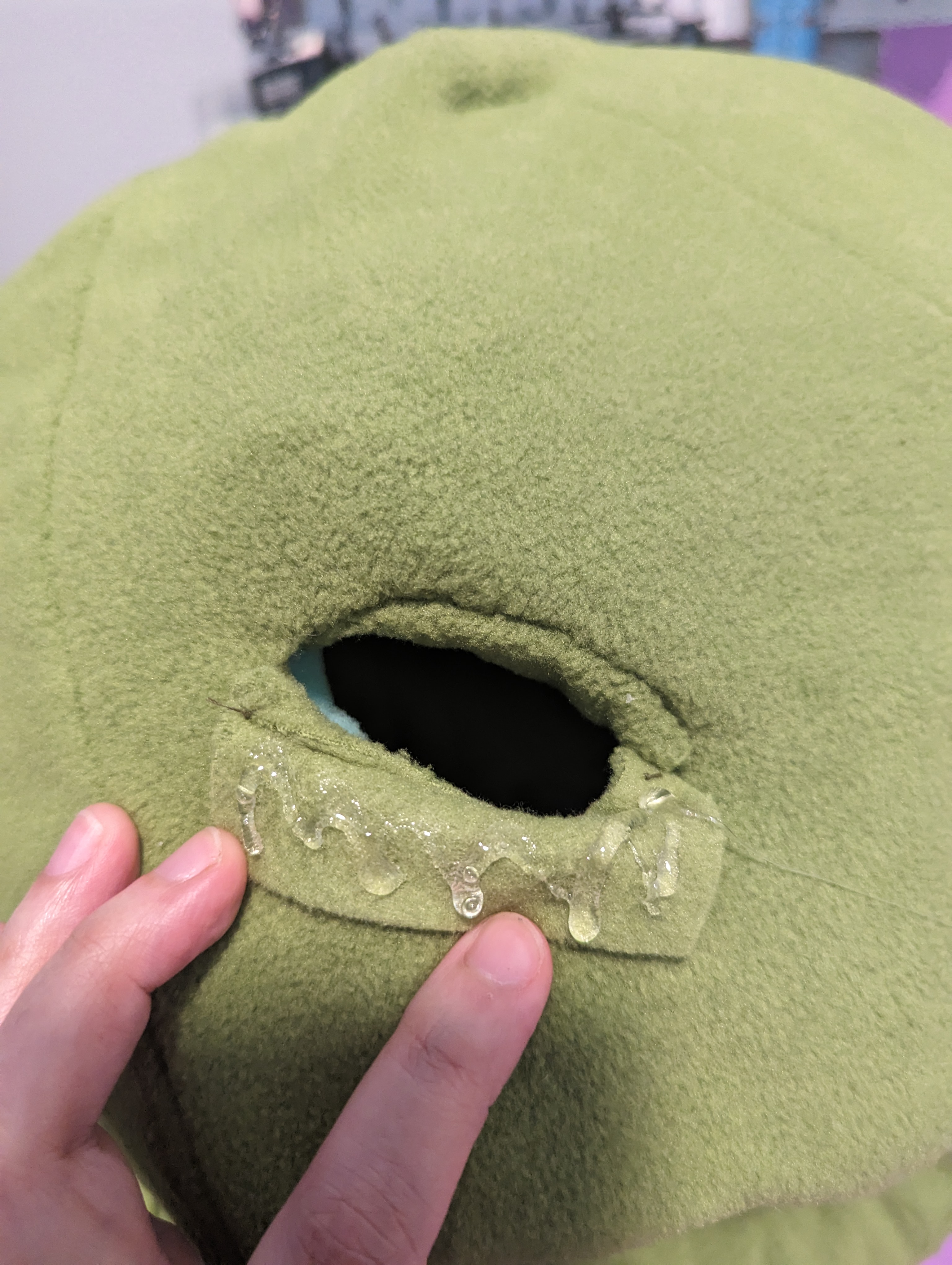The eye holes were less than ideal, so I cut out strips of matching green fleece, hemmed one edge, then ladderstitched and hot glued in place to cover some of the exposed upholstery foam. Once the eye holes were done, it was just a matter of hot gluing the extra fabric edges into the inside of the head.