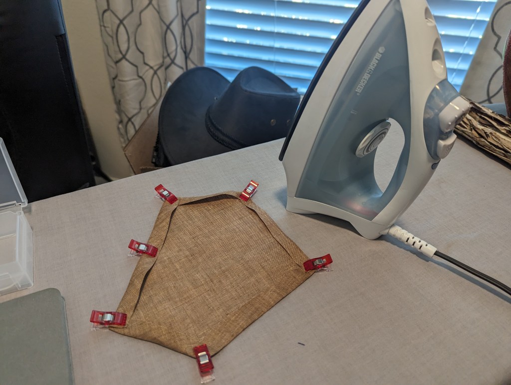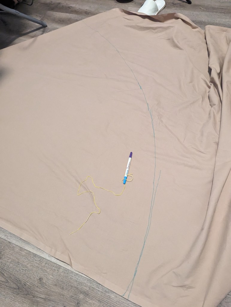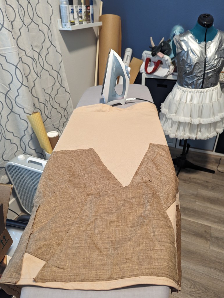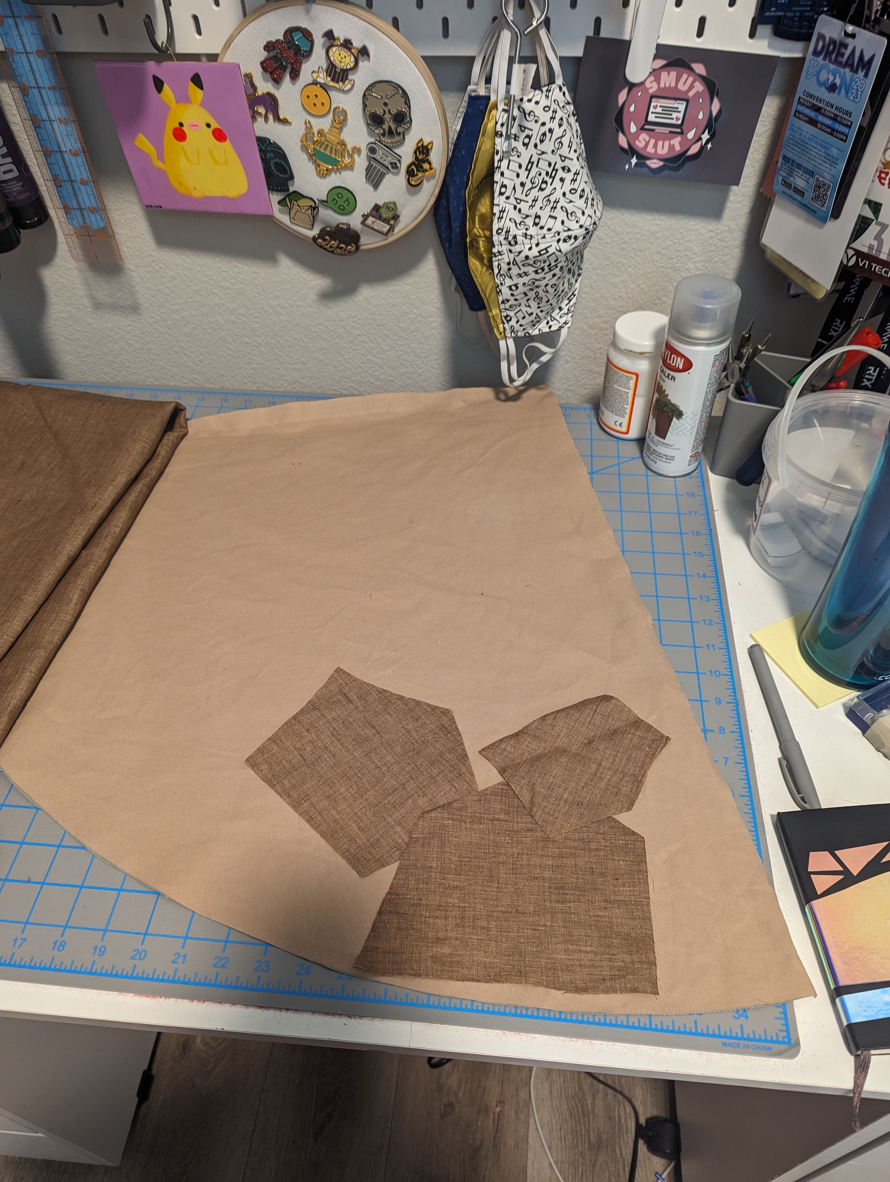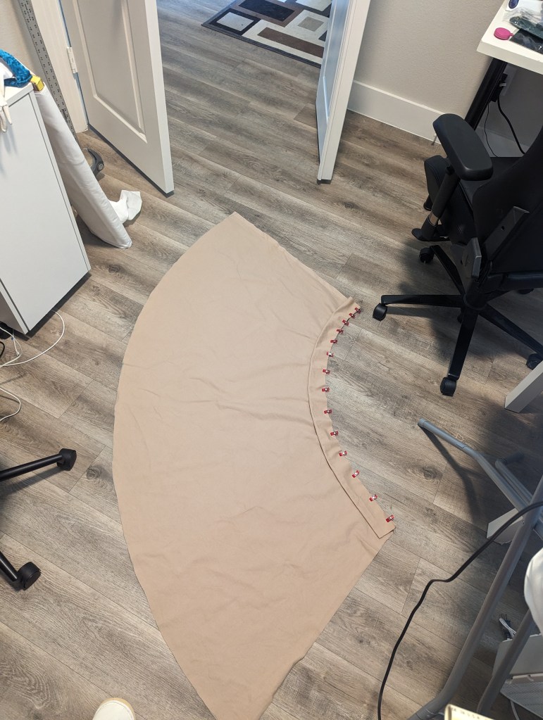 This was a stretch goal. I wanted a skirt to mimic the pile of rocks. Initially, I wanted to use chicken wire and paper mache. But due to time constraints, I opted for fabric instead. I decided to go with a quarter circle skirt so that it had that nice silhouette but wasn’t too bulky. Using this calculator, I got my measurements and cut out my one panel of fabric.