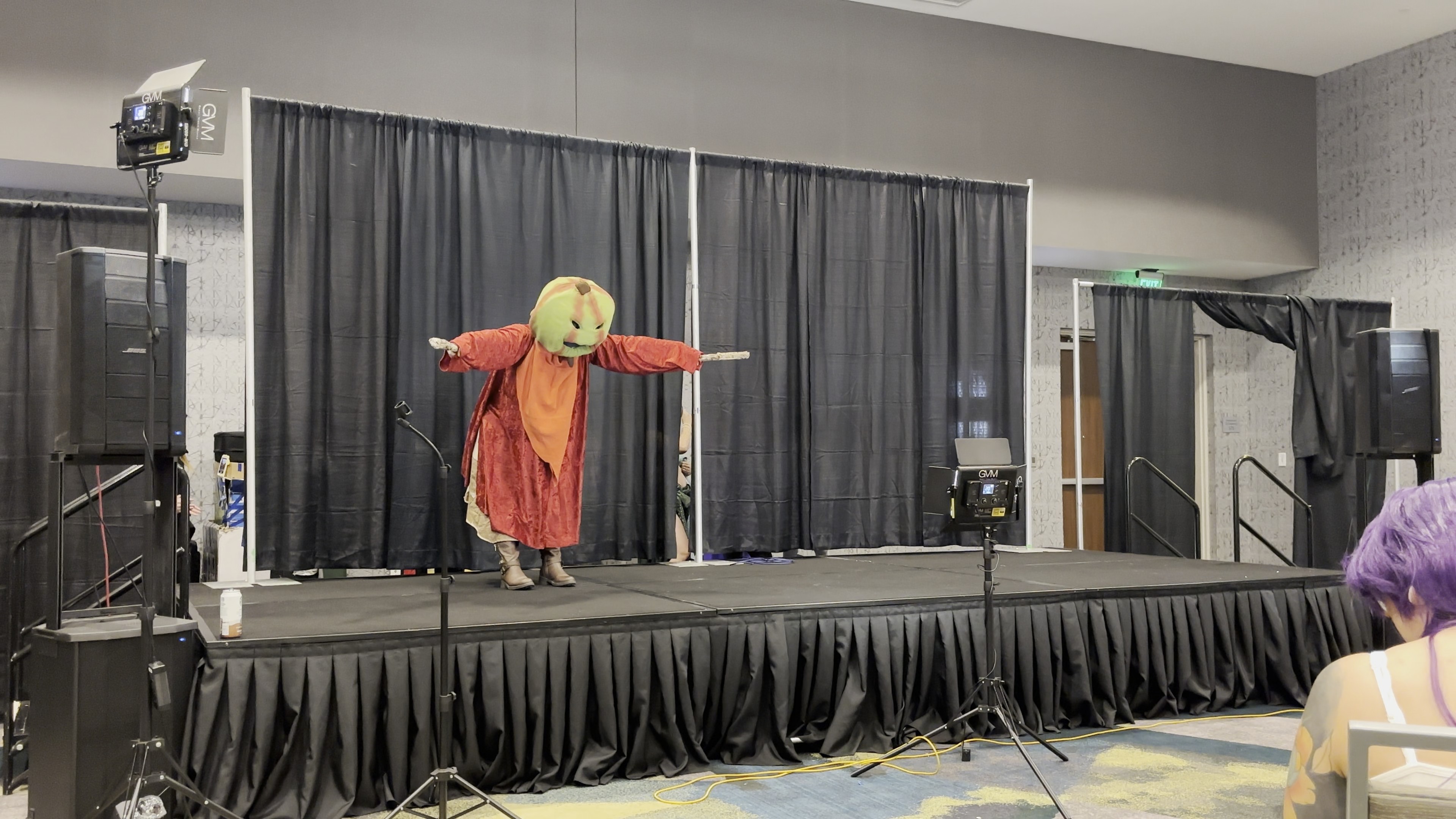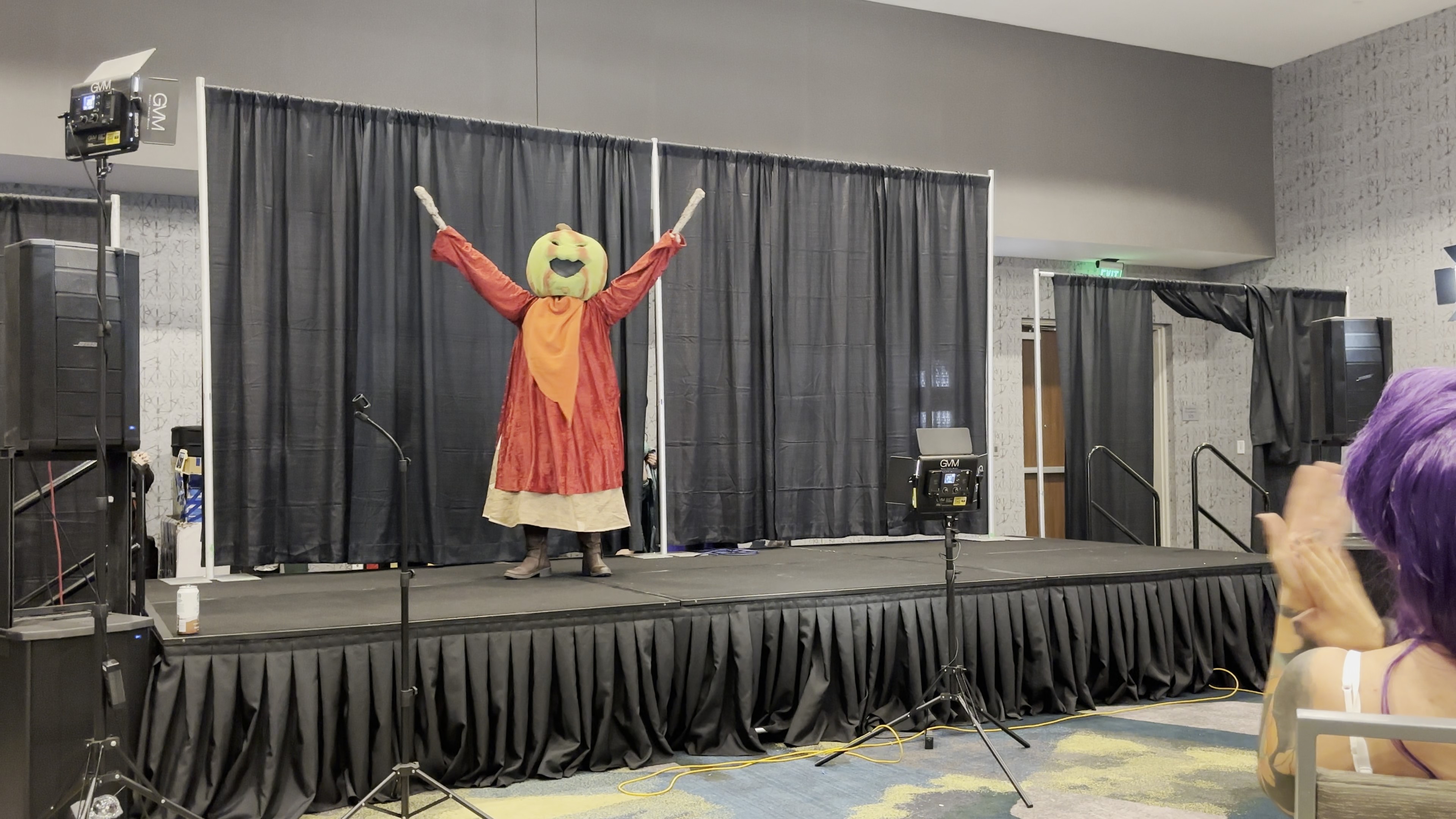 I spoke to the judge’s as quickly as I could, highlighting the reusing of old materials and improvements of techniques (zigzag stitching seams on my old 2019 cape vs french seams for the new 2023 robe). I worked from head to toe, starting with the mascot head, then the scarf, robe, and finally my rock skirt, which is arguably the most unique piece when compared to other Melon Lord cosplayers online. They seemed to really love my clean seams on my robe and the rock texture I incorporated into the skirt and were surprised when I said I had done all the rocks the day before the contest (which was true).