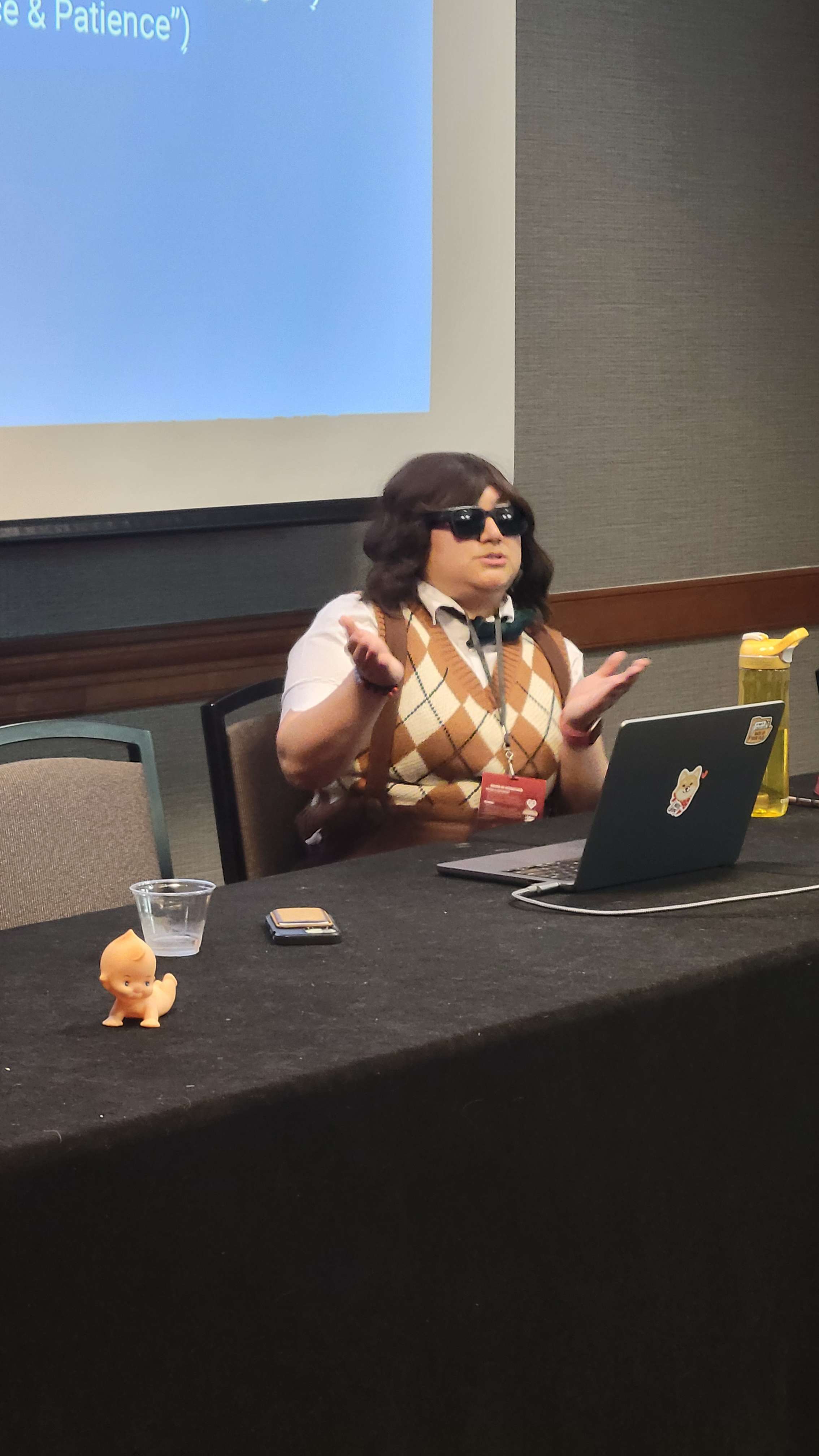 By Sunday, thanks to friends spreading the word and me posting regularly on social media, Chair Lord was a con staple. People were trying to find out how to get badge ribbons, mine included. And yet, by Sunday, all my cosplay department duties were met—I was going to just be me again. No black outfit, no Chair Lord, in fact I’d be cosplaying Blathers from Animal Crossing. And not only that, I’d be giving my presentation as Silcoitus.