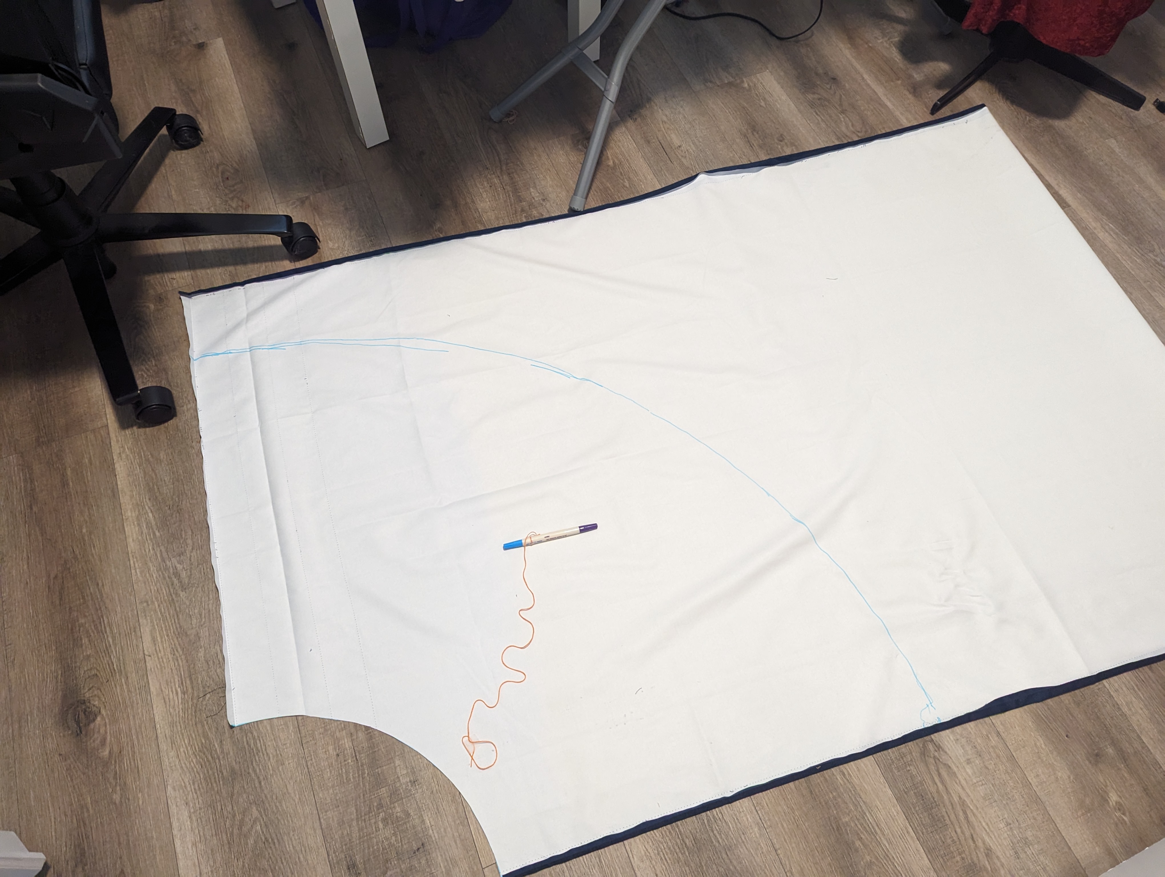I figured out an easy way to trace the curves for the circle skirt involving a length of embroidery floss, some scotch tape, a water soluble fabric pen, and a cup filled with weights. Was it pleasant on my back while I crouched on the floor to trace it out? Not in the slightest. But was it fast? Kind of.