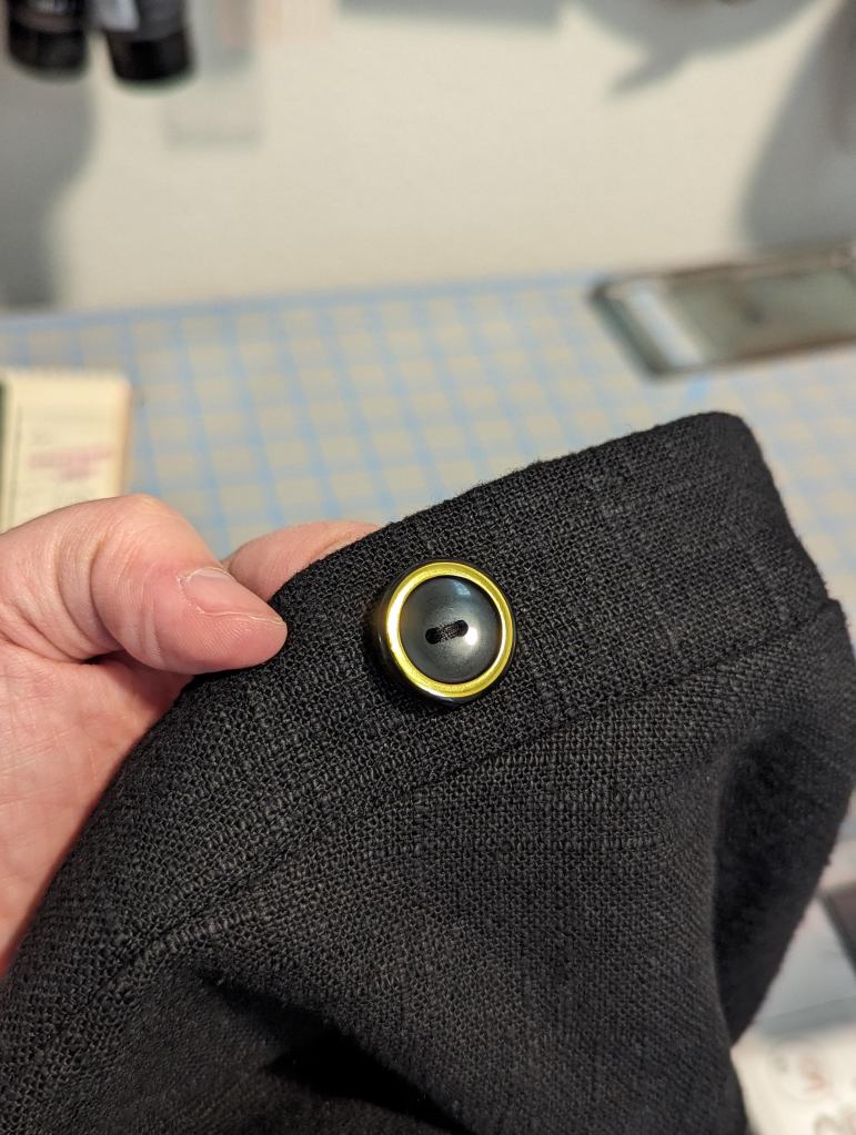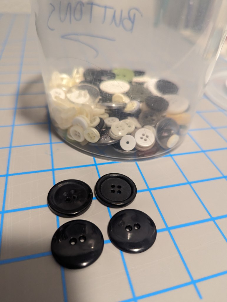 After marking where the suspender ends had sat on the waistband of my skirt, I scoured my little bucket of buttons to see if I could find four that matched. I managed to find two black ones from a set and then two other black ones that were close enough. I designated the matching ones to the front and then used the others for the back, decided that the back buttons would go on the inside of the waistband rather than outside to hide the long strap tails.