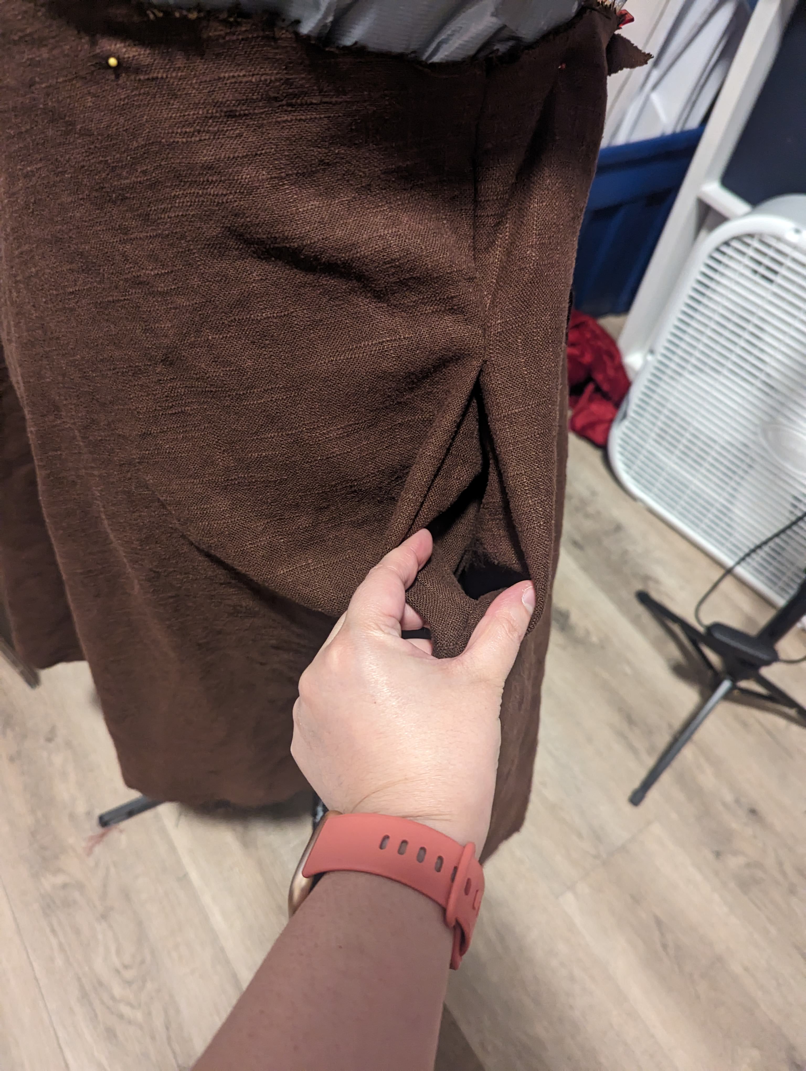 Knowing I would be making multiple of these, I made a muslin pattern, taking much better care with the dimensions this time. Spoiler alert, but it would take me three times to really nail down that pocket pattern. The navy pockets were too shallow while the brown ones would have too narrow of an opening due to the bulk from using French seams (an ill-advised strategy for fabric this thick). It wasn’t until the black skirt that I really perfected the pocket size.