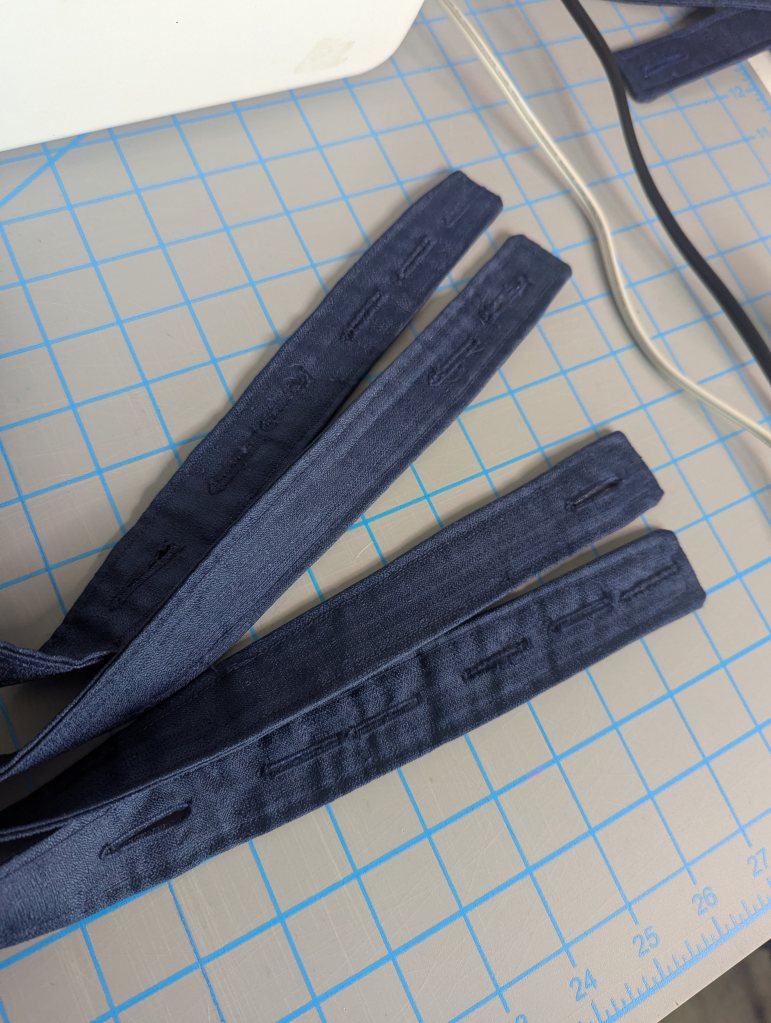 Buttons attached, I recreated the straps from the navy set, this time making the strap length exact rather than messing with multiple buttonholes on the back. After some wearing, I added another strap that goes across the back to keep the straps from falling down. It doesn’t lay perfectly against my back and I’m sure that if I tweaked the size/shape of that strap, I could get it to. But at this moment, I don’t care enough to do that.